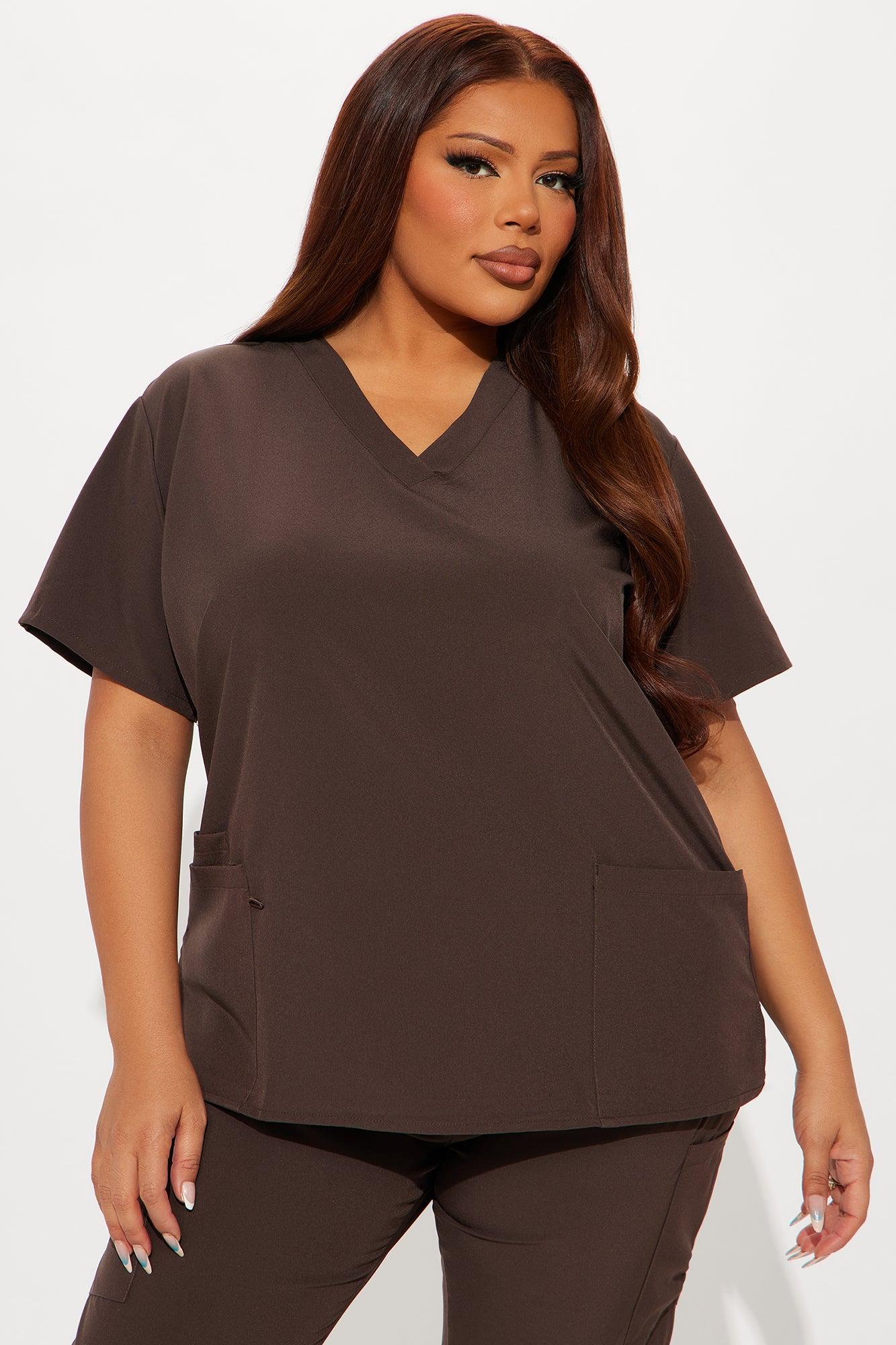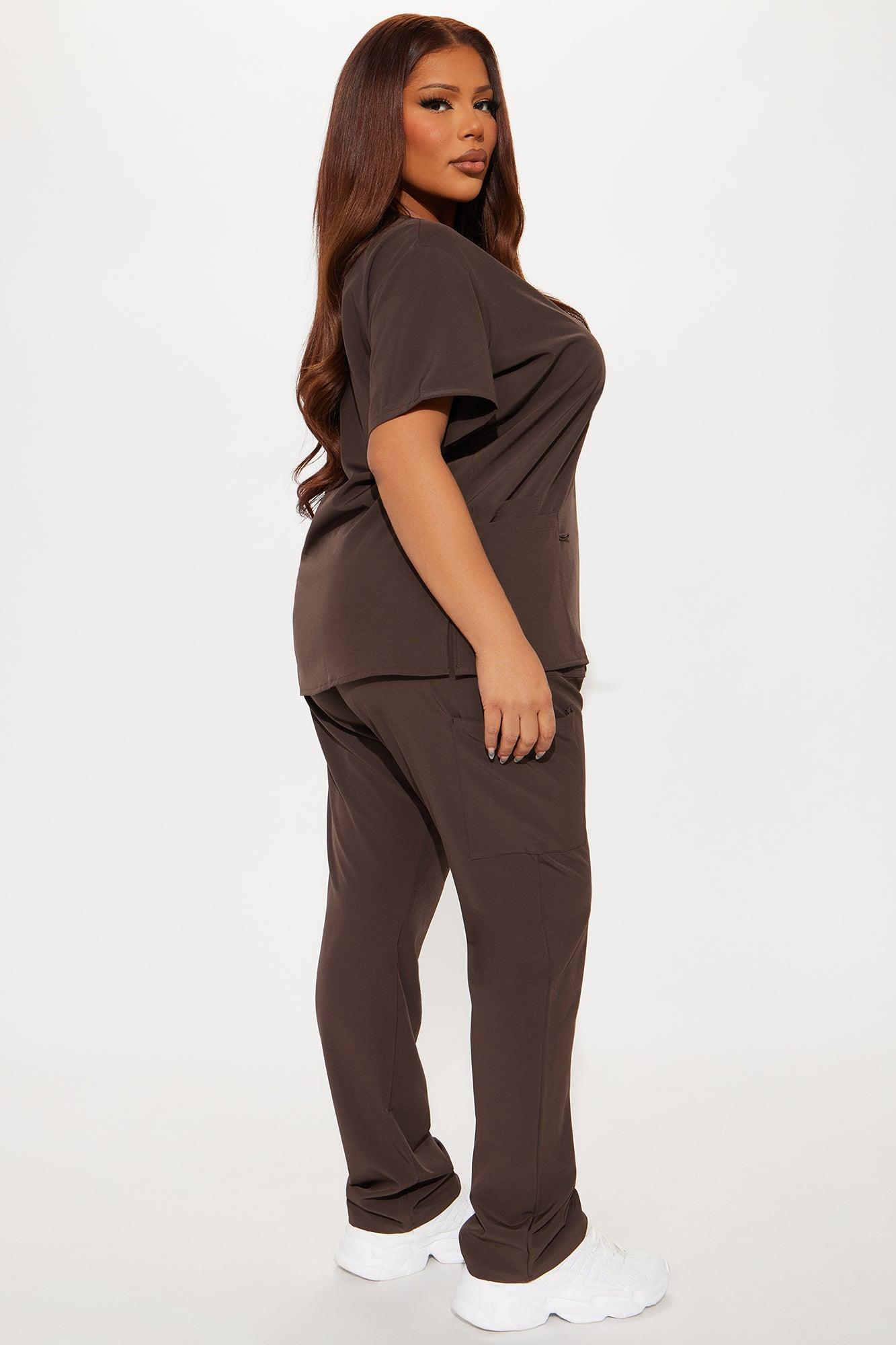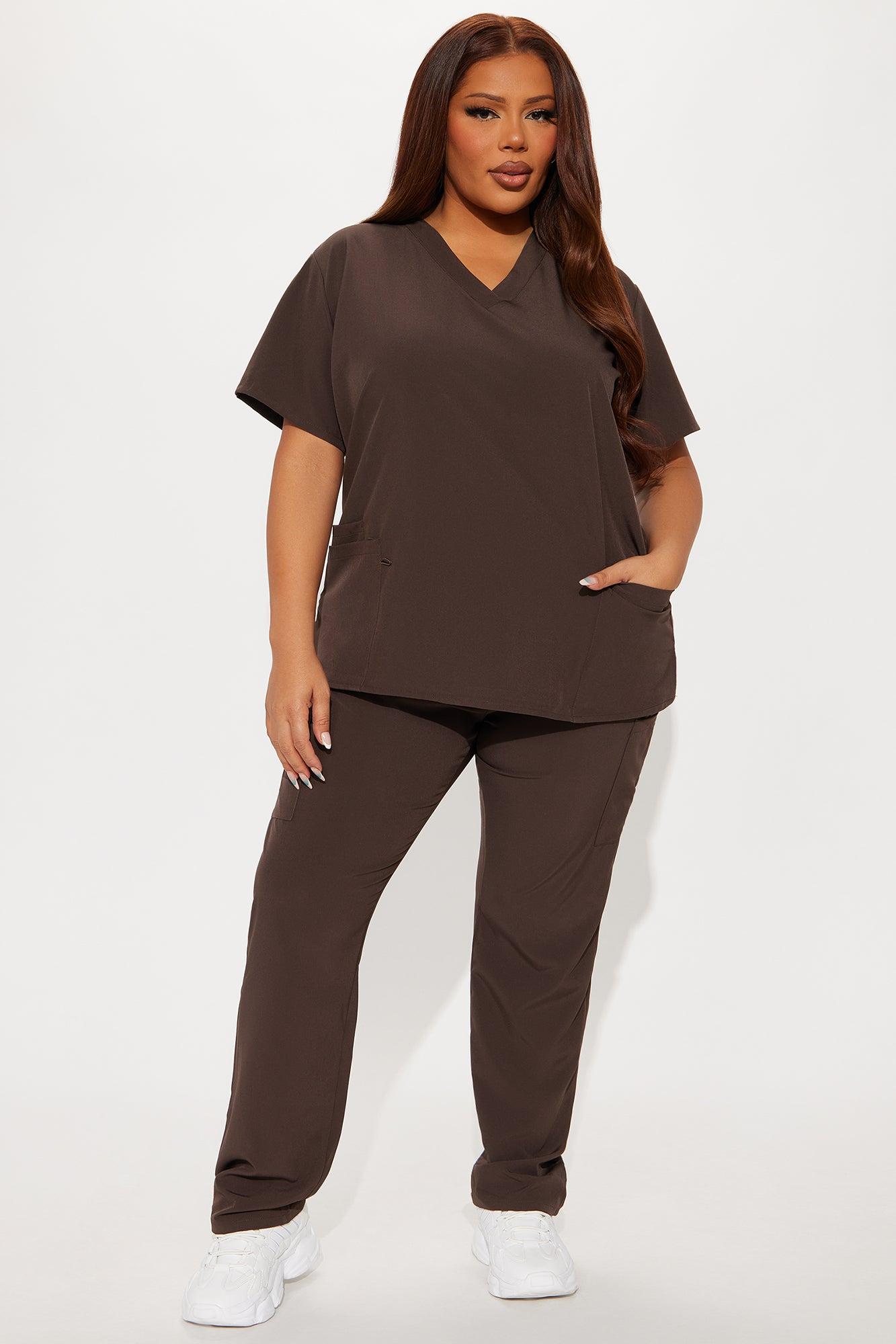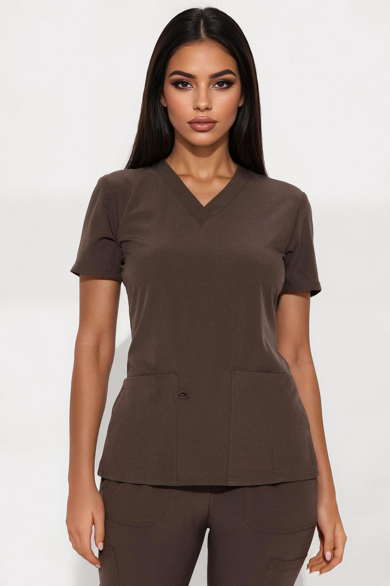 Available In Dark Brown. Uniform Scrub Set Short Sleeve Top V-Neck Three Front Pockets Side Slit Matching Pants Elastic Waistband Drawstring Front and Side Pockets 93% Polyester 7% Spandex Imported California Proposition 65WARNING: Cancer and Reproductive Harm - www.P65Warnings.ca.gov.