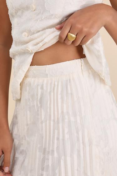 Attract a compliment or two with this elegant two-piece dress that boasts a sweet burnout floral design throughout the twirl-worthy design. Wide straps support the fitted top that boasts a decorative button placket and a front slit that complements the matching, high-rise midi skirt with a chic pleated design. Skirt has a hidden side zipper/clasp.