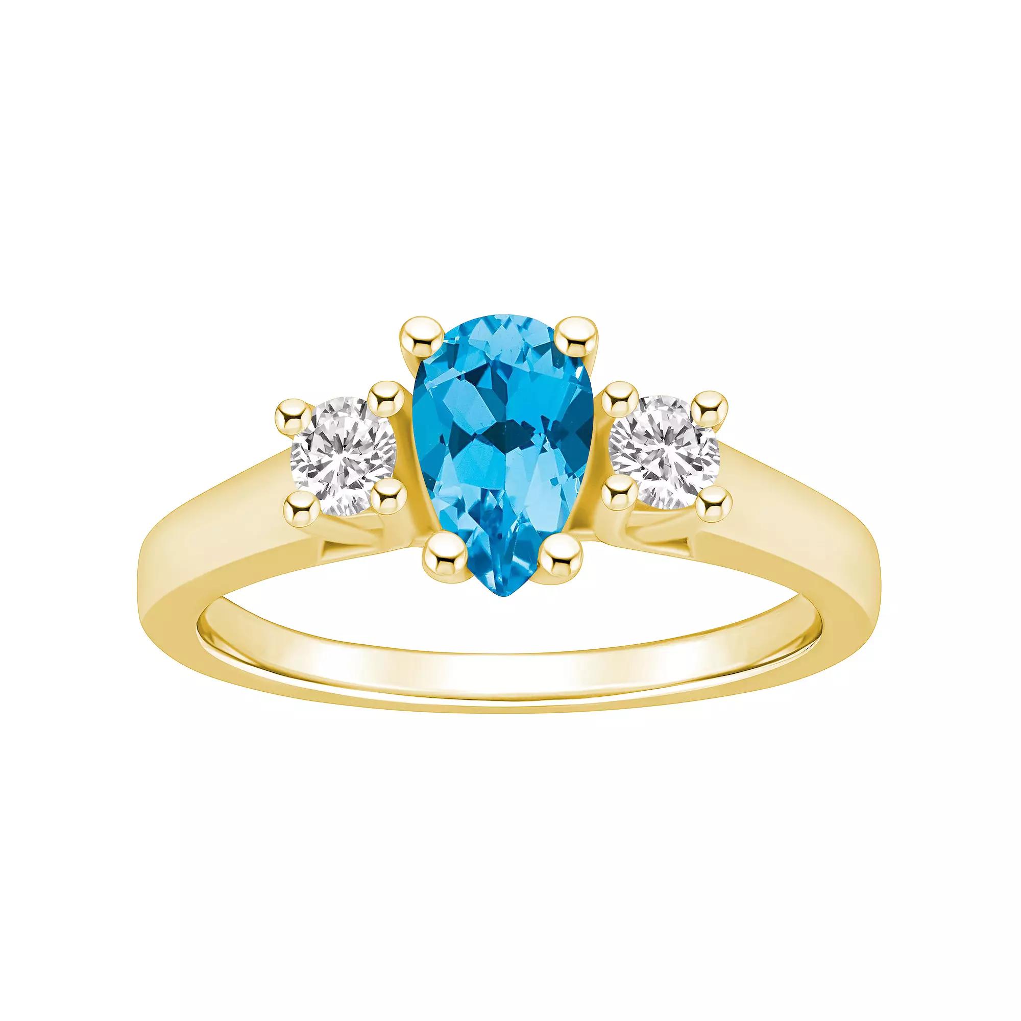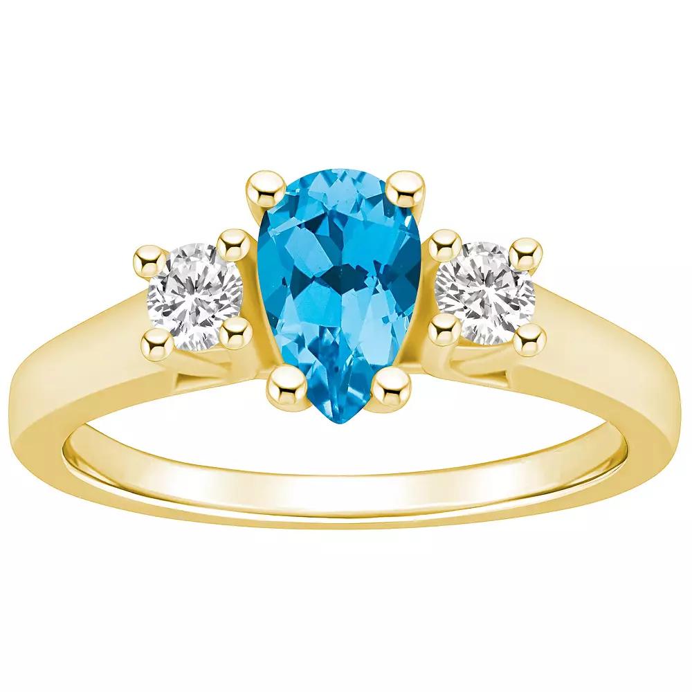 Featuring a pear-cut blue topaz center stone accented by a duo of shimmering diamonds, this 14k gold Alyson Layne ring complements your look beautifully. Featuring a pear-cut blue topaz center stone accented by a duo of shimmering diamonds, this 14k gold Alyson Layne ring complements your look beautifully. Metal: 14k gold Packaging: boxed Width: 1/2 in. Finish: polishedSTONE DETAILS Stone type: blue topaz Total weight: 1 1/4 ct. Center stone weight: 1 ct. Center stone size: 8 mm x 5 mm Shape: pear Setting: prongDIAMOND DETAILS Total weight: 1/4 ct. Shape: round brilliant Setting: prong Gemstones may have been treated to enhance their appearance. Special care may be required. Please visit our Gemstone Treatment & Special Care Guide for more information. Image(s) may be enlarged to show detail. Please note, due to the high value of this item, a signature may be required upon delivery. Gender: female. Age Group: adult.