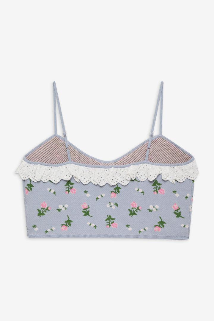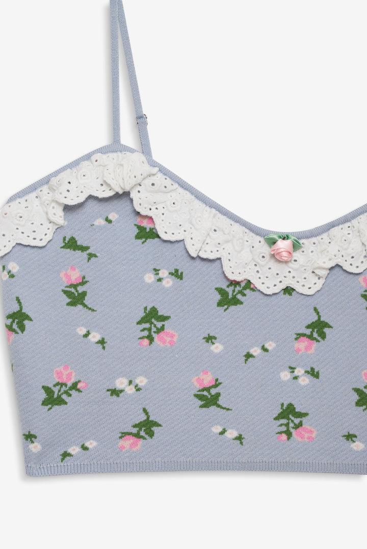 Featuring a charming "Rosey Posey" design, the Amalia blue knit crop top is designed for the modern dreamer. This knitted crop top is decorated with decorative rosettes at the straps and contrast eyelet trims ruffled along the front and back necklines. Style it with the Amalia Knit Cardigan for a matching twinset.