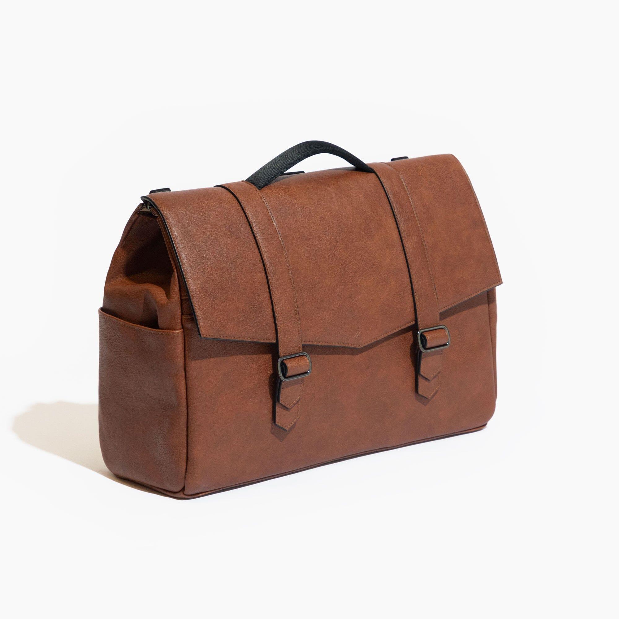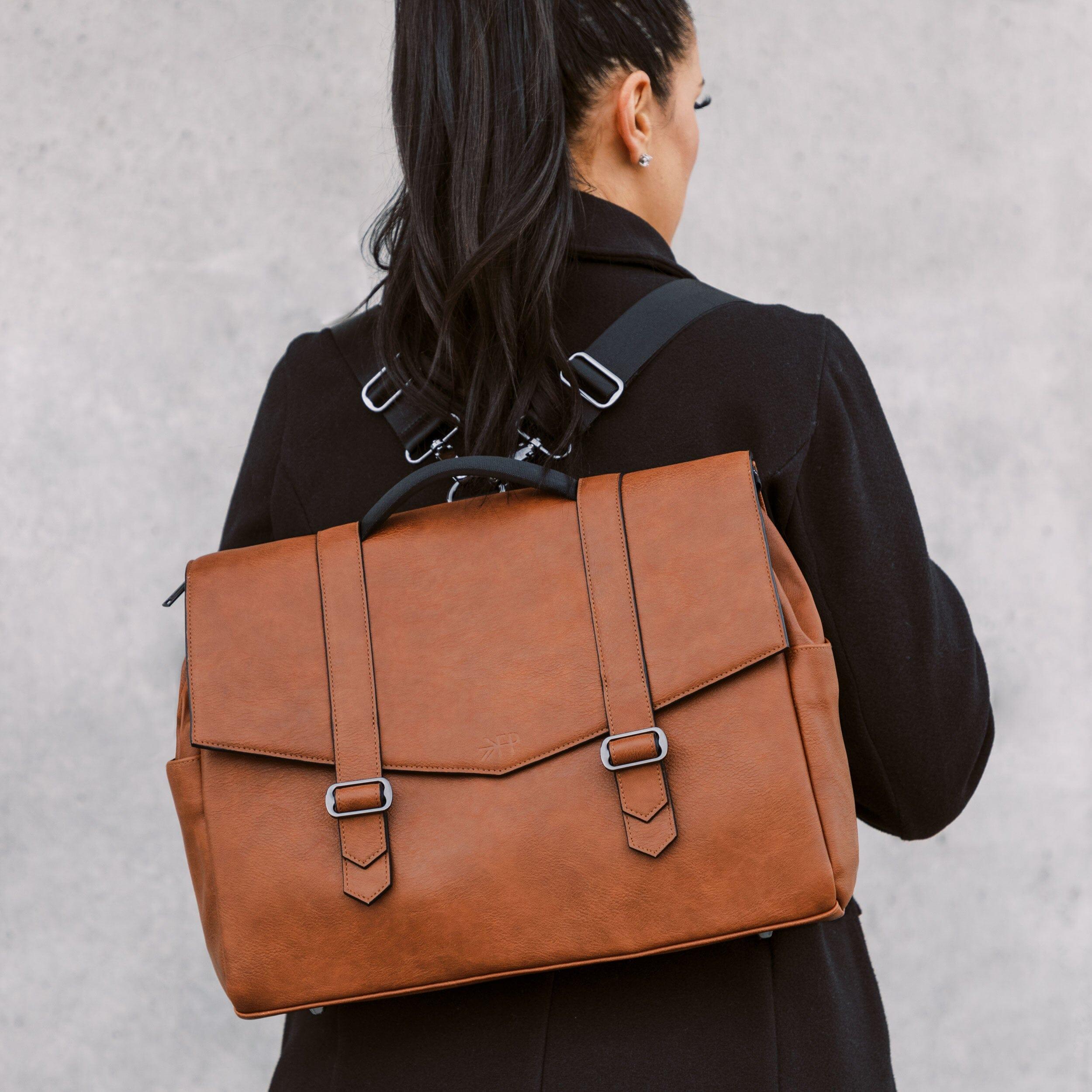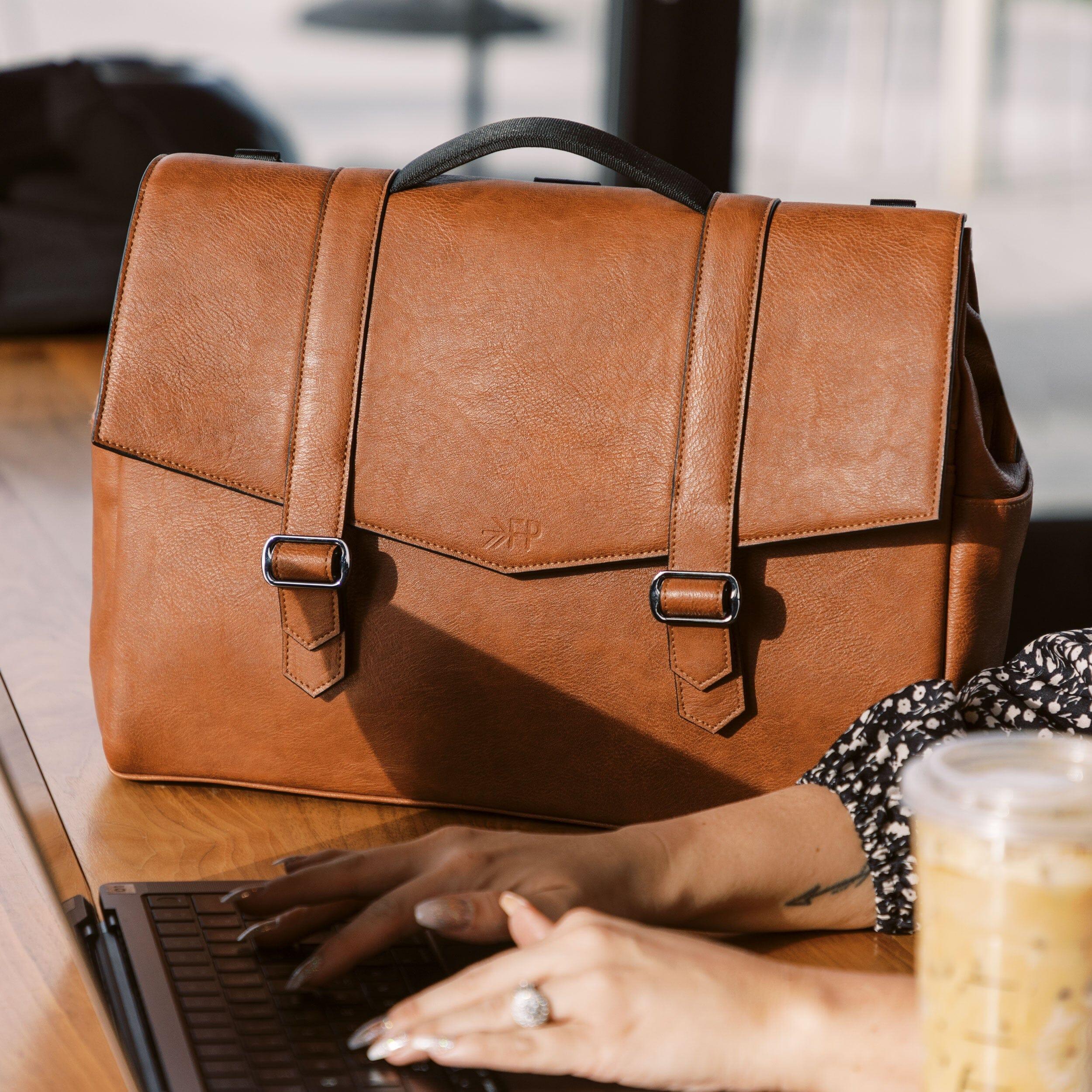 Details Designed with professionals in mind, the Cambridge Messenger Bag was made for everyone! Whether you want to upgrade your day-to-day bag for the office, or want to dress to impress on your next business trip, we've got you covered. Features Made with premium quality materials and luxe hardware Magnetic front straps for easy close without zipping Premium quality zipper for main compartment opening Wearable 3 ways: backpack, cross-body, or shoulder bag Padded top handle for briefcase carry Metal feet on bottom so bag never touches the ground Ten pockets with spacious central space for large items 5 interior pockets including 1 mesh, 1 insulated, and padded laptop sleeve (Fits up to 17" laptop) 1 hidden phone pocket under front flap Front zipper pocket with 3 pen holders, card slots, and key clip Magnetic closure on exterior side pockets Materials Premium quality vegan leather 100% wipeable and spill resistant interior and exterior Wipeable and stain-resistant nylon interior lining Premium YKK zippers Gunmetal hardware Debossed FP Logo Black accent details Dimensions 15.5" wide x 11.25" high x 5.75" deep 2 adjustable straps with measurements 23" - 43.5" 1" top handle drop 2 lbs weight