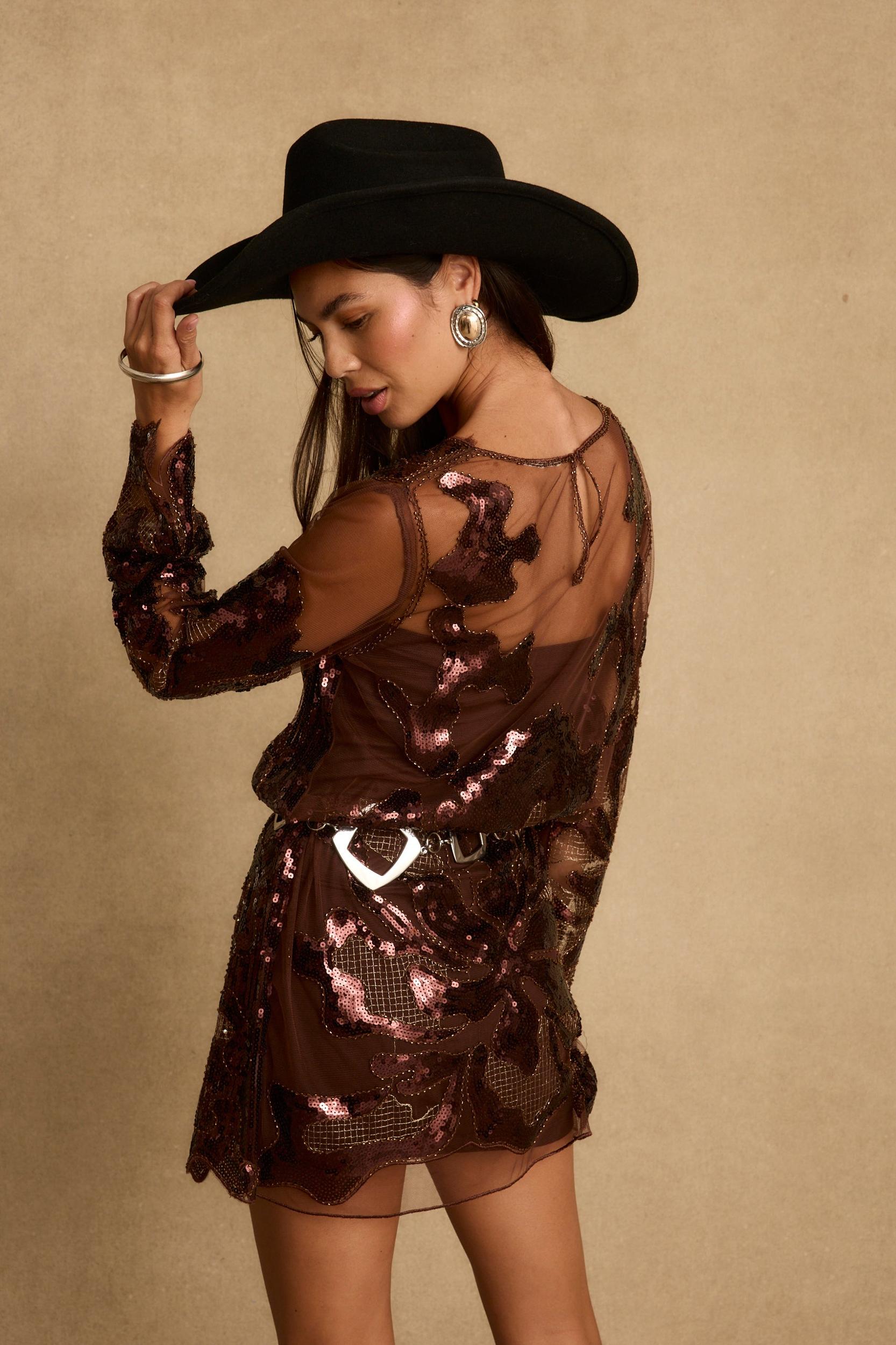 You loved the Amber Nights Black Beaded dress so much, we created a holiday ready color way in a cinnamon rust color. The perfect RSVP-yes dress, the Amber Nights features a sheer long sleeve mini with sequin detailing all over. Style it with the Norma Brown Strapless Under Dress if you are looking for more coverage.