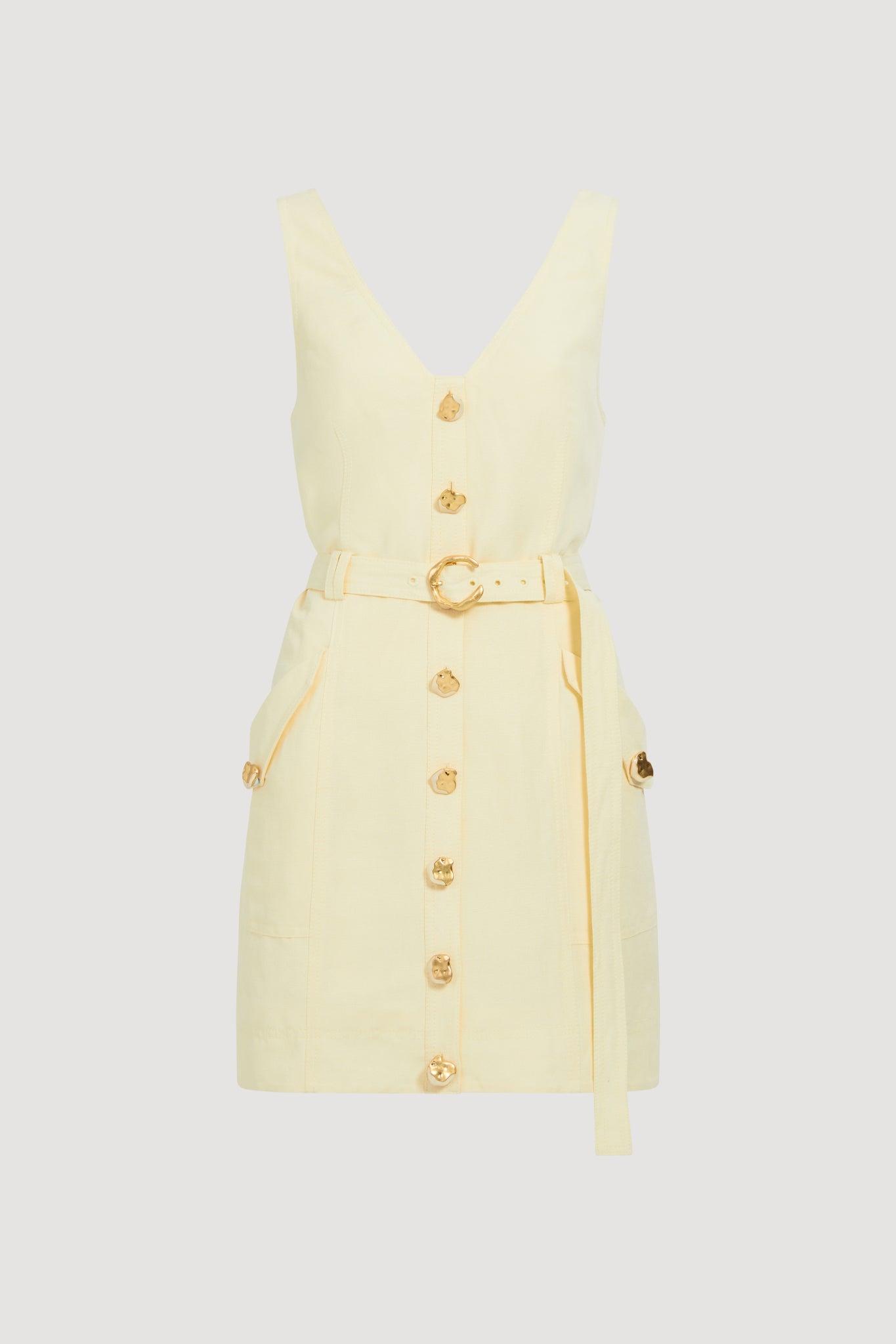 PRODUCT DETAILS Women's mini dress V-neckline Centre front placket with gold sculptural buttons Twin belt loops Angled pocket detail Detachable belt with organic buckle Zip, hook and eye closure Lined style 55% Linen, 45% Rayon Shop All Dresses SIZE AND FIT Model wears a size AU 8/S