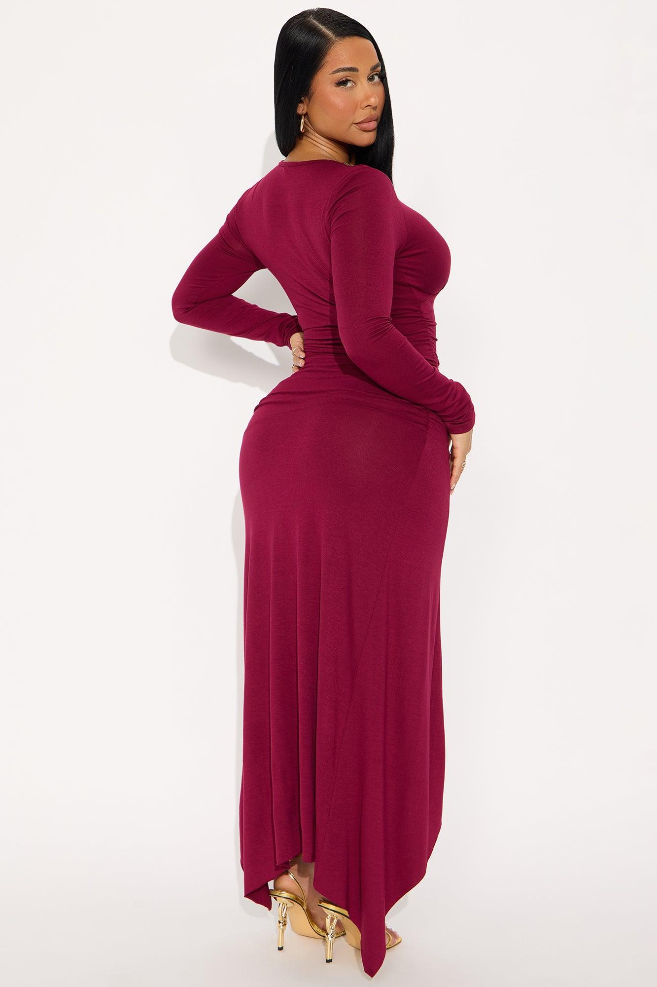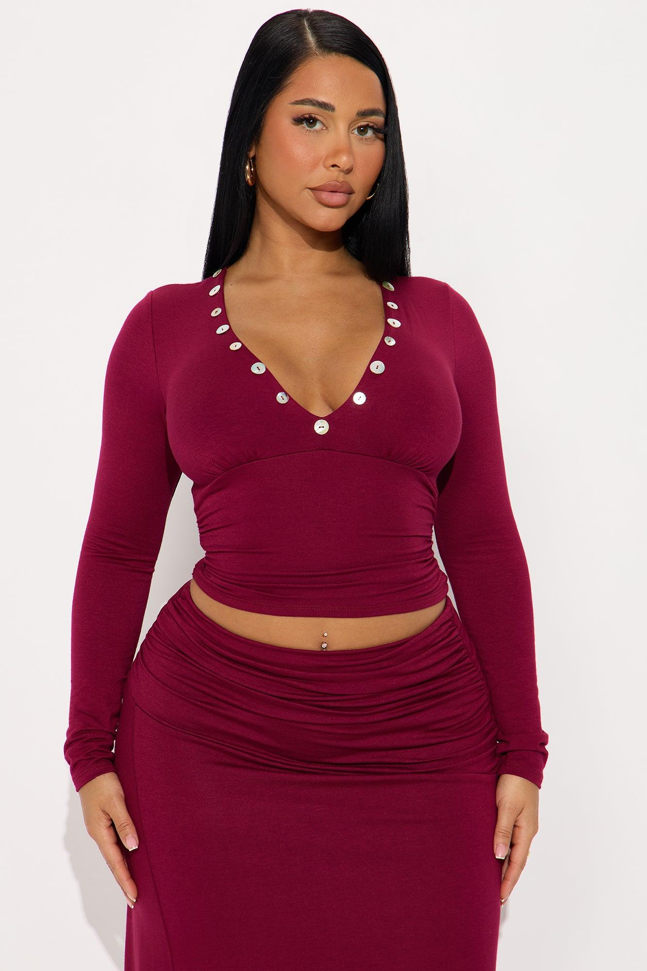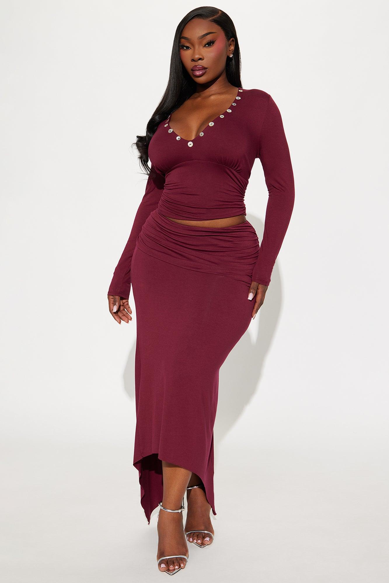 Available In Wine. 2 Piece Ensemble Top And Skirt Set Stretch Long Sleeve Ruched Midi Skirt Self: 95 Rayon 5% Spandex Imported