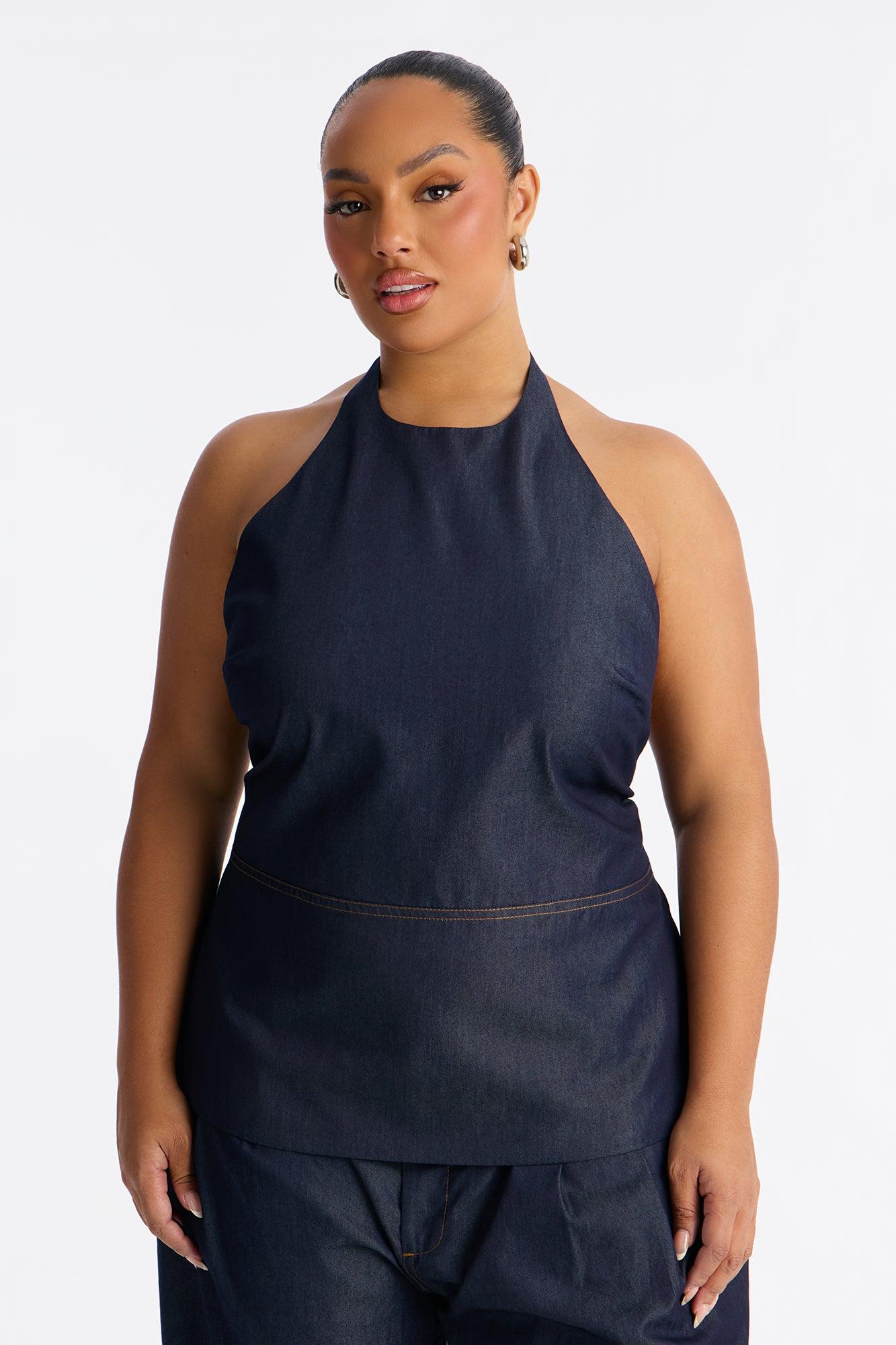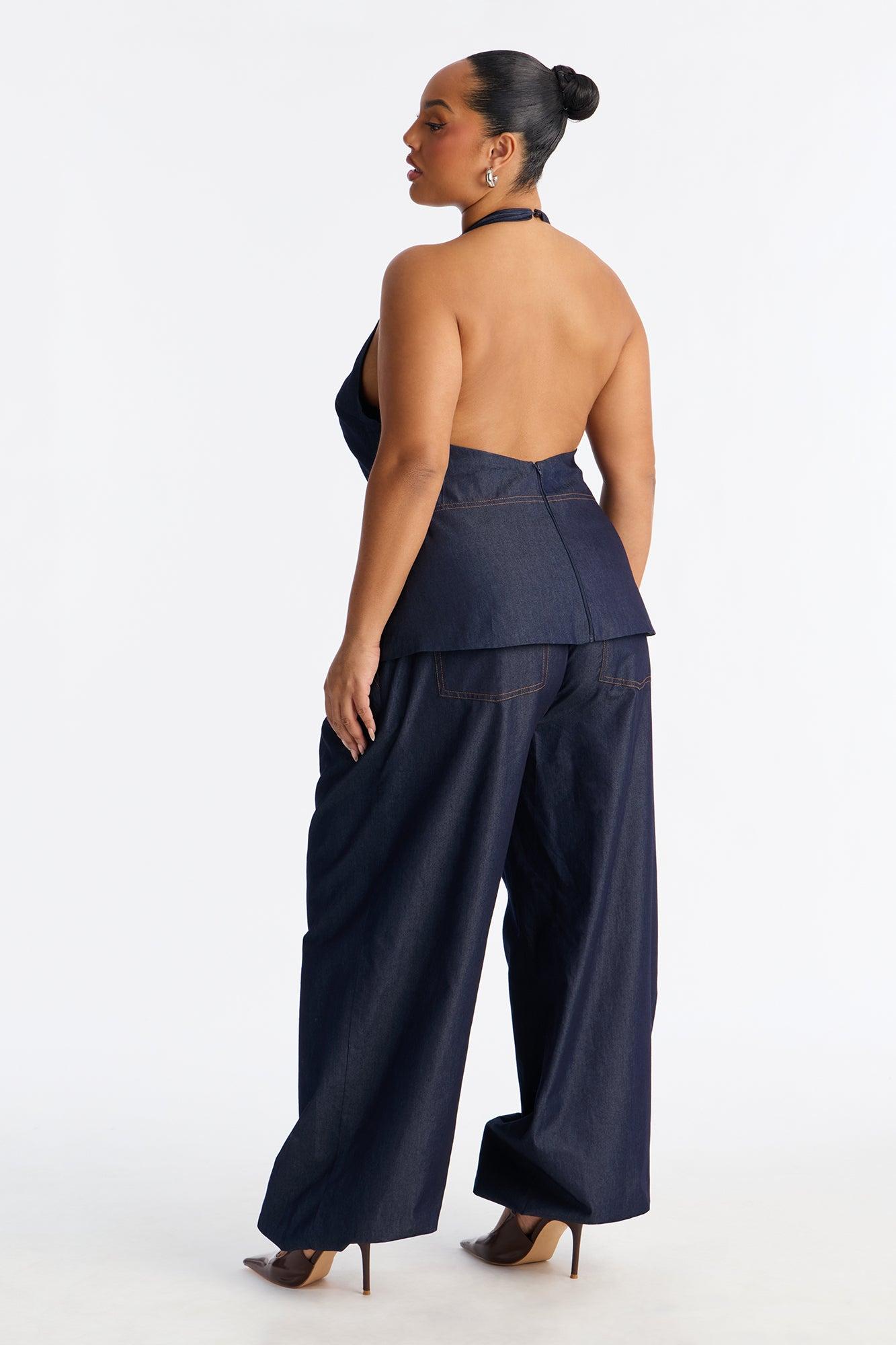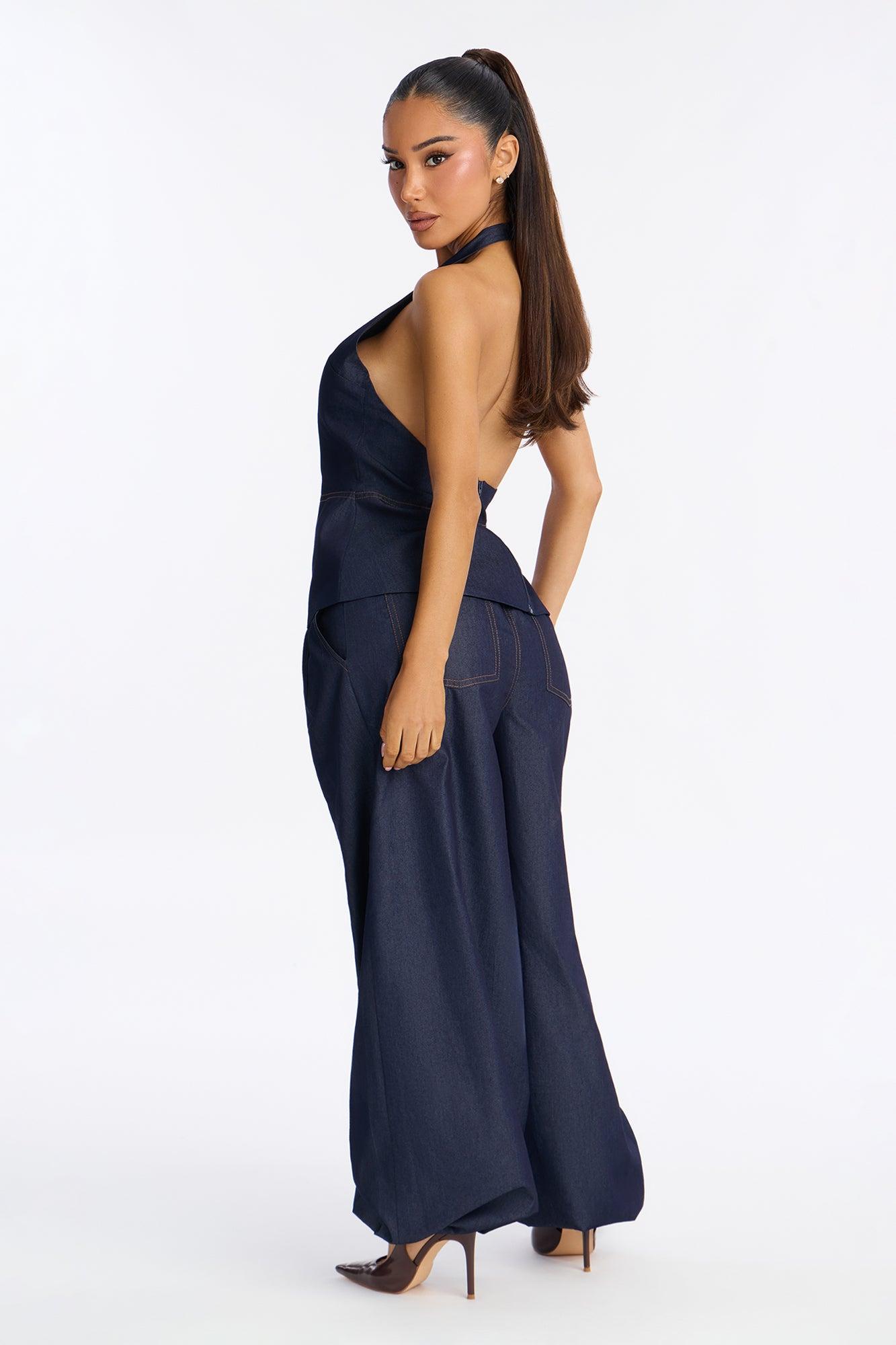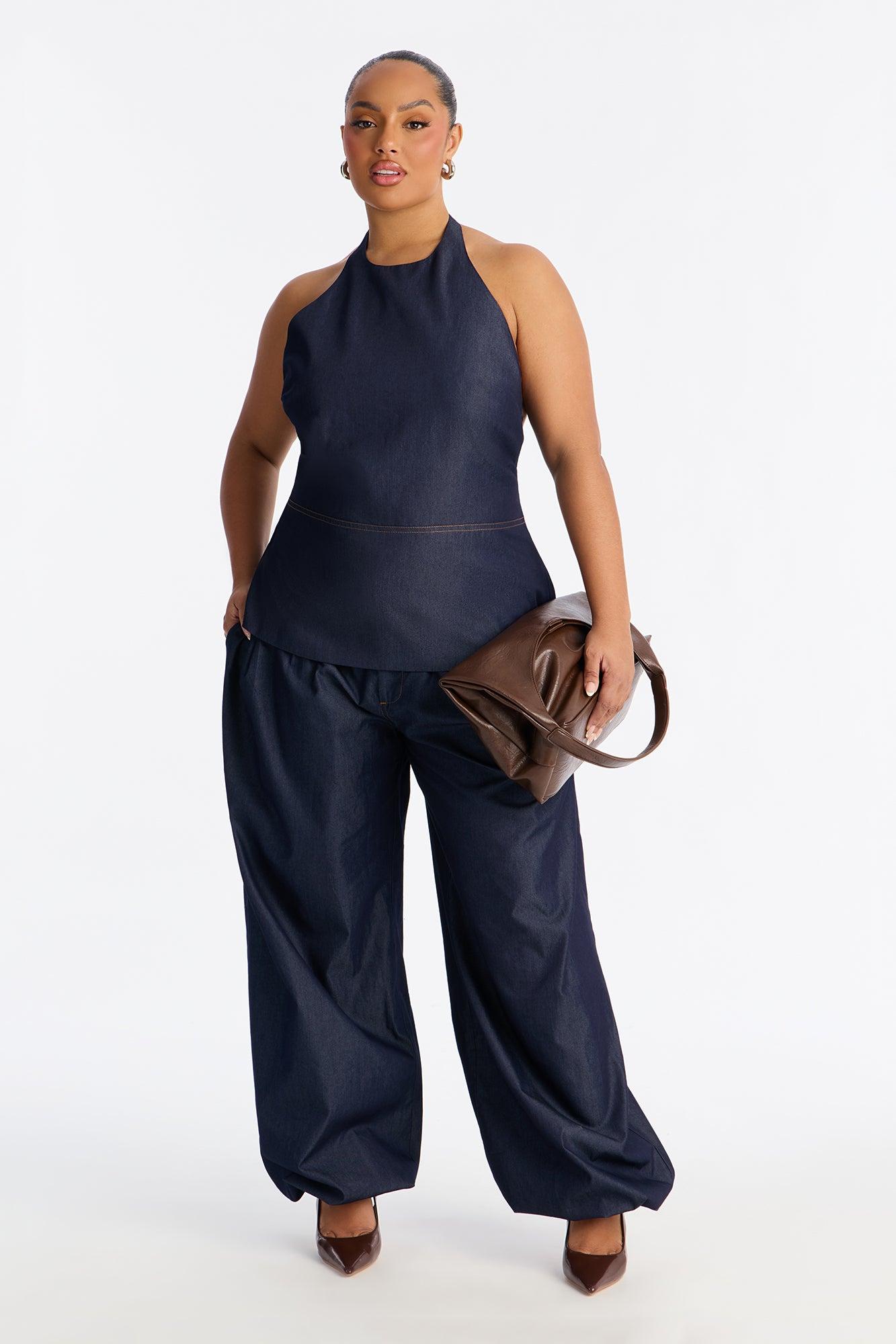Available In Dark Denim. 2 Piece Ensemble Halter And Balloon Pant Set Moderate Stretch Pockets Self: 80% Cotton 20% Polyester Lining: 97% Polyester 3% Cotton Imported California Proposition 65WARNING: Cancer and Reproductive Harm - www.P65Warnings.ca.gov.