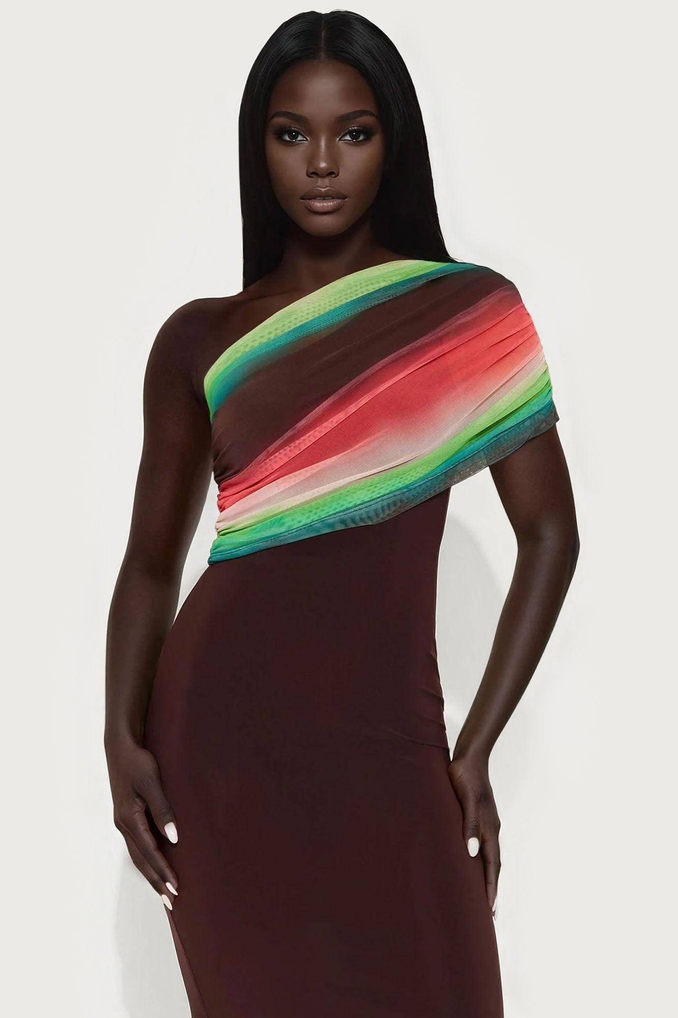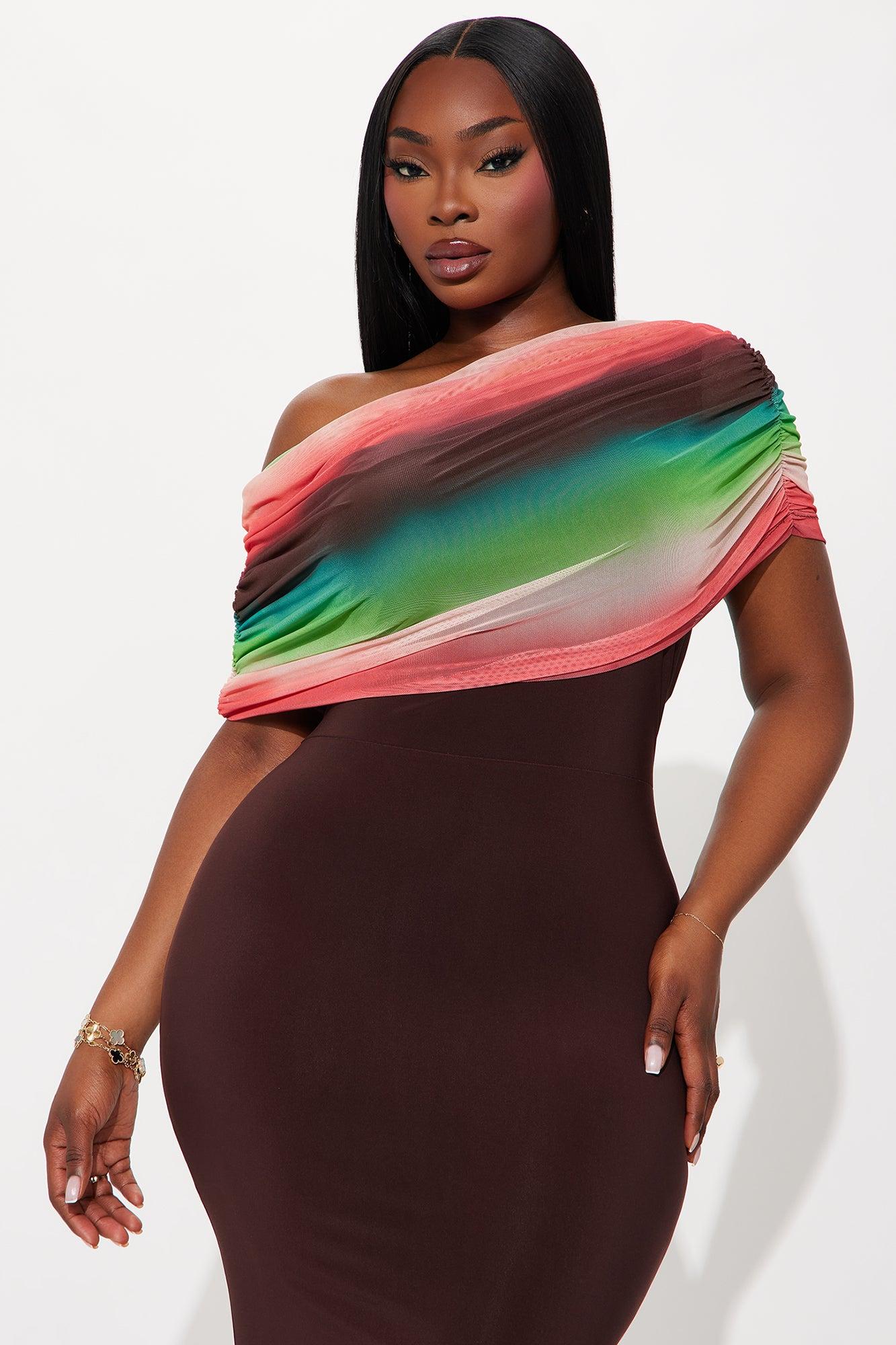 Available In Brown Combo. Maxi Dress One Shoulder Fold Over Mesh Detail Stretch Disclaimer: Due To The Specialized Dye Process, Each Garment Is Unique. Self & Contrast: 95% Polyester 5% Spandex Imported