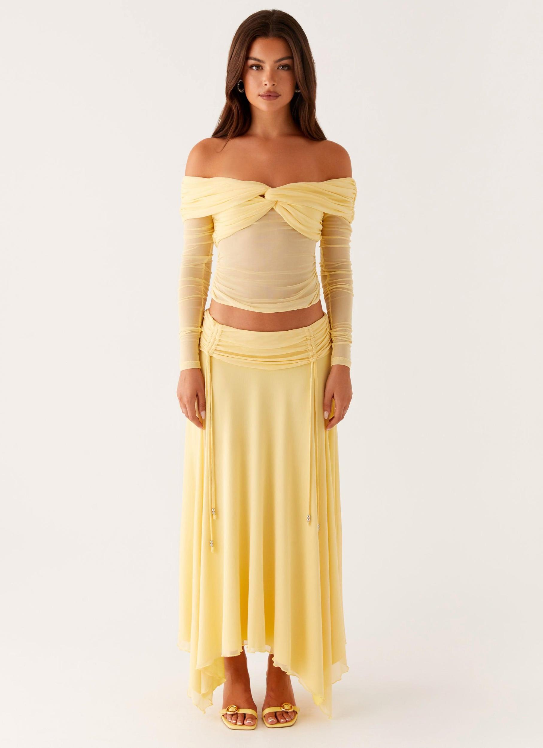 Peppermayo ExclusiveThe Amryn Long Sleeve Top is a daring yet sophisticated piece, featuring an off-shoulder neckline that exudes elegance and allure. Crafted from stretchy mesh fabric, it offers a form-fitting, comfortable fit that moves with you.- Off shoulder neckline - Silicone neckline taping - Twisted ruched bustier and shoulder seams - Stretch mesh - Lined bustier - Semi sheer bodice and sleeves - Back cut out - 95% polyester, 5% spandexSize AU 8 / US 4 garment measurements:Length: 36 cm / 14.17 inchesBust: 70 cm / 27.56 inchesWaist: 60 cm / 23.62 inchesHem: 70 cm / 27.56 inchesSleeve length: 54 cm / 21.26 inchesOlivia is 176cm and wearing a size AU 8 / and US 4
