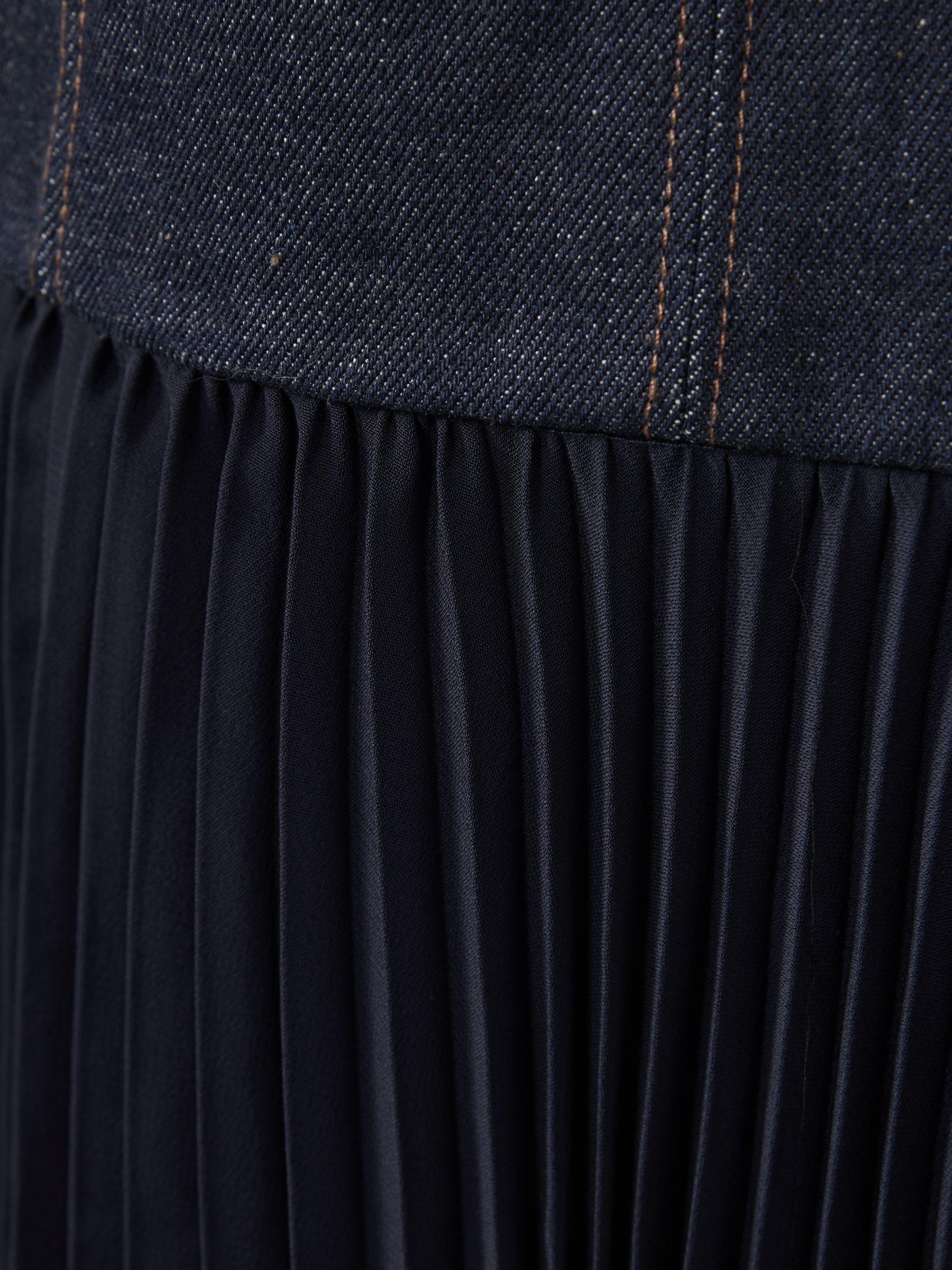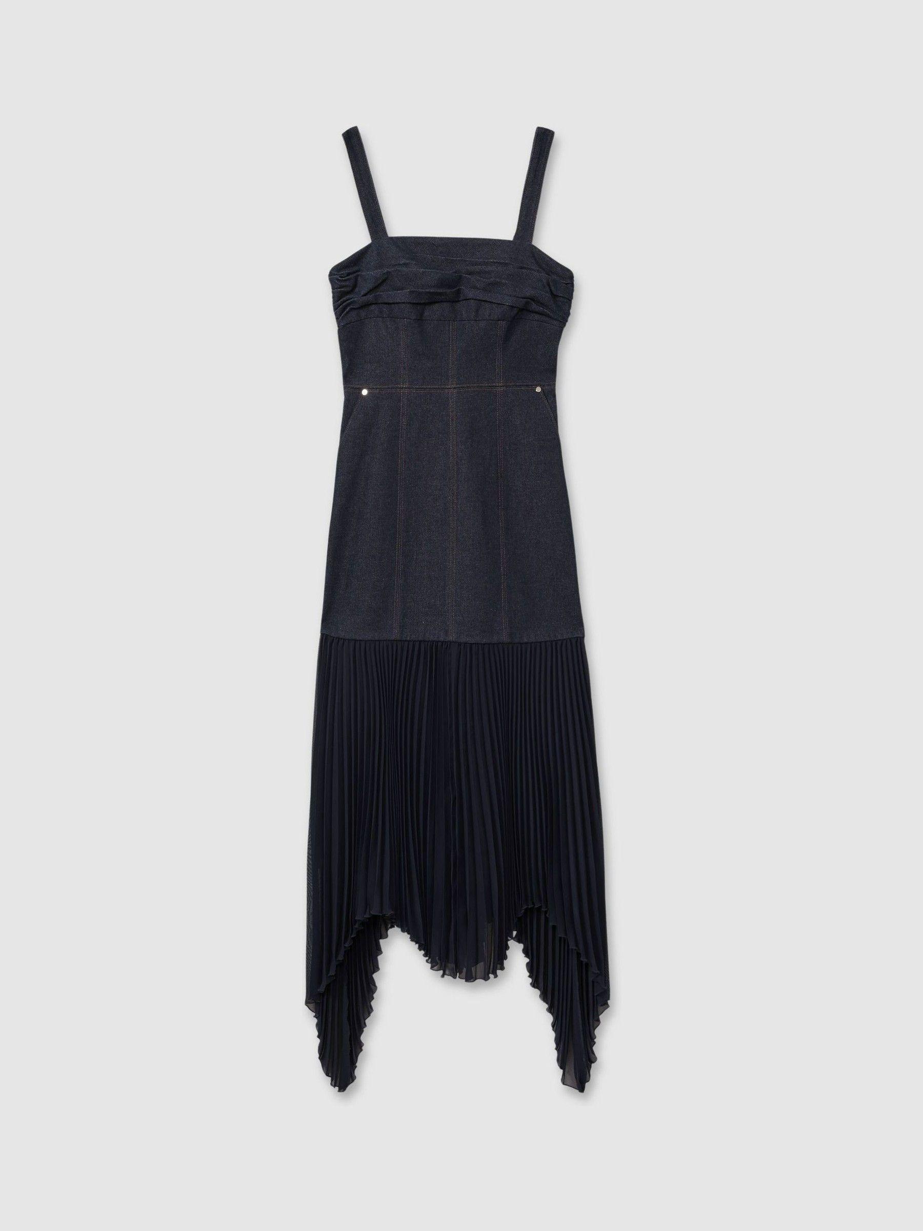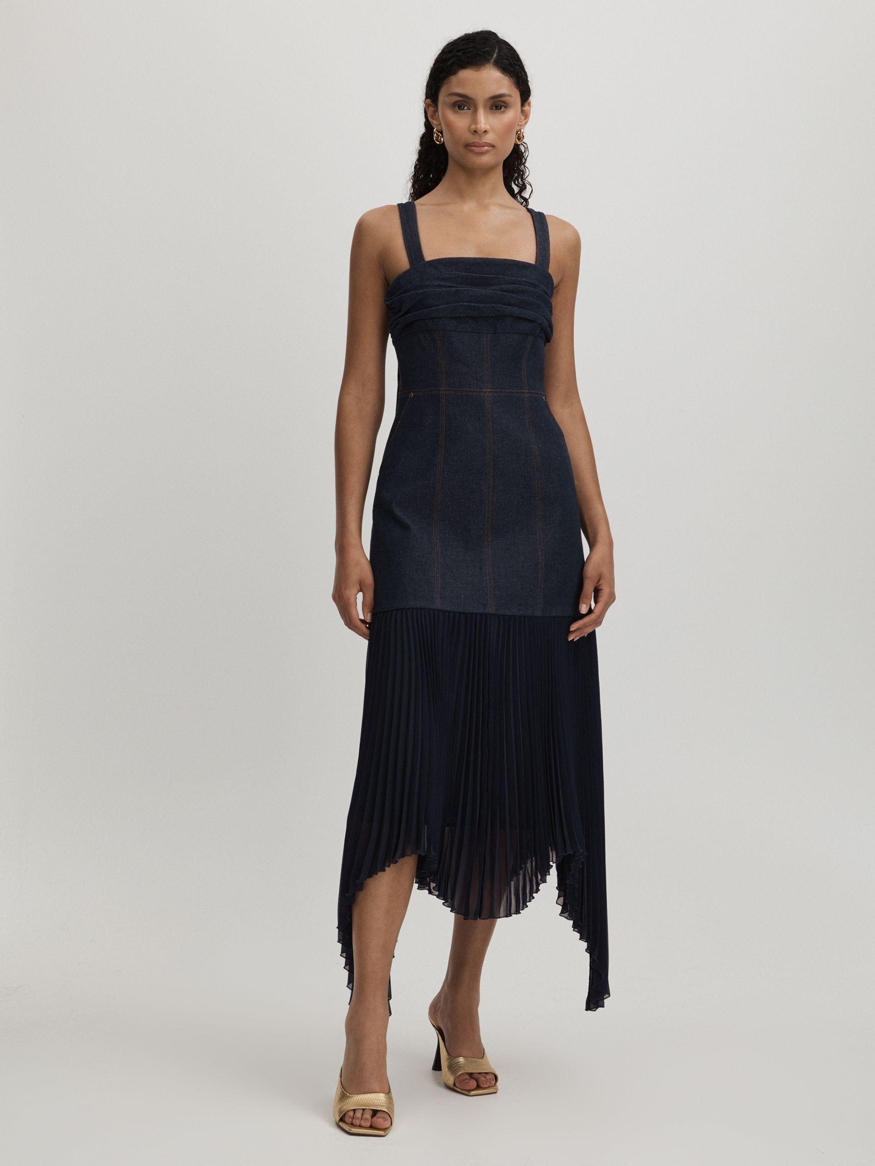 Inspired by the trending taste for denim, this maxi dress has a fitted denim bodice and an asymmetric pleated skirt. The bust is ruched and tailored with exaggerated shoulder straps. Hybrid denim construction Adjustable shoulder straps Ruche detailing Asymmetric pleated skirt Fitted If you're in between sizes, it is recommended to size up. Amur, curated by Reiss, is a collection of ready-to-wear dresses and jumpsuits intended for the mindful consumer with a taste for modern design.