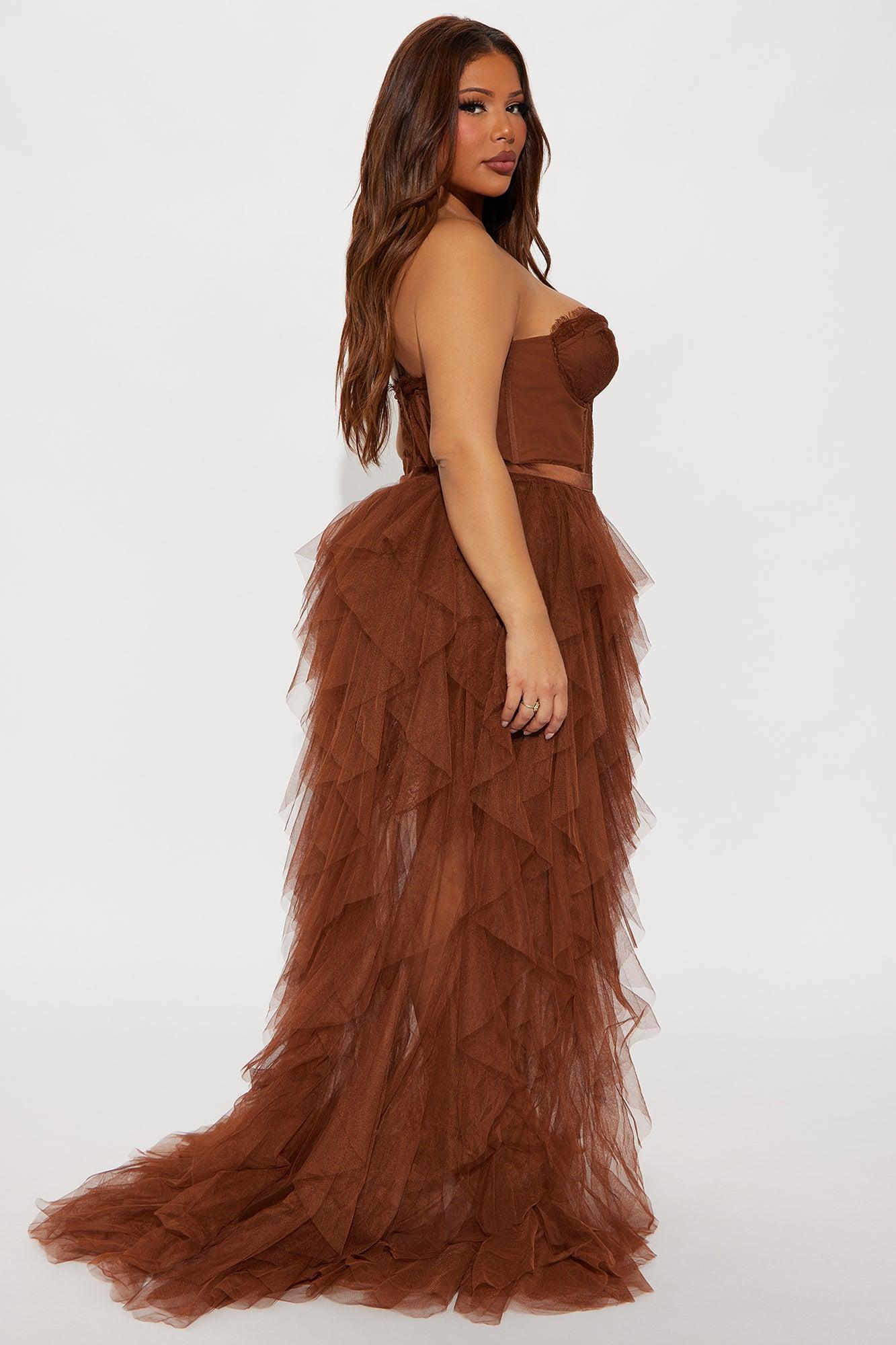 Available In Black, Cognac, Red And White. Tulle Maxi Dress Tube Sweetheart Neckline Corset Waist Lace Trim Ruffle Skirt, High Slit Bodysuit Lined Hidden Back Zipper, Non Stretch Final Sale Self: 100% Polyester Contrast1,2,3: 100% Polyester Lining1: 100% Polyester Lining2:84% Nylon 16% Spandex