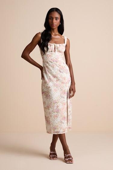 Designed to be the sweetest look in your closet, this chic woven dress features even chicer details that make it a must-have for summer soirees. Tapered straps support a fitted bodice with a tying drawstring detail along the scoop neckline and a gathered bust. Figure-skimming midi skirt boasts a side slit for effortless movement, while a vintage-style floral print and intricate pierced embroidery throughout makes this design truly compliment-worthy. Hidden back zipper/clasp.