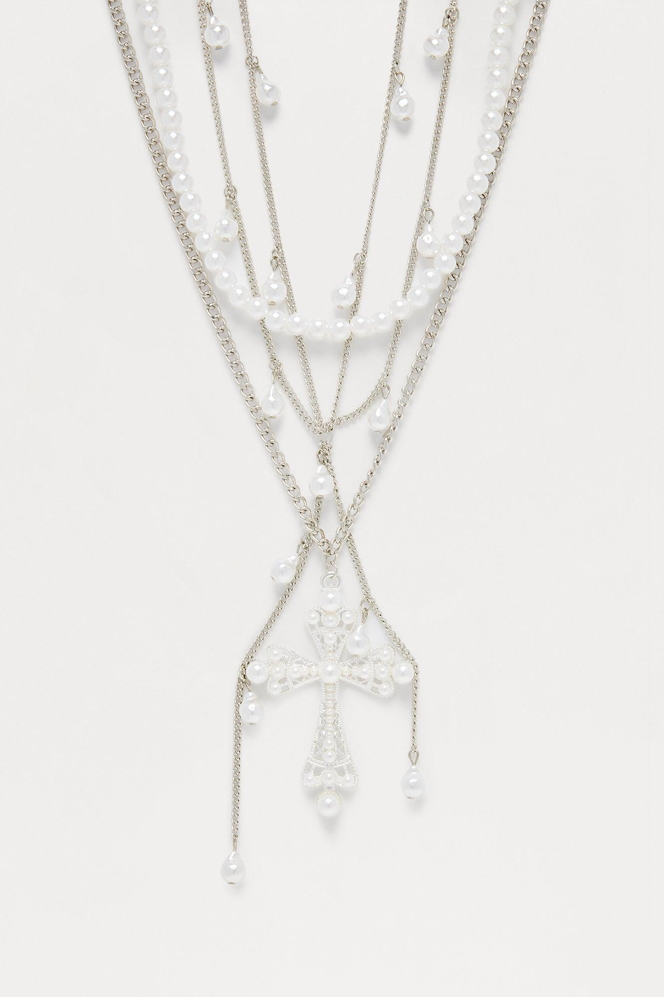 Available In Silver. Layered Necklace Pearl Detail Cross Pendant Detail Lobster Clasp Closure Imported California Proposition 65WARNING: Cancer and Reproductive Harm - www.P65Warnings.ca.gov.