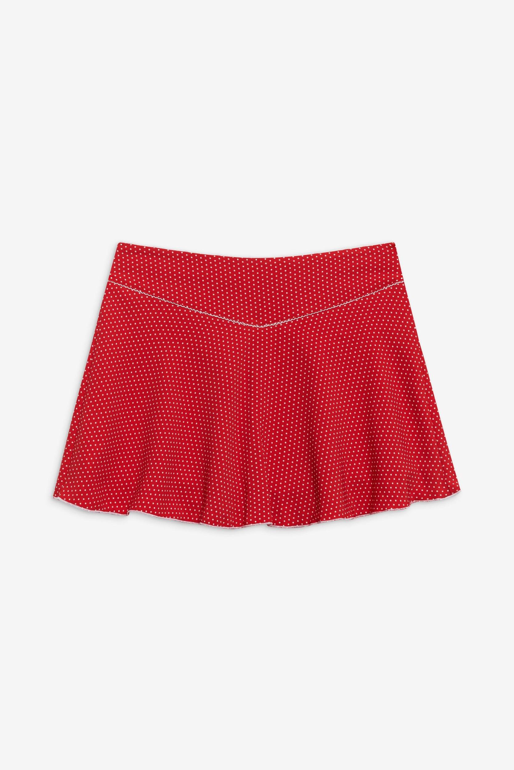 This mini skirt is the perfect piece to style with a bikini set or on its own for a night out. Complete the outfit with the matching Angeline halter top. Details Low waisted mini skirt Lightweight crepe fabric Red and white polka dot print Dainty trim detail at the waistband Fabric 100% Polyester Model Size & Fit This style runs true to size Vie is wearing a size Small Height 5’8.5” (174cm) Bust 31” (82cm), Waist 23” (58cm), Hips 36" (92cm)