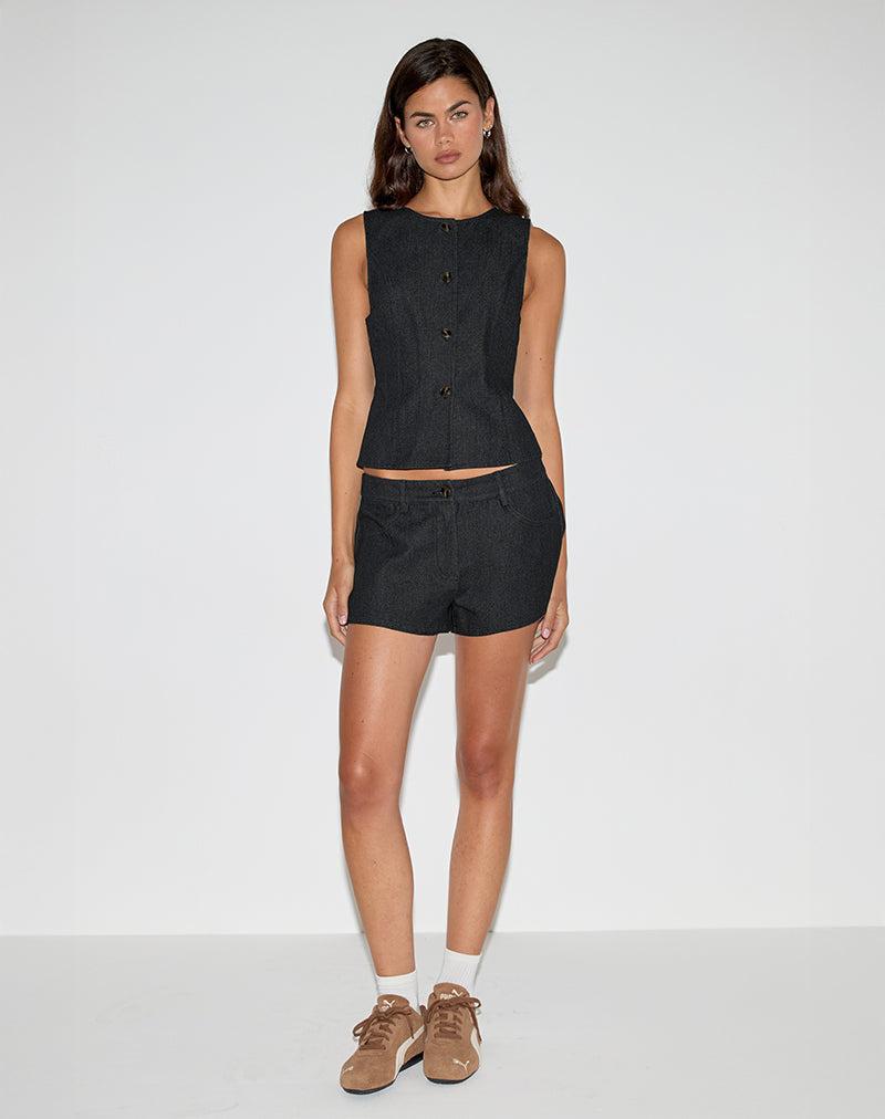 The Anila top in indigo stretch denim, offers a structured silhouette with a sleeveless design. Featuring a button-down front with bold metallic accents and a clean, tailored finish. Pair with our matching Elegi shorts. MODEL WEARS SIZE: SMALL - MODEL HEIGHT: 5'9