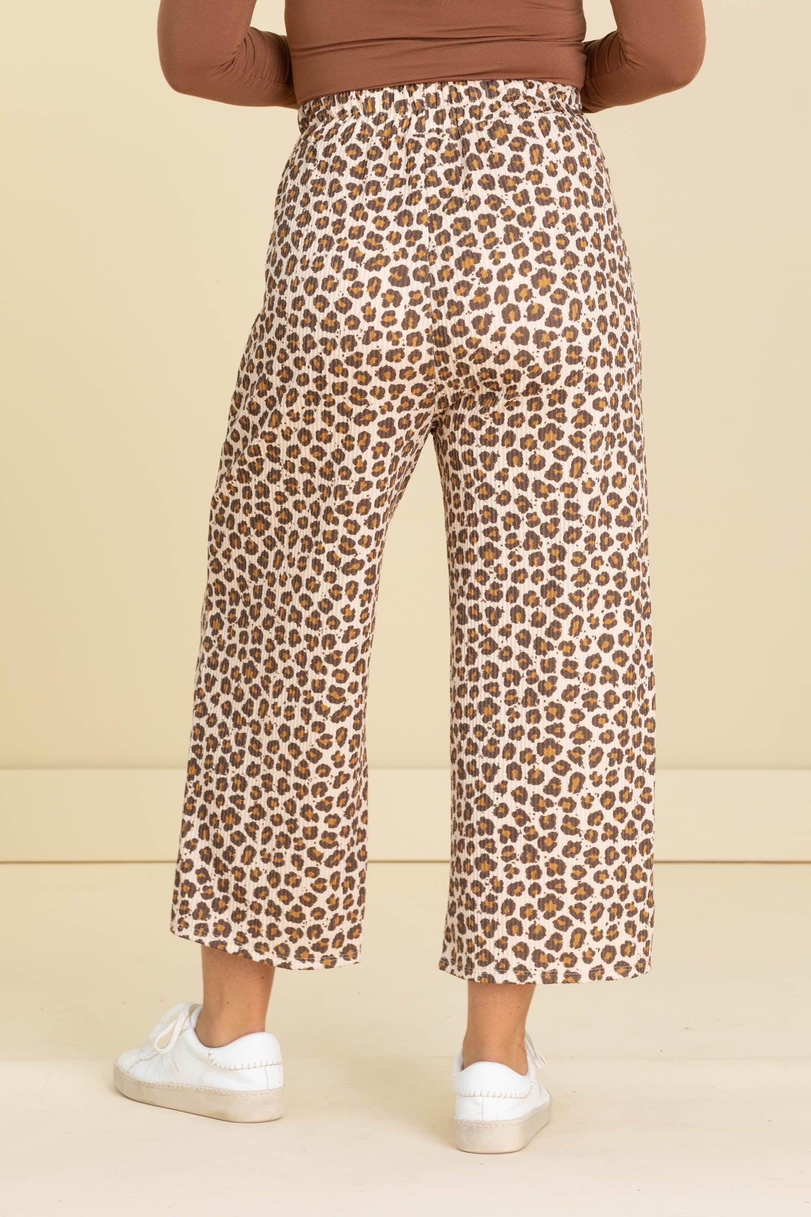 Product Details Colors: Tan, Brown, Golden Brown Print: Animal Print Style: Pants with Elastic Waist Brand: Lovely Melody Material and Care 76% Polyester 21% Rayon 3% Spandex Machine Wash Cold Tumble Dry Low Made In The USA Size and Fit Small: Waist 26" Rise 14" Inseam 22.5" Medium: Waist 28" Rise 14" Inseam 22.5" Large: Waist 30" Rise 14" Inseam 22.5" X Large: Waist 32" Rise 14.5" Inseam 23" Erica is 5’7” and wearing her true size medium