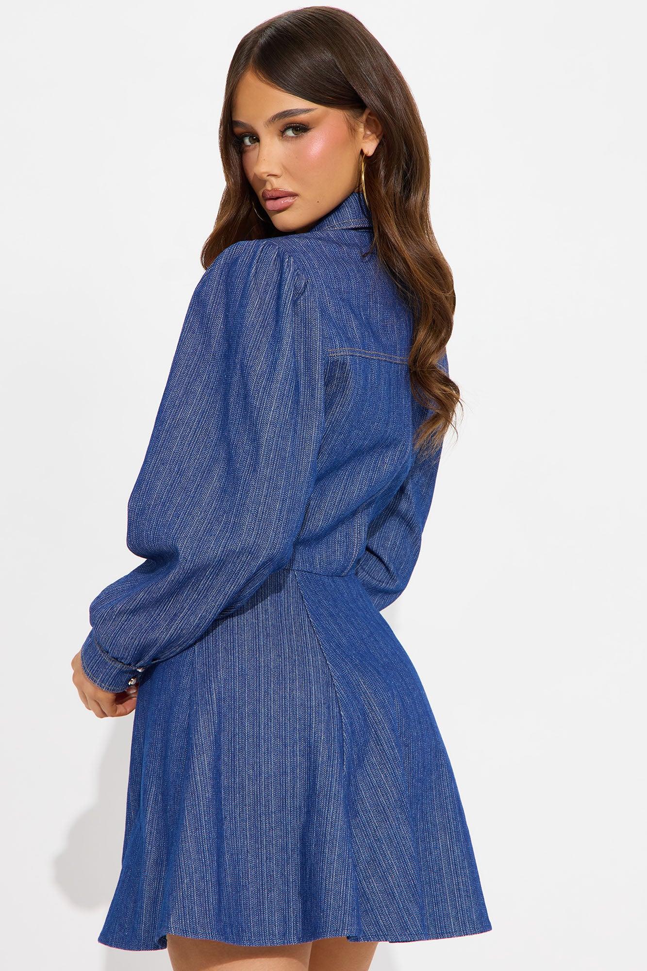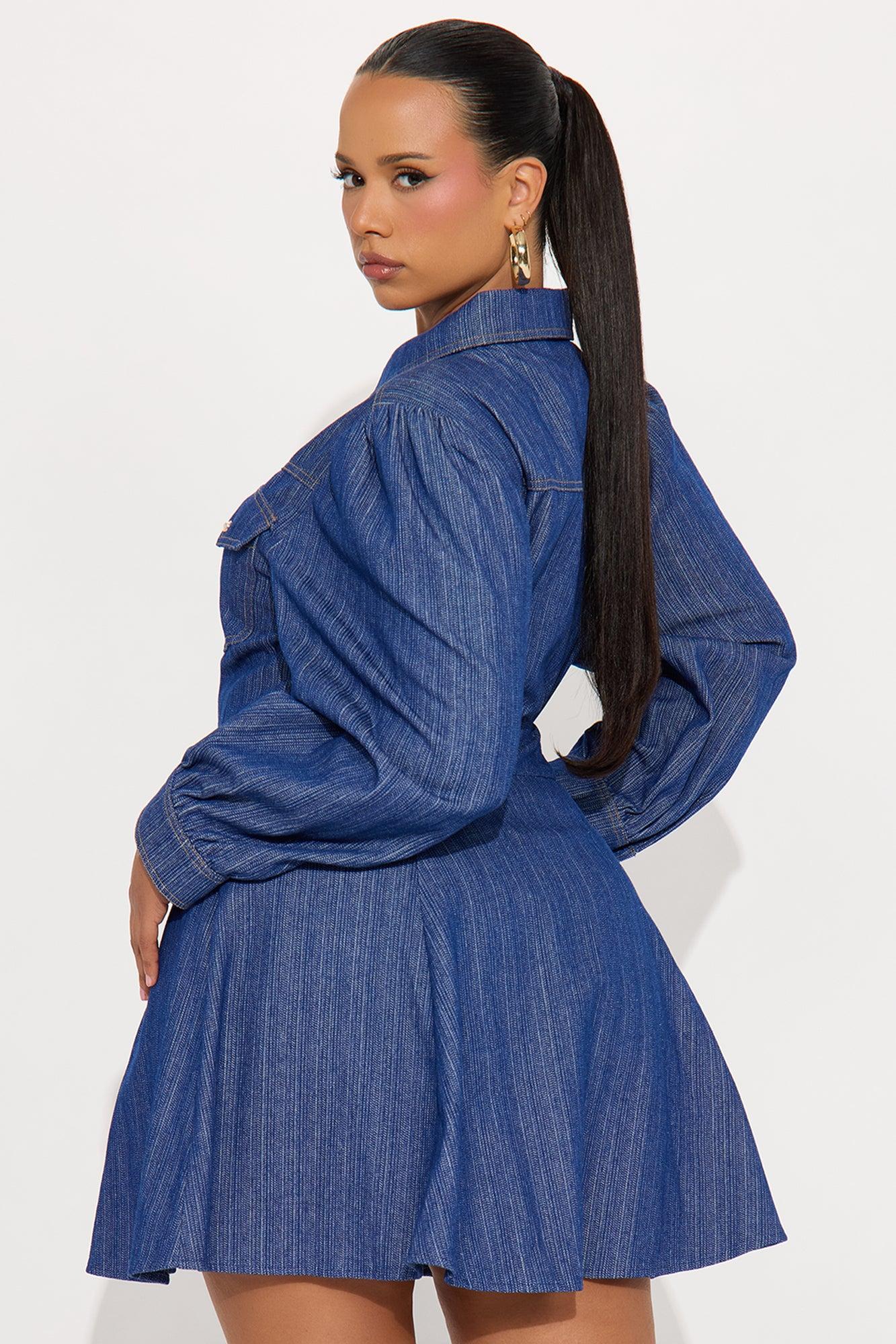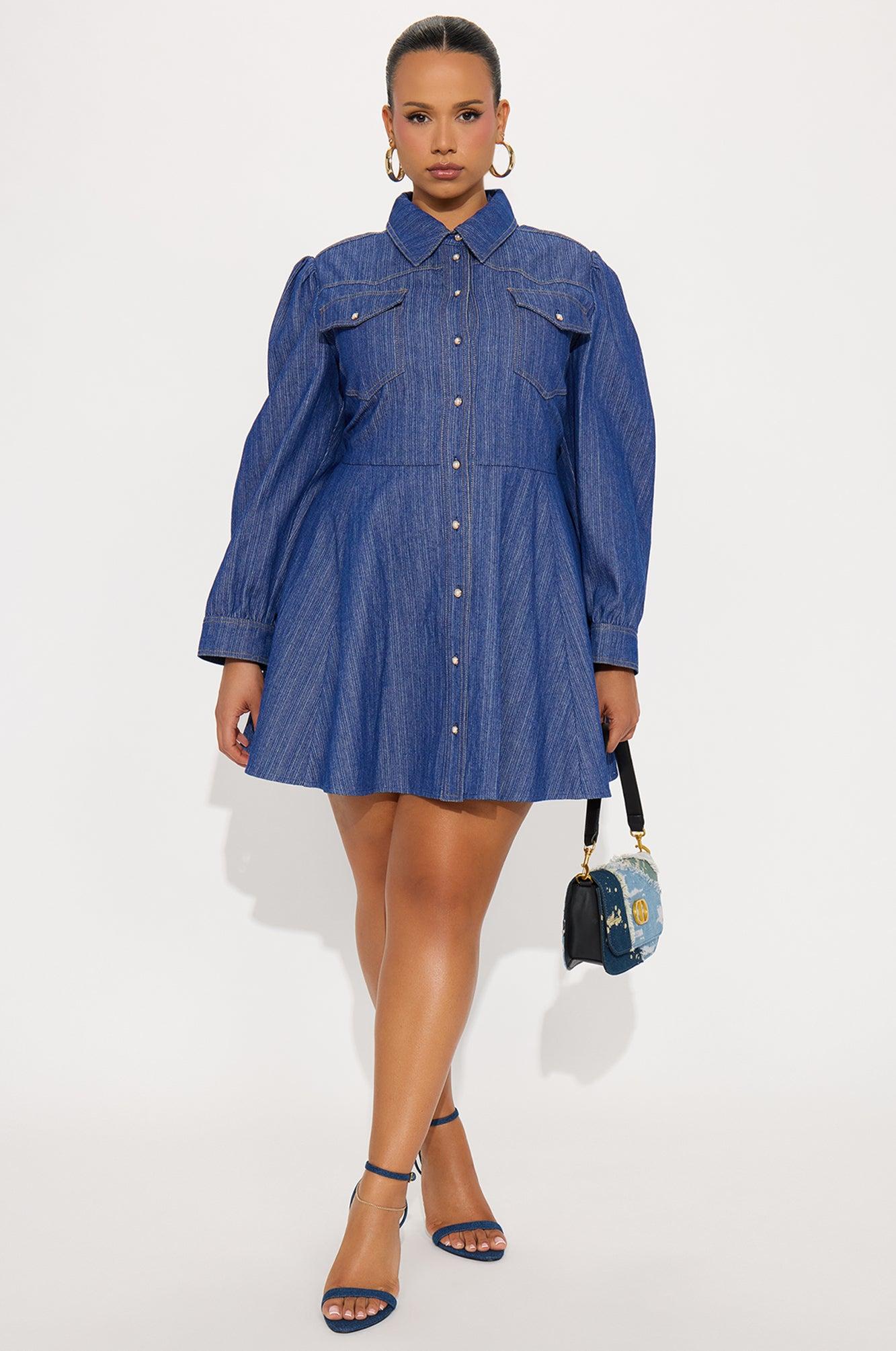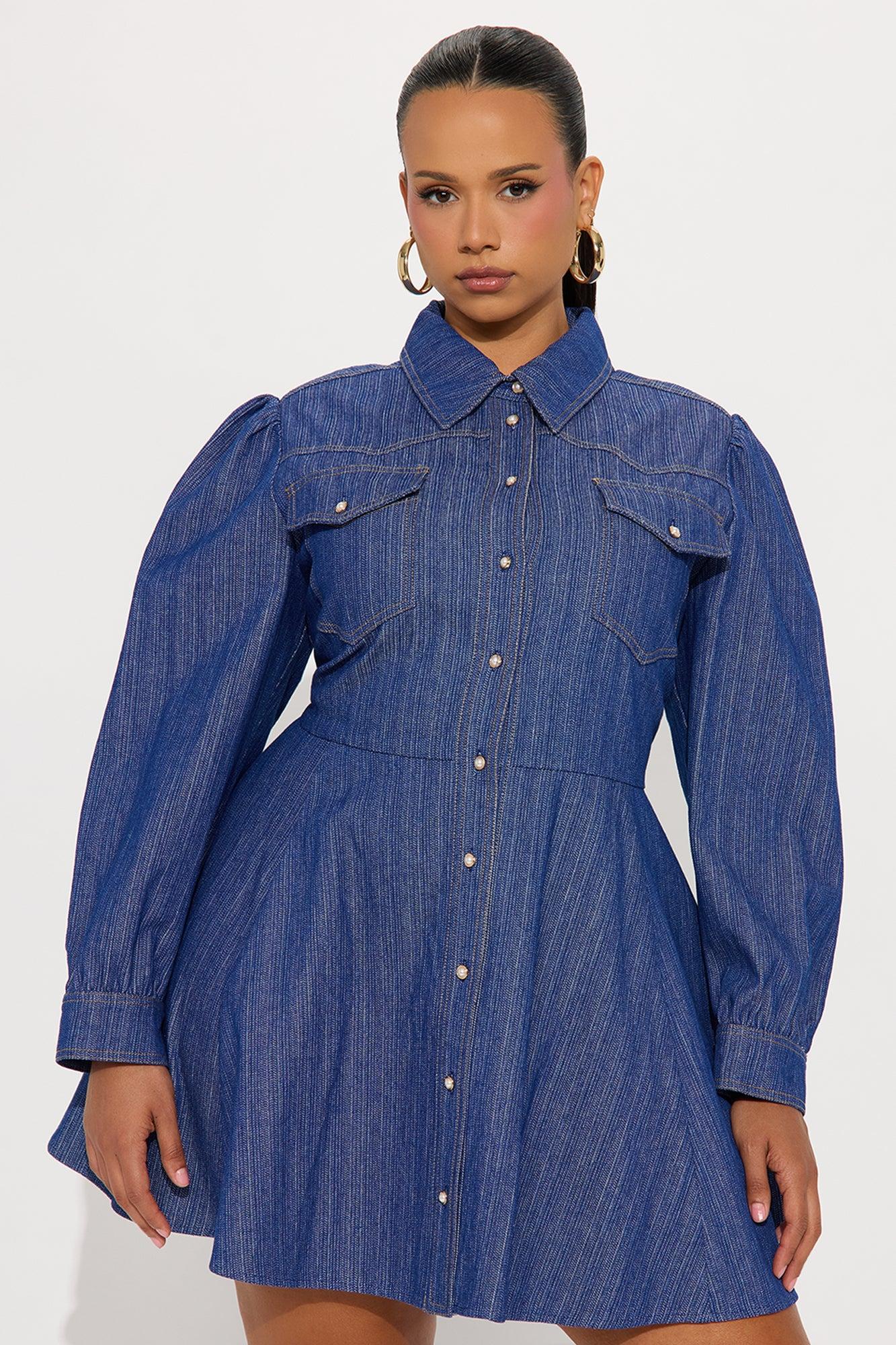 Available In Denim. Denim Mini Dress Collar Long Sleeve Button Up Pockets Non Stretch Length Measured Flat = 32" Self: 75% Cotton 25% Polyester Imported California Proposition 65WARNING: Cancer and Reproductive Harm - www.P65Warnings.ca.gov.