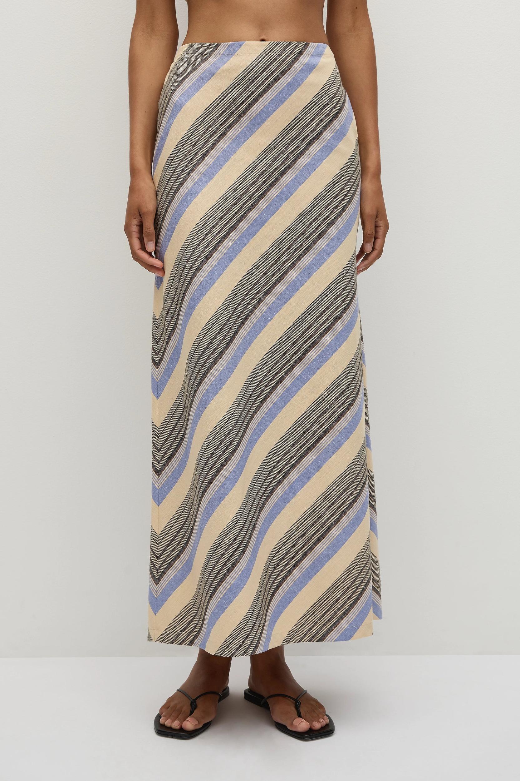 A signature FAITHFULL silhouette designed from a unique blend of organic cotton and European Flax® linen, yarn-dyed in a multi-colour stripe, inspired by the sun setting over the ocean. A high-rise midi skirt that sits high on the hips with a bias cut that falls straight down the body, cropping just above the ankles with a slight flare. Style with the Antibes Strapless Top for summer set dressing. This style is true to size. There is elastic woven into the back waist for additional stretch.