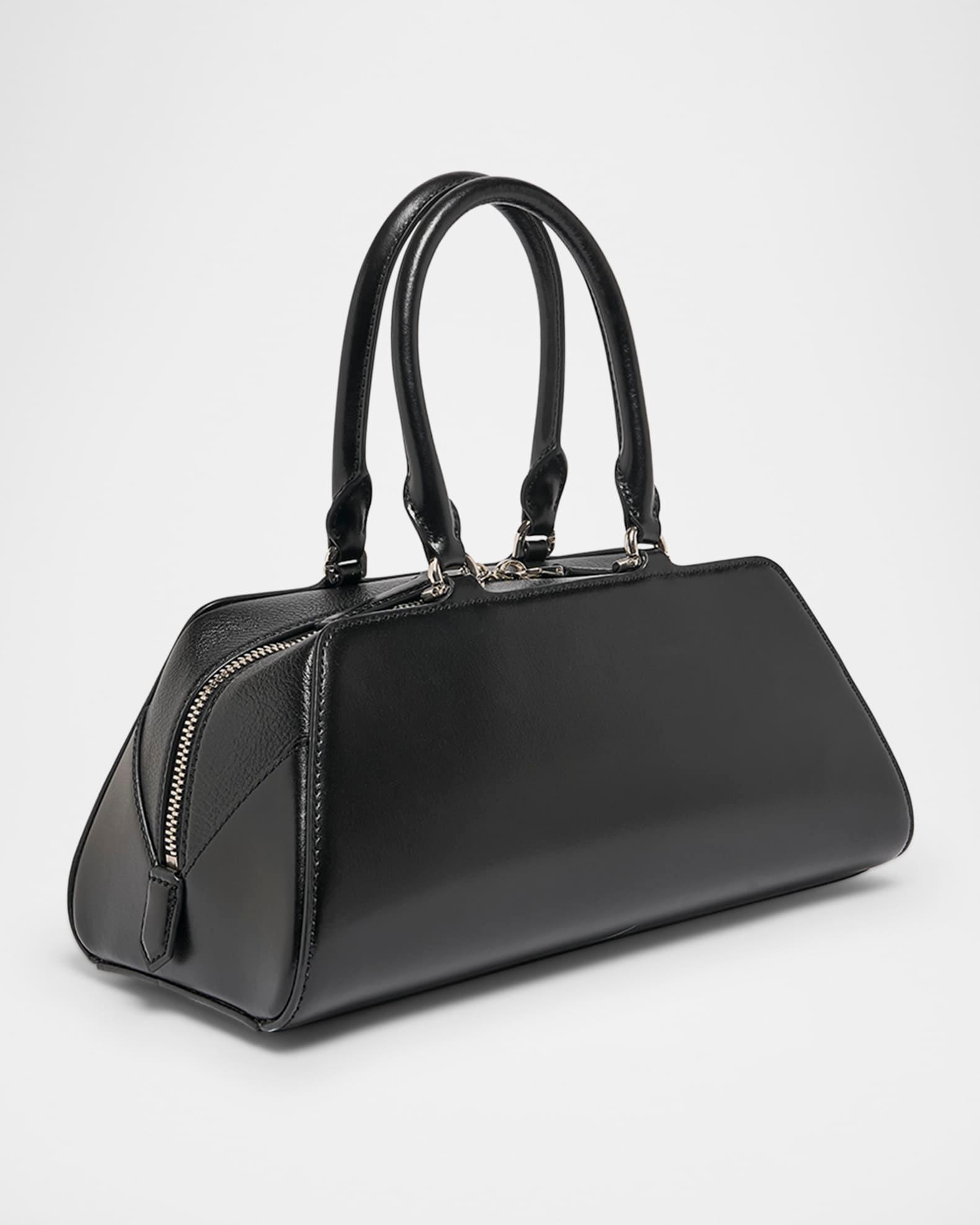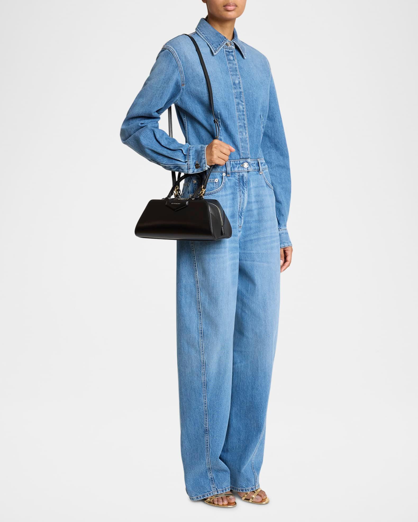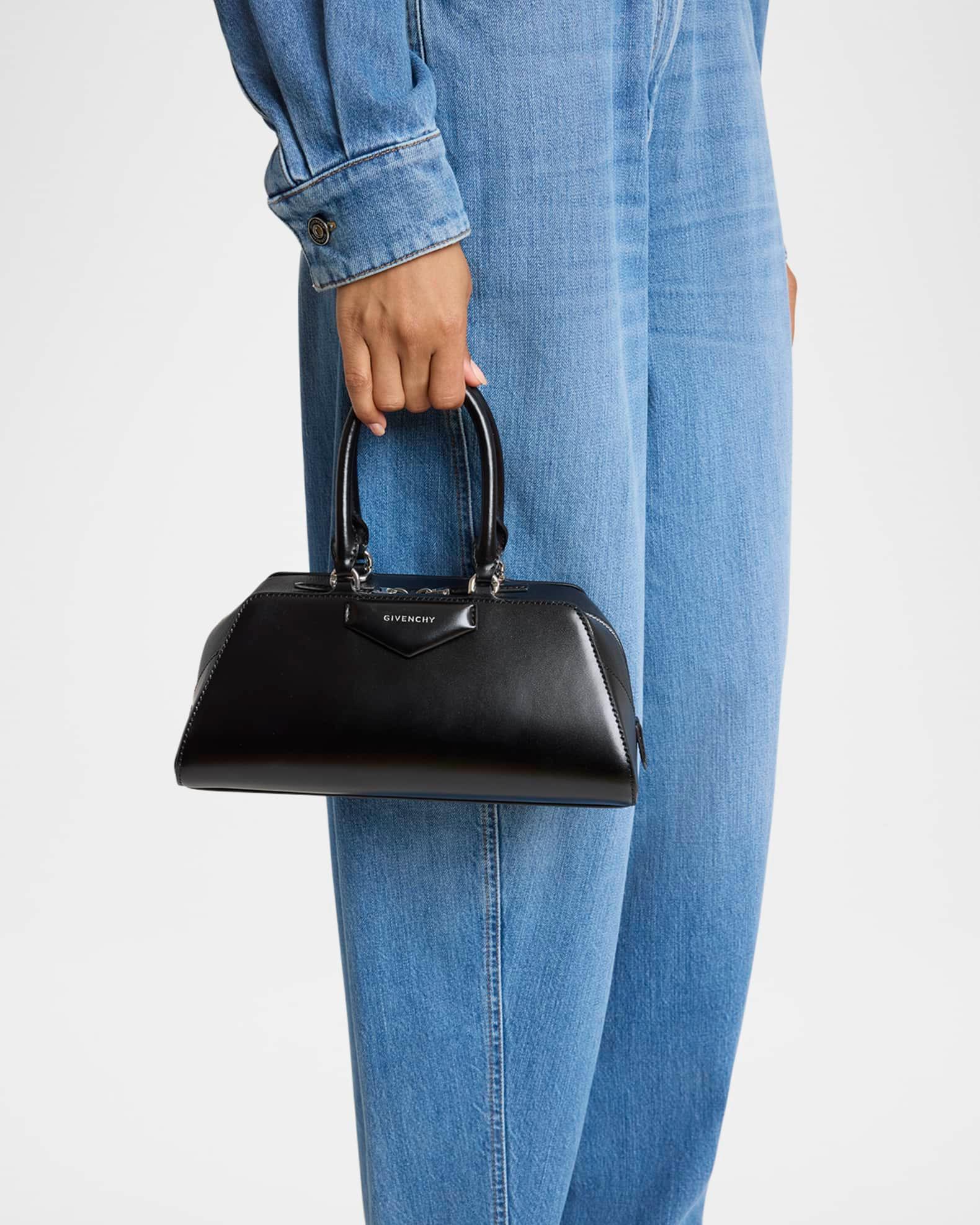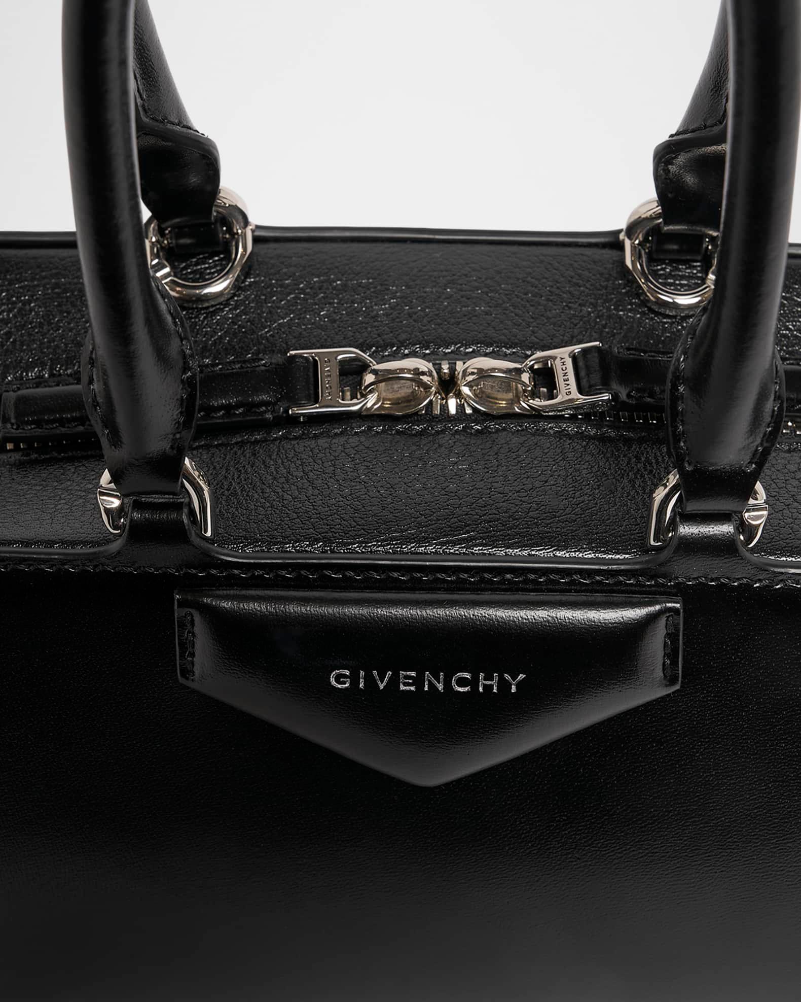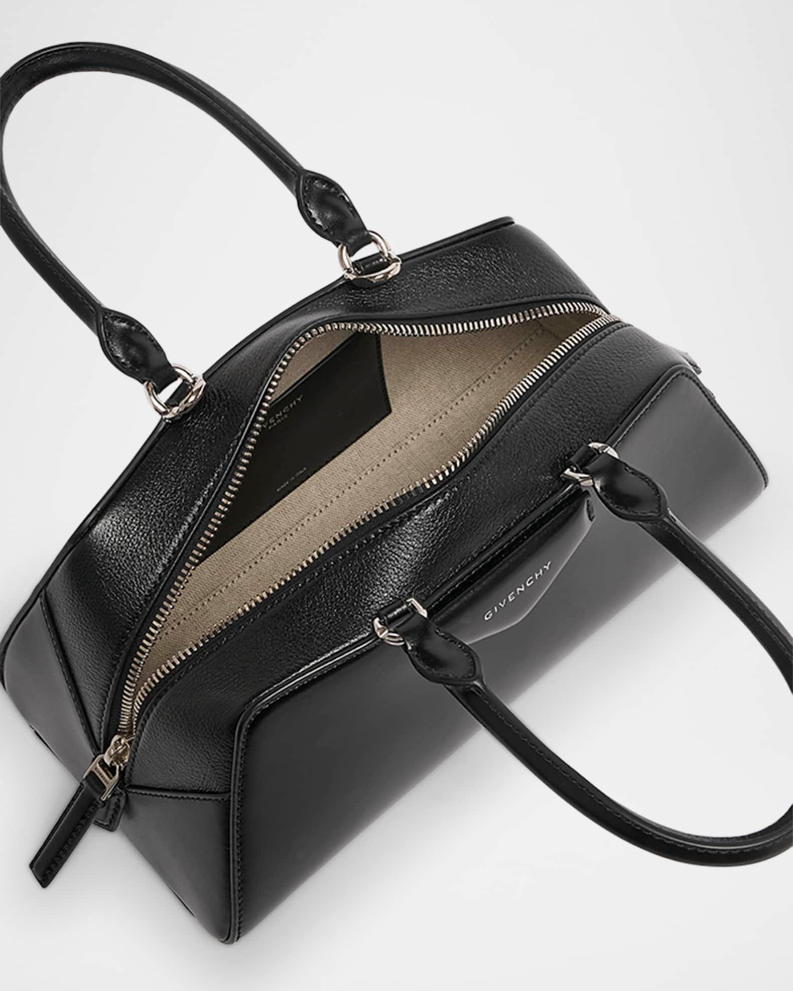 Structured in a mix of smooth and grain leather, this Givenchy "Antigona" small east-west top-handle bag is finished with silvertone hardware and logo lettering Rolled top handles Detachable, adjustable crossbody strap Can be worn as a top handle or shoulder/crossbody bag Two-way zip top closure Interior, one slip pocket Lining: Cotton Approx. 4.7"H x 10.6"W x 5.7"D Made in Italy