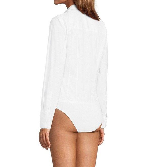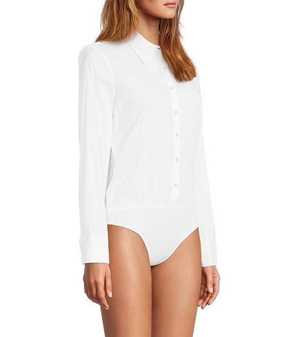 From Antonio Melani, this bodysuit features: Poplin fabrication Point collar Long sleeves Button front snap closure Cotton/elastane Dry clean Imported.
