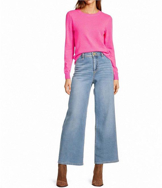 From Antonio Melani, these jeans feature: Denim fabrication High rise waist line Belt loops for styling Wide leg silhouette Pull-on construction Front button/zipper closure Approx. 30.5" inseam Cotton/ elastane Machine wash cold/line dry Imported.