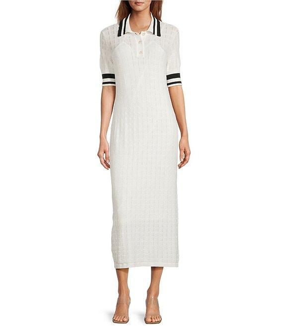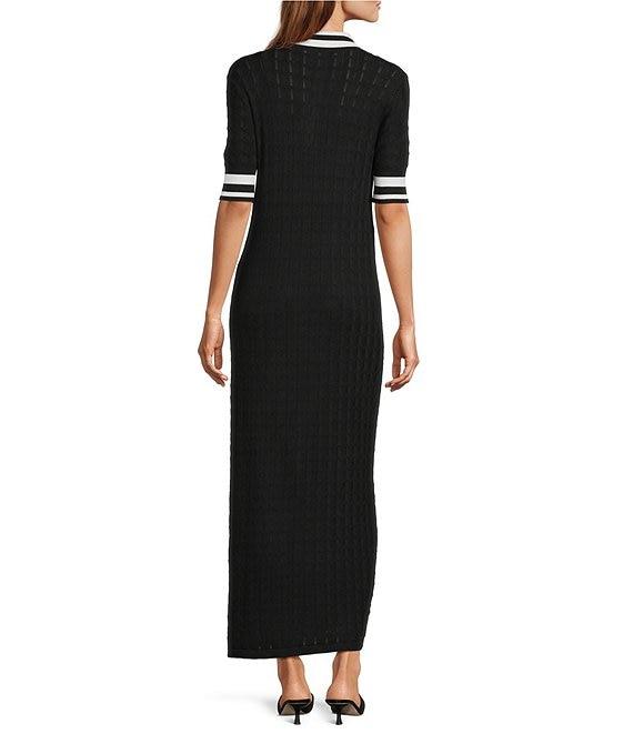 From Antonio Melani, this dress features: Rayon blend fabrication Short sleeves V-neckline Collared Ribbed Shift silhouette Pullover construction Approx. 47.75" length Viscose/nylon Machine wash cold Imported.