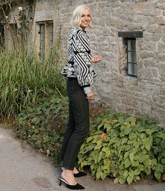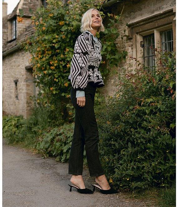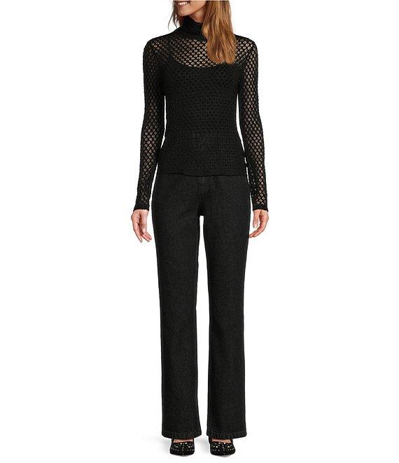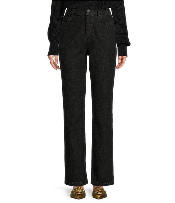 From Antonio Melani x Jennifer Sumko, these pants feature: Denim fabrication Black tinted demin Slim silhouette Straight leg Gold swan charm art on denim rivets High rise waistline 5 pocket jean construction Straight hemline Front button with zipper closure Approx. 30.5" inseam Cotton Machine wash on cold gentle cycle, wash with similar colors, wash with similar fabrications, do not bleach, promptly remove from wash, lay flat to dry. Imported. Dillard's Exclusive