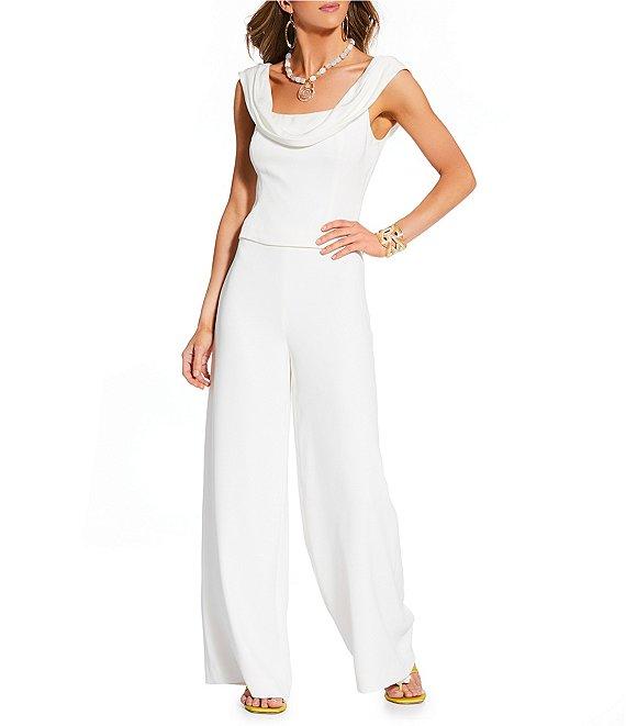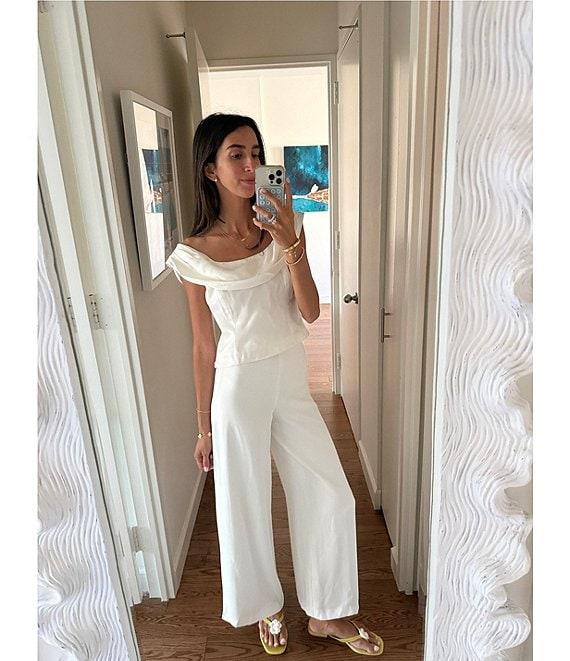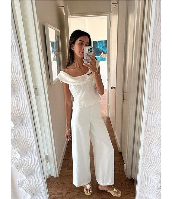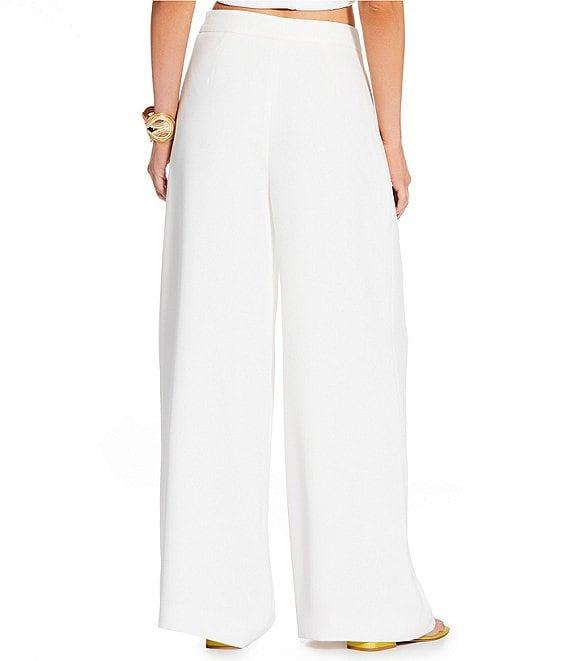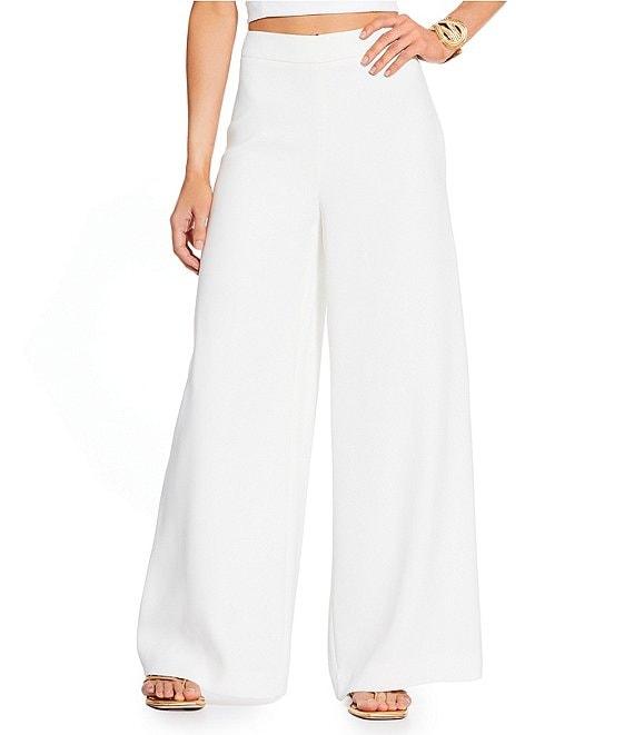 From Antonio Melani x Stephanie Covington, these pants feature: Crepe fabrication High-rise waistline Flat front silhouette Wide leg Fully lined Straight hemline Pull-on construction Side seam zipper with hook & eye closure Approx. 31" front length; 13.6" inseam Self: polyester; lining: polyester/elastane *Scarf not included Imported.