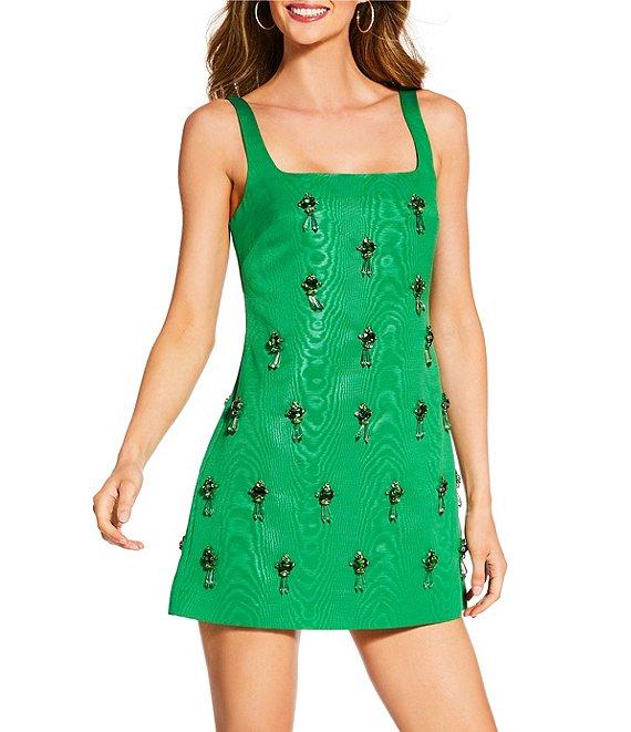 From Antonio Melani x The Nat Note, this dress features: Moire fabrication Sheath silhouette Sleeveless Square neckline Jewel detailing Lined Zipper back closure Approx. 33" length Polyester Dry clean Imported.
