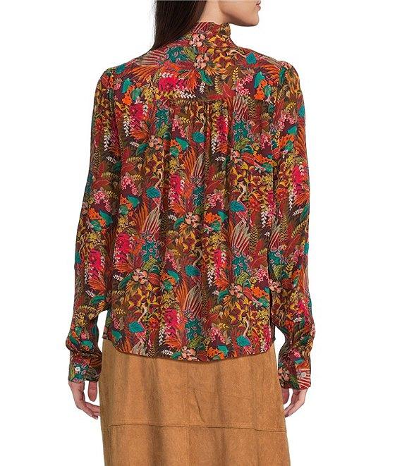 From APNY, this blouse features: Woven fabrication Ruffled mock neckline Long sleeves Printed Loose fit Straight hem Button down closure Approx. 25.625" length Cupro/viscose Machine wash Imported.