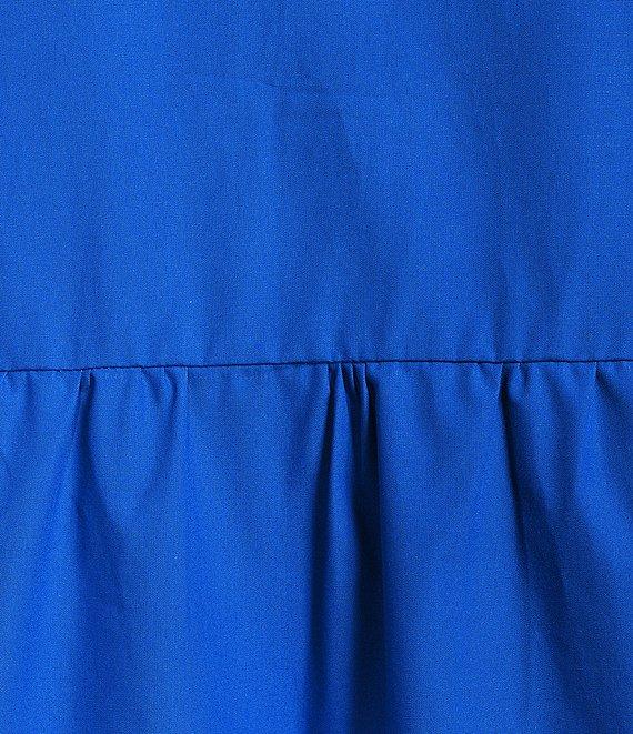 From APNY, this dress features: Woven fabrication A-line silhouette V-neckline with stand collar Short puff sleeves Side seam functional pockets Tiered skirt Midi length Button front closure Approx. 49" length Cotton Machine wash Imported.