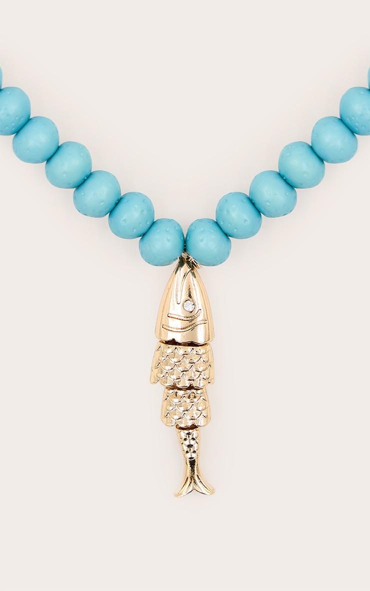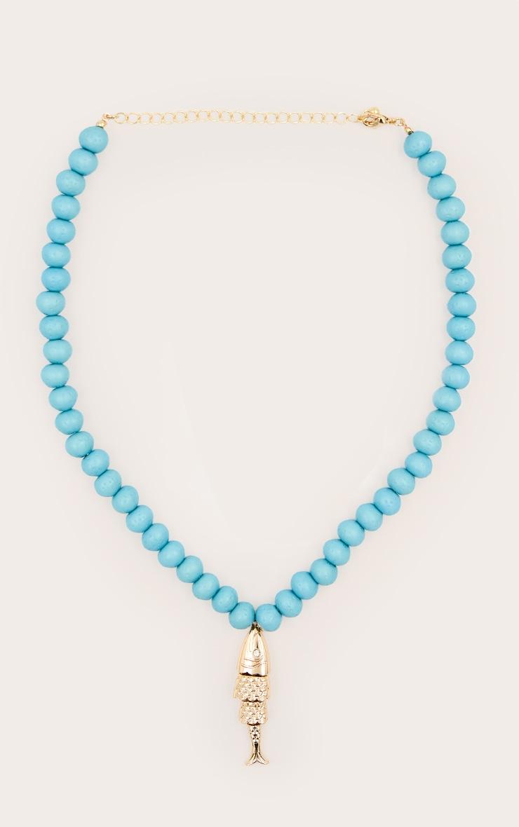 Add a playful touch to your accessories with the aqua beaded fish pendant necklace. Made from aqua-toned beads with a whimsical fish charm, it brings a fun and unique finish to any look. Style with an open neckline or swimwear for a statement summer accessory.p]:!mb-4inch>Brand: PrettyLittleThingCategory: AccessoriesProduct type: NecklaceColor: AquaMaterial: MetalOccasion: Day