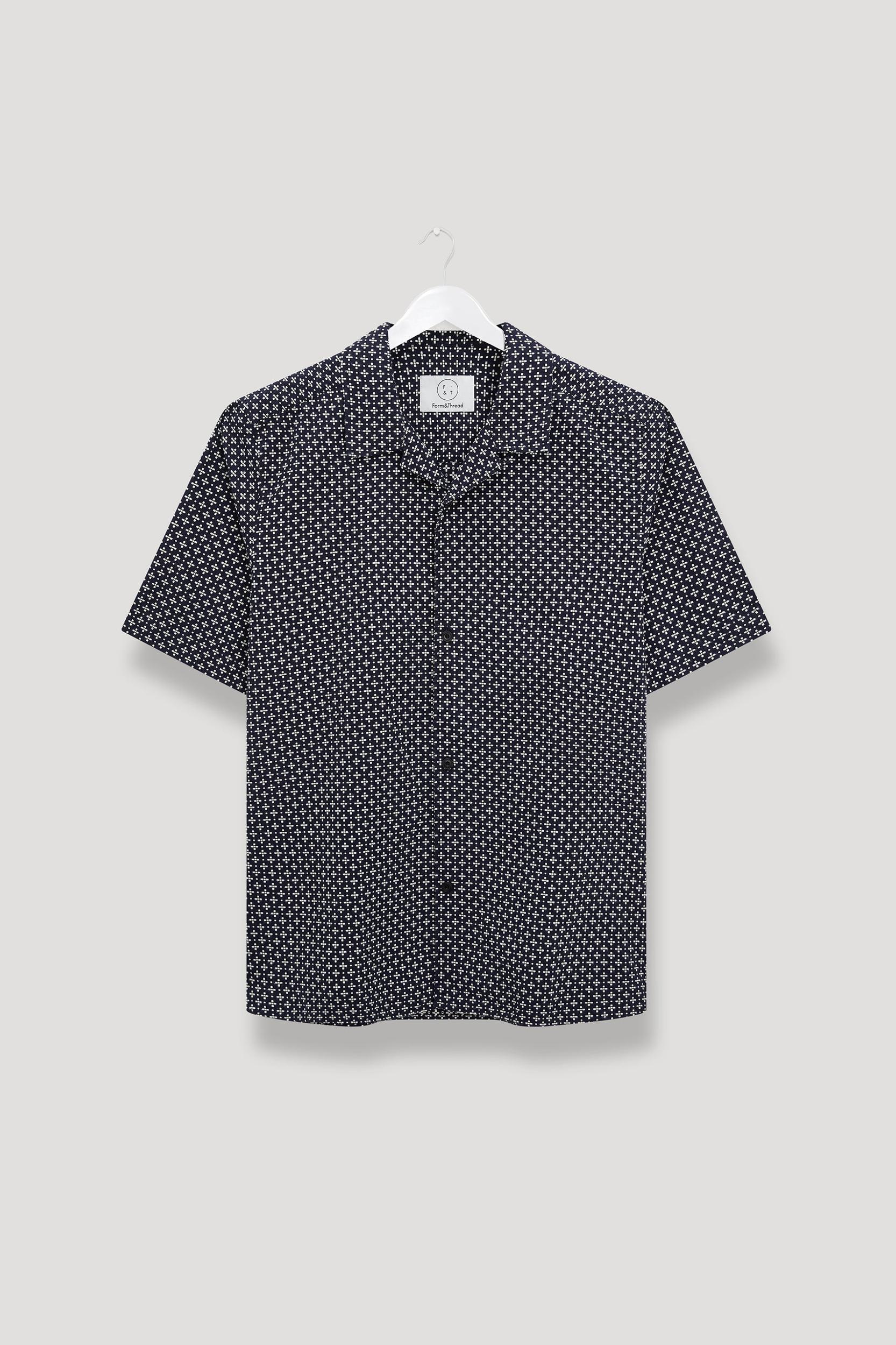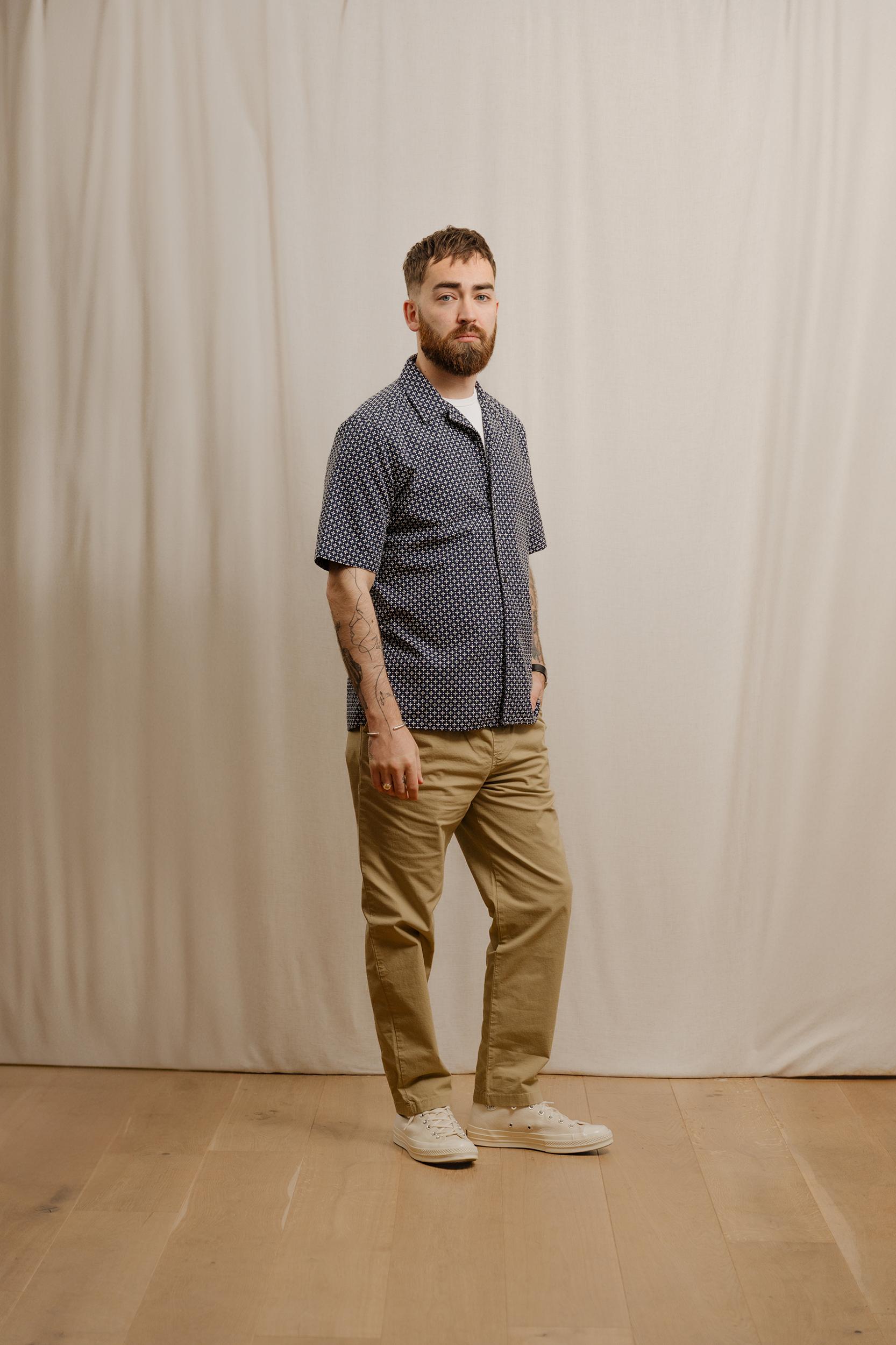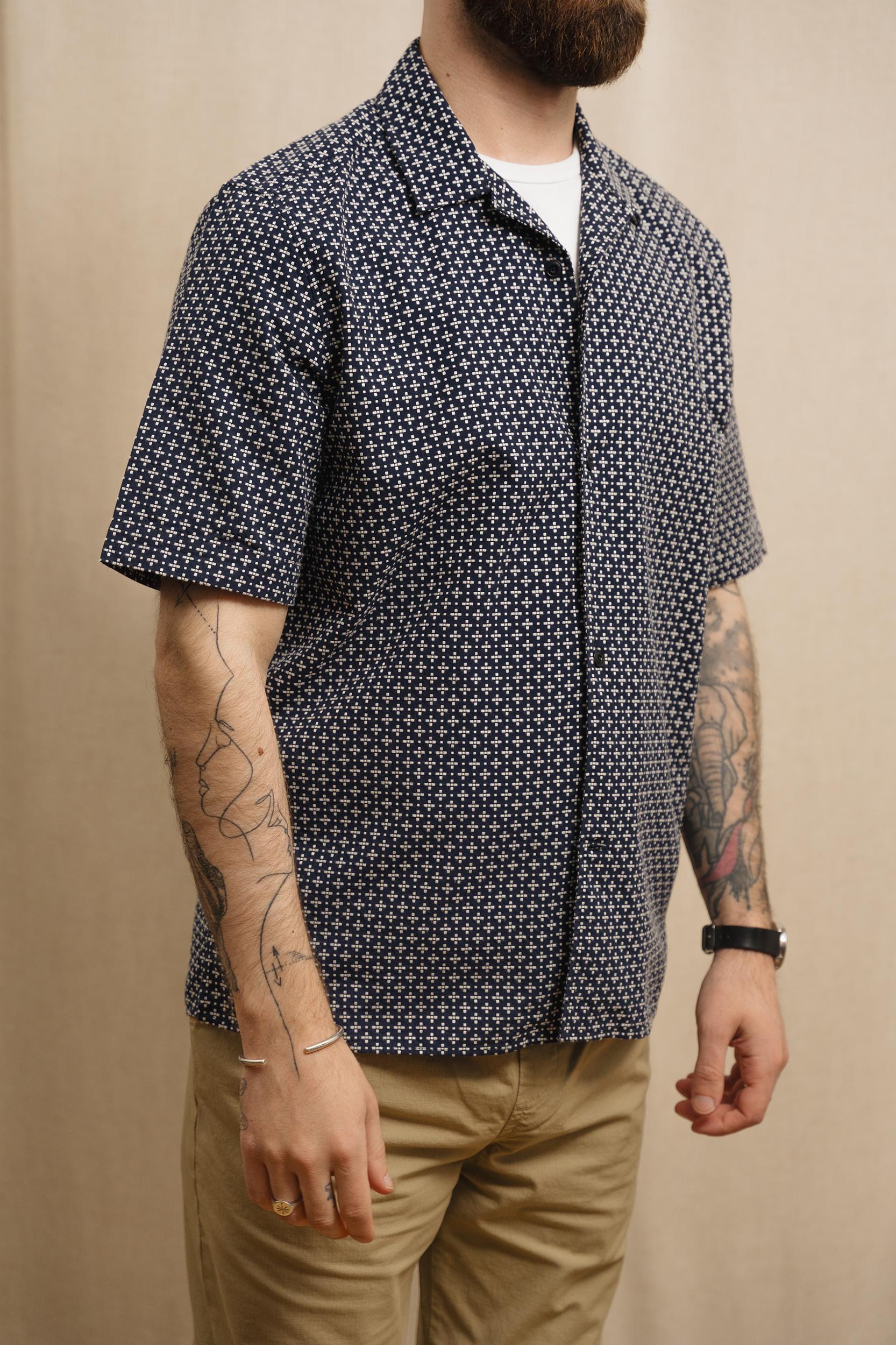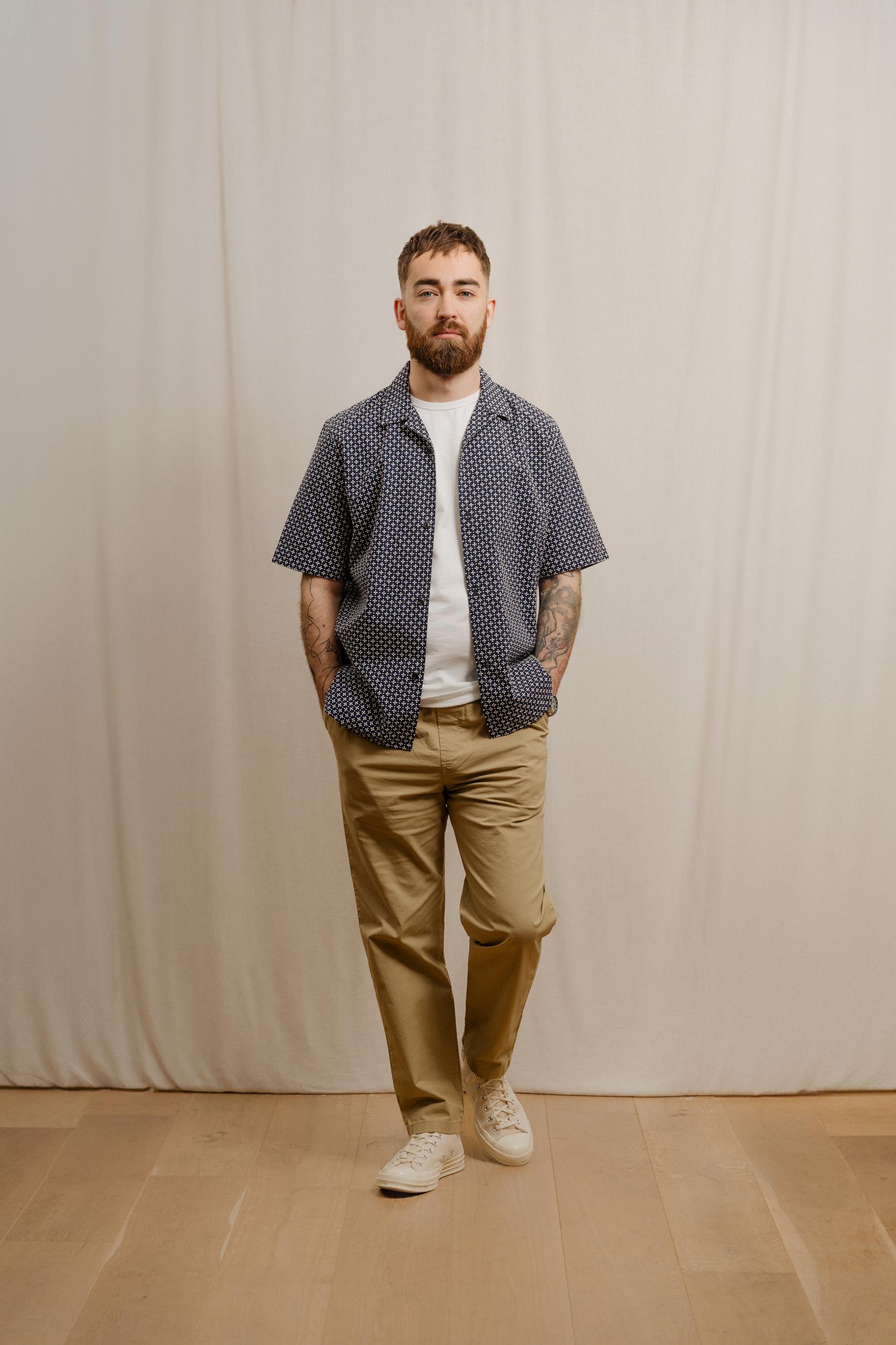 The Short Sleeve Cabin Shirt is a relaxed style, cut in a shape that is straight through the body. Crafted from a beautiful, mid-weight jacquard design from Portugal. Detailed with a camp collar and finished with sustainable, corozo nut buttons. Cut for a regular fit. Take you normal size.