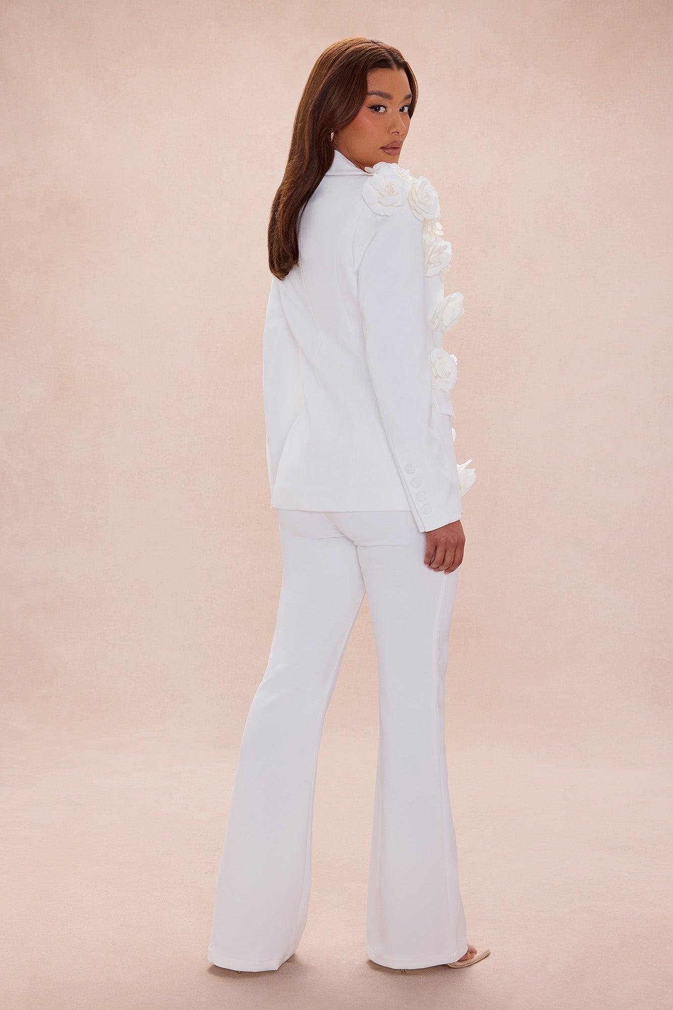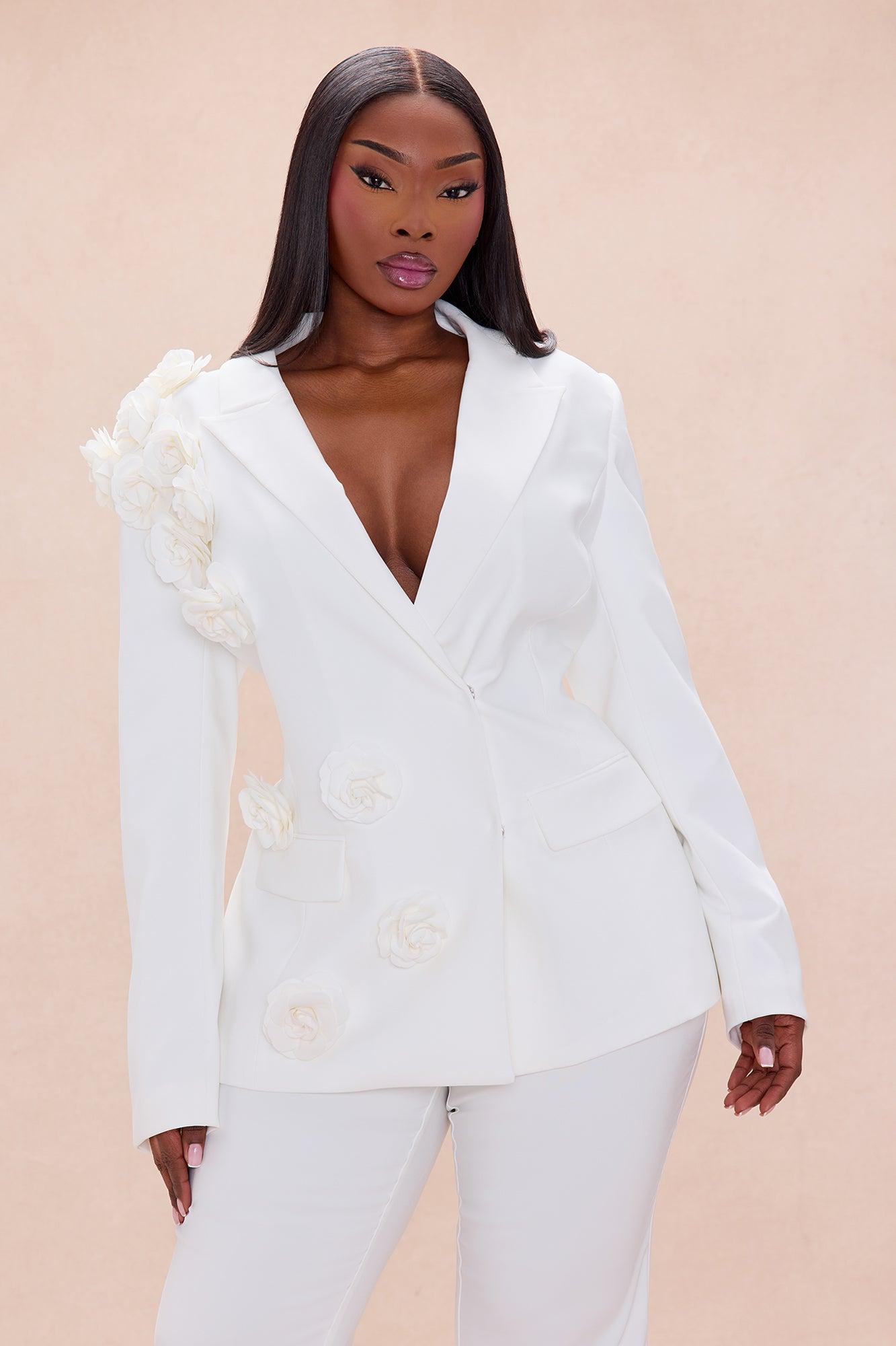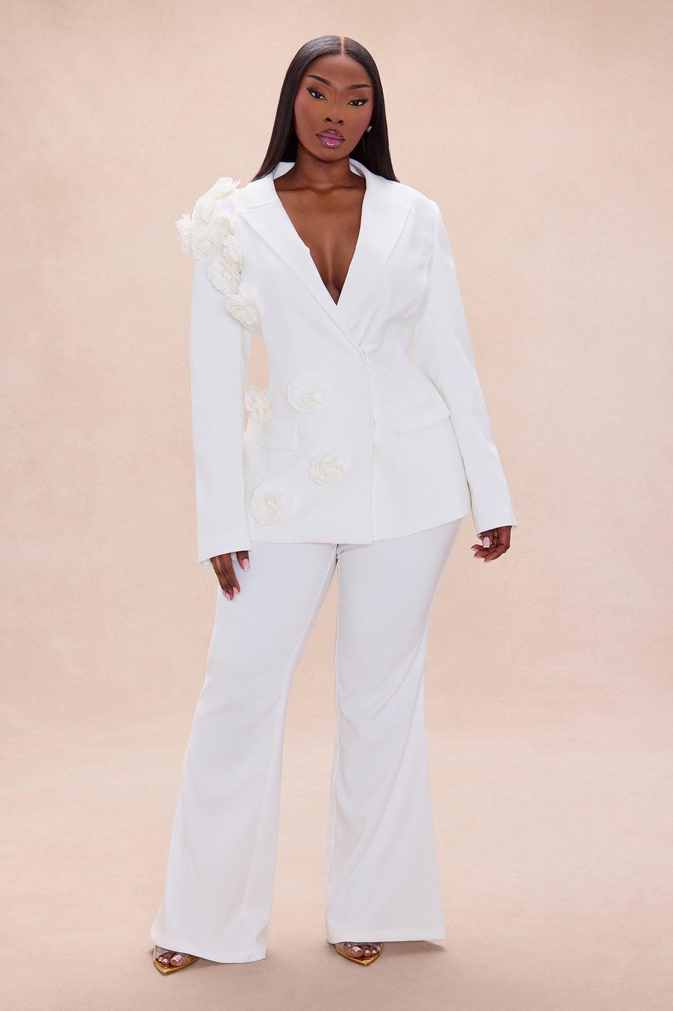 Available In Hot Pink, Royal And White. Blazer Pant Ensemble Blazer Long Sleeve Shoulder Pads Collared 3D Floral Applique Faux Pockets Front Snap Button Closure Lined , Stretch , Pockets Pant Front Hook And Zipper Closure Shell: 96% Polyester 4% Spandex Lining: 95% Polyester 5% Spandex Imported