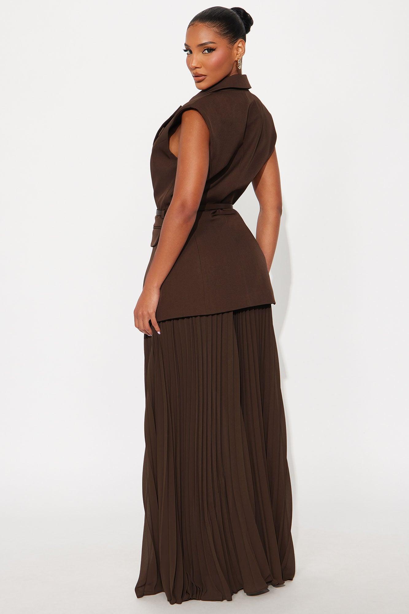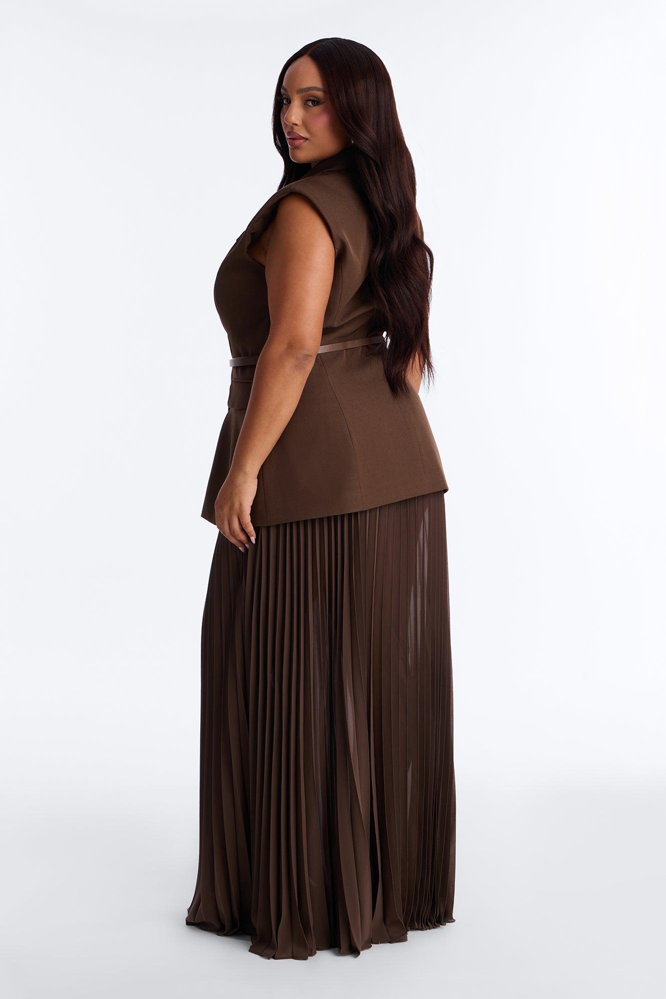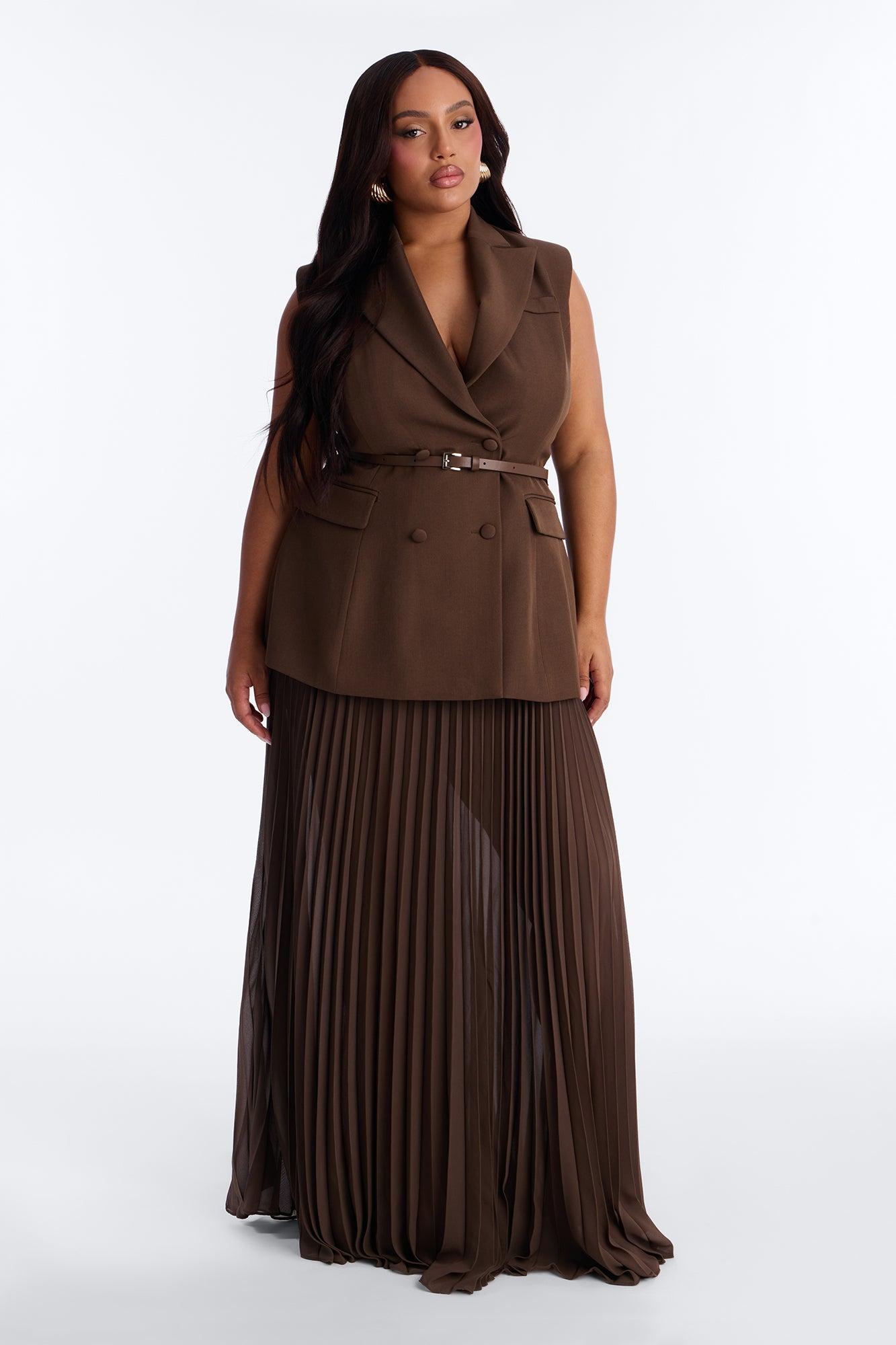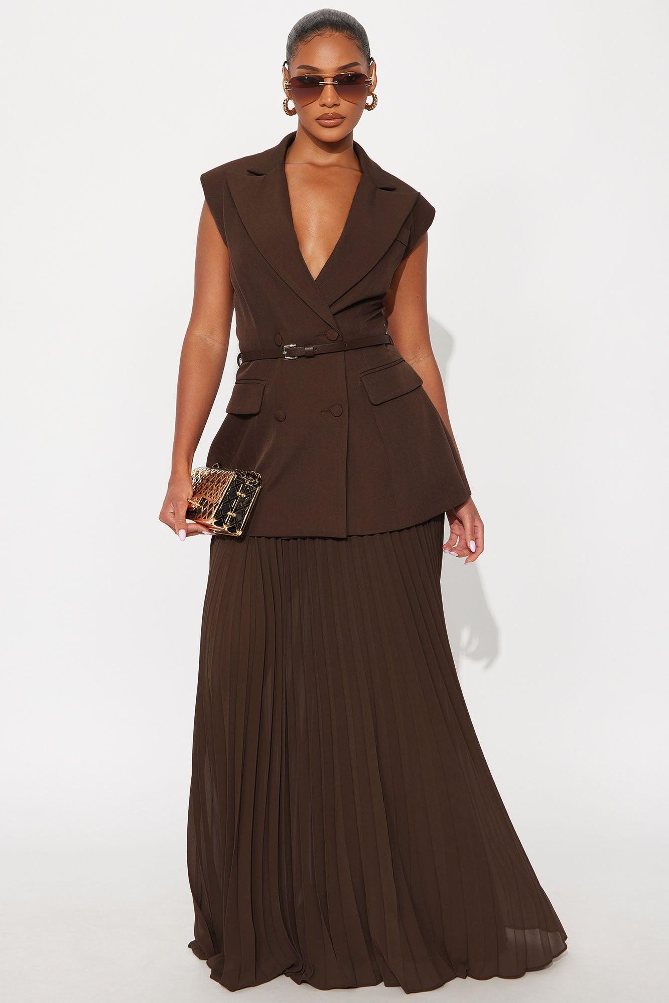 Available In Chocolate. 2 Piece Ensemble Blazer And Skirt Set Non Stretch Lined Belted Side Zipper Maxi Skirt Final Sale Self Top: 95% Polyester 5% Spandex Lining: 100% Polyester Bottom: 95% Polyester 5% Spandex Contrast: 97% Polyester 3% Spandex Lining: 100% Polyester Imported