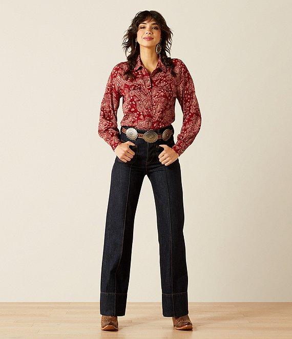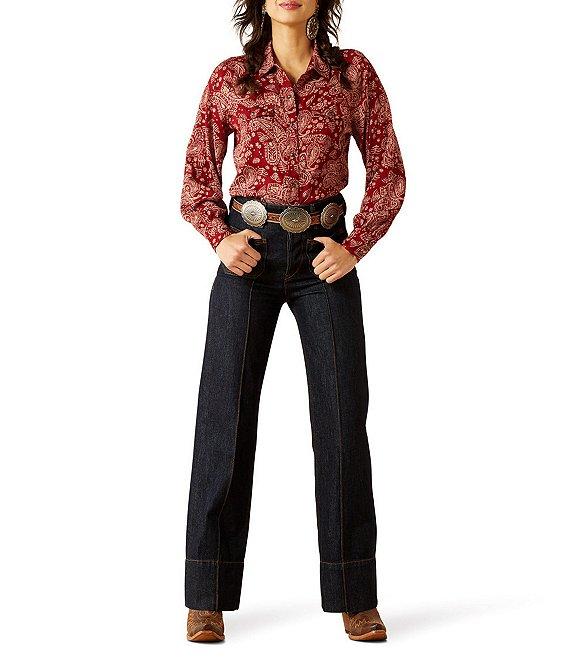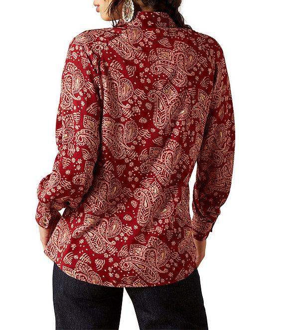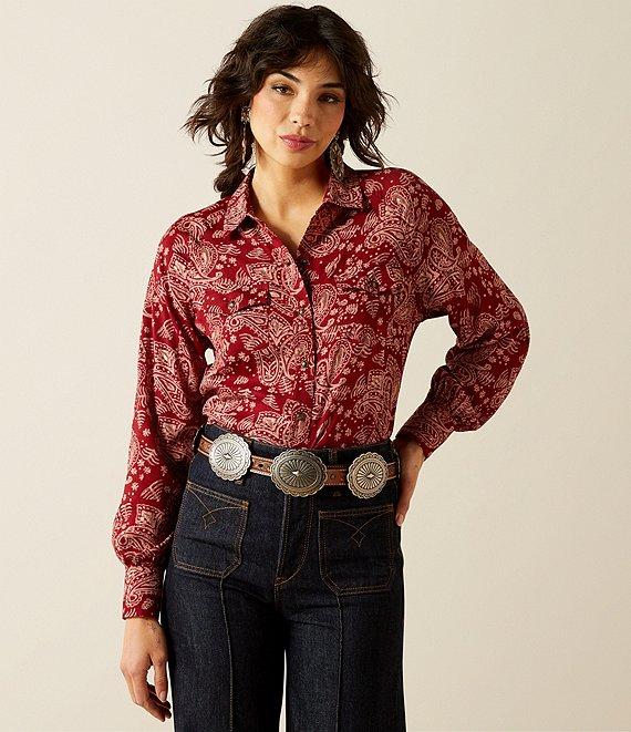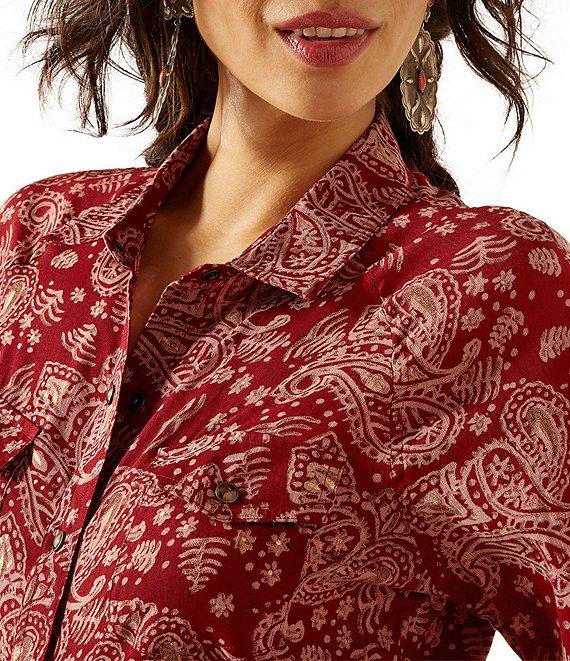 From Ariat, this blouse features: Point collar Long sleeves Gold-flecked paisley pattern Front chest pockets Onyx snaps Button front closure Viscose/polyester Machine wash/tumble dry Imported.
