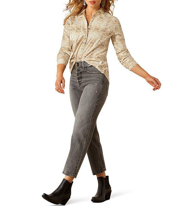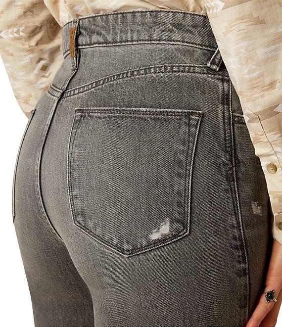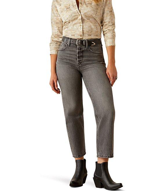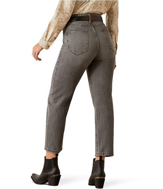 From Ariat, this jean features: Non-stretch denim fabrication Ultra high rise Straight leg with tapered fit Contoured waistband Front zipper and button closure Approx. 27" inseam, 16" leg opening, 12" rise Cotton/Lyocell Machine wash cold/line dry Imported.