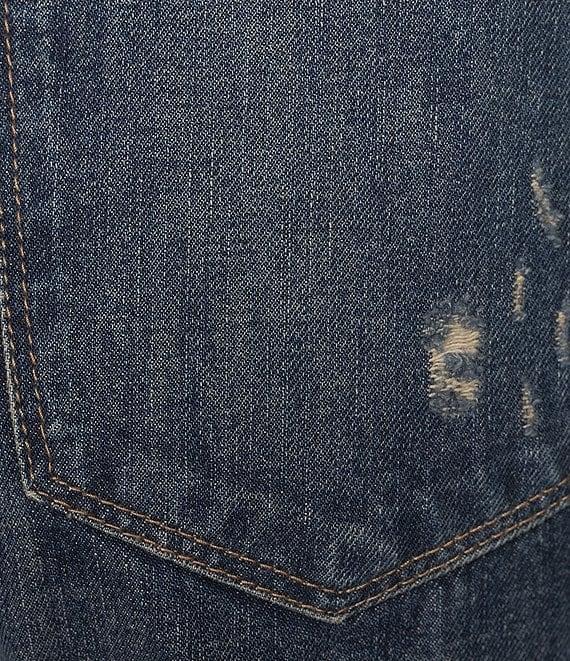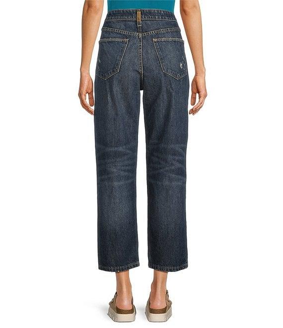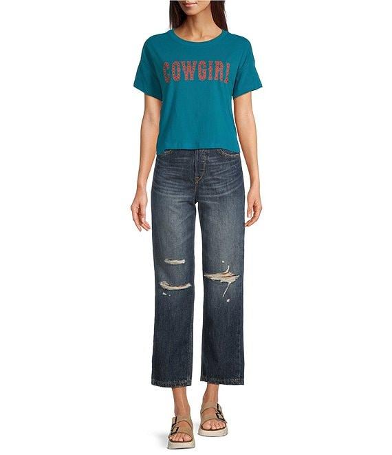 From Ariat, these jeans feature:Non stretch denim fabricationLightly distressed Straight crop legs12" ultra high riseContoured waistband5 pocket styleBelt loopsFront button and zipper closureApprox. 27" inseamCotton Machine wash cold/line dryImported.