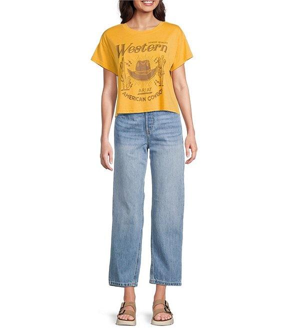 From Ariat, these jeans feature:Non stretch denim fabricationLightly distressedStraight crop legs12" ultra high riseContoured waistband5 pocket styleBelt loopsFront button and zipper closureApprox. 27" inseamCottonMachine wash cold/tumble dry mediumImported.