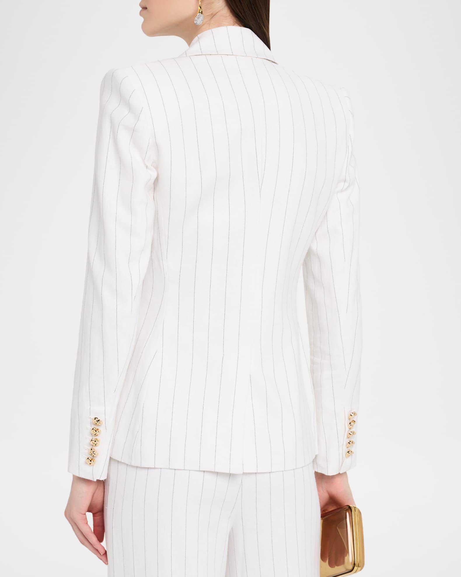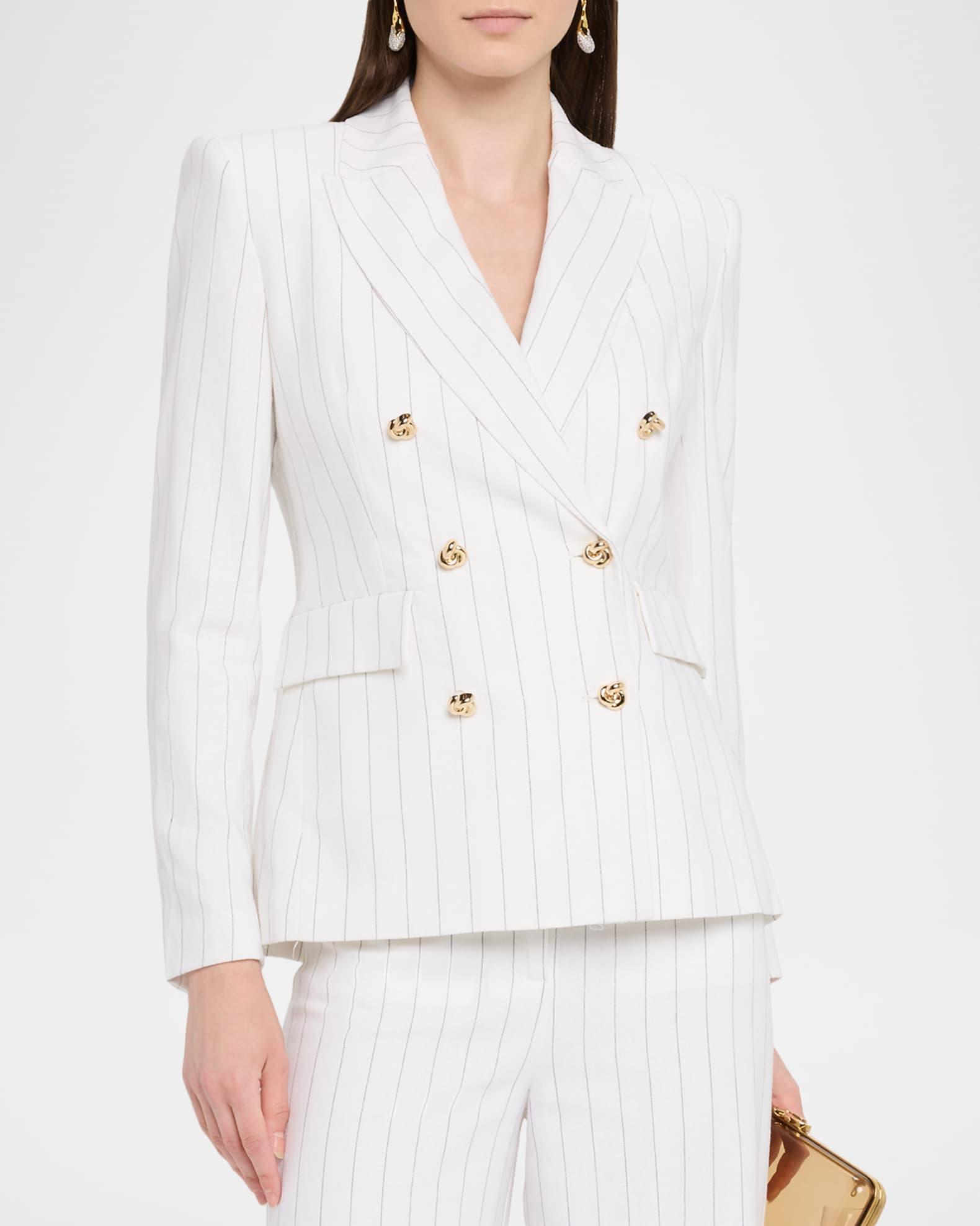 Generation Love "Arielle" pinstripe linen-blend blazer finished with gold-tone buttons Peak lapels Double-breasted front Structured shoulders Long sleeves with button cuffs Chest welt pocket Hip flap pockets Tailored fit Button-front Linen/rayon/cellulose acetate/elastane Hand wash or dry clean Imported