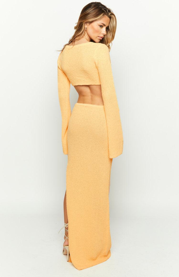Yellow Long Sleeve Maxi Dress How to style: Be vacation ready with our gorgeous long sleeve maxi dress. It's knit material is perfect for colder nights but also light enough for vacation. Style with heels and a mini shoulder bag for dinner or a waterfront dinner! Features: Maxi length Long sleeve style Unlined slightly sheer Waist and back cut out Flared sleeves Heavy weight knit material with stretch Side leg split Pull on design Knot detailing at waist