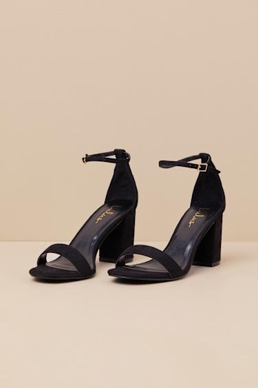 You're certain to step up your style essentials when you add the Lulus Arylee Black Suede Ankle Strap Heels to your closet! Soft faux suede shapes a single toe strap, an almond-shaped toe bed, and a wrapped block heel. A dainty ankle strap rises from the sturdy heel cup and secures with a gold buckle.