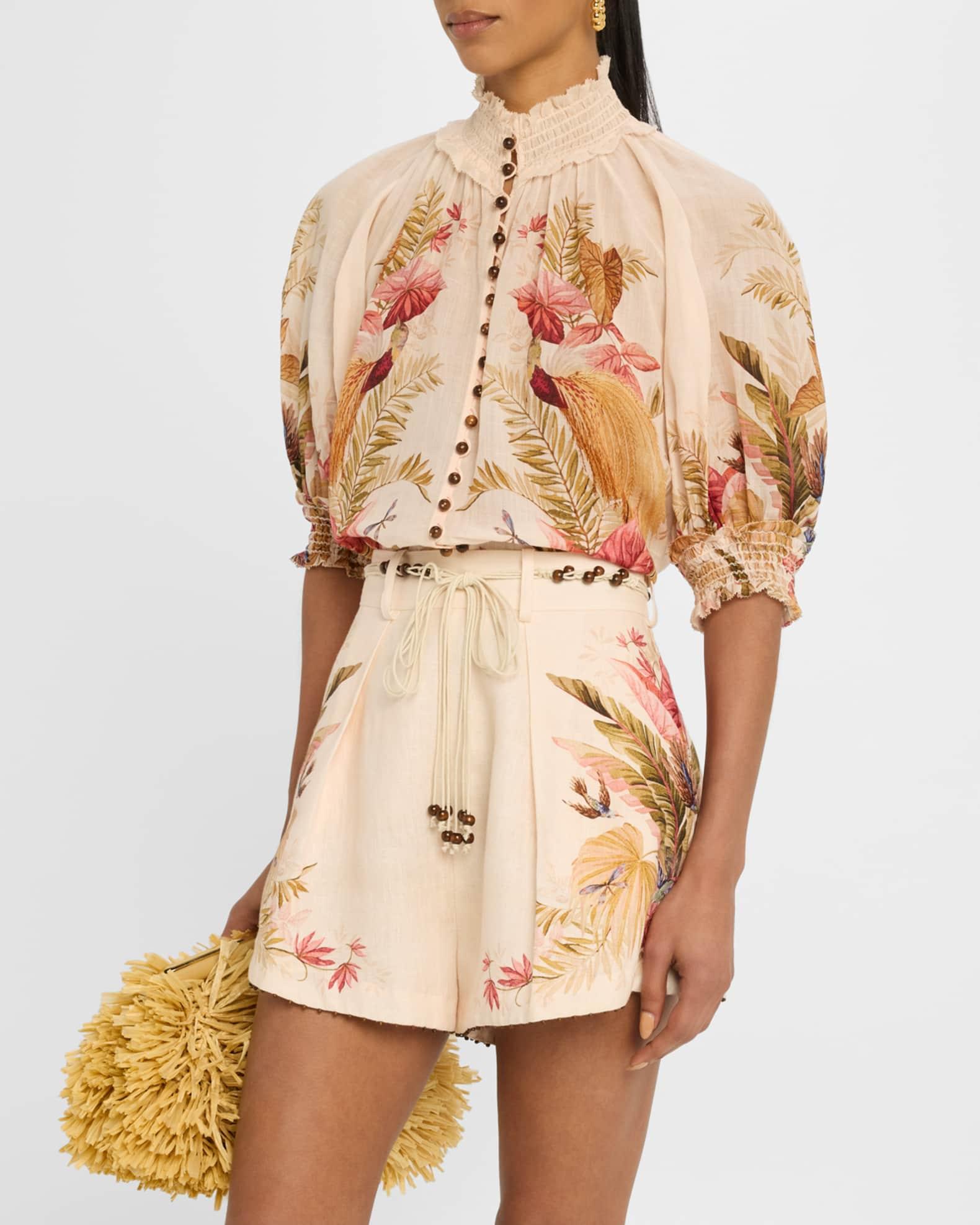 Zimmermann "Ascension" floral print ramie blouse Ruffled stand collar Short puff sleeves with smocked cuffs Loose fit Hem falls to the hip Button-front Ramie Unlined Dry clean Imported Size conversion: 0 = X-Small, 1 = Small, 2 = Medium, 3 = Large