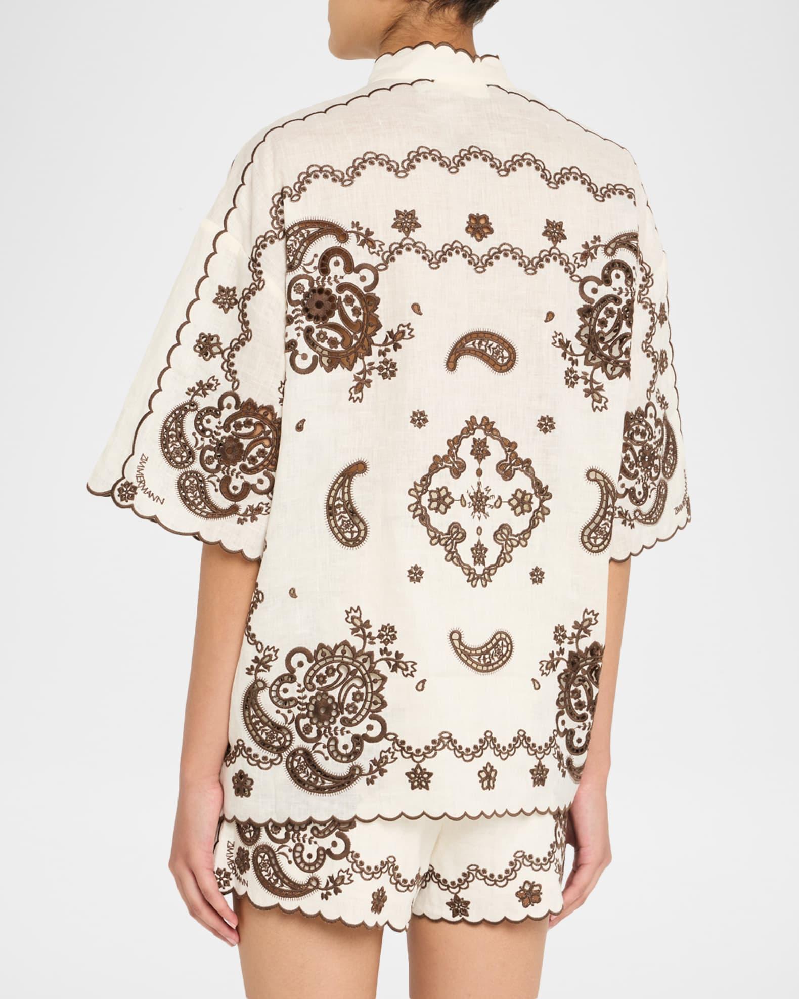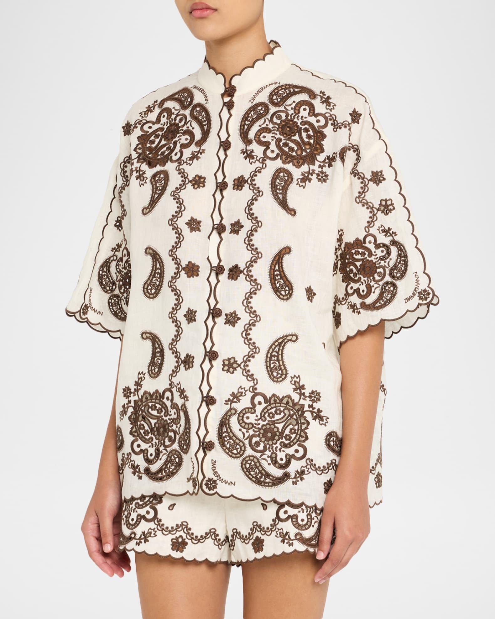 Zimmermann "Ascension" embroidered linen shirts finished with scalloped trim and crochet buttons Stand collar Short sleeves Loose fit Hem falls to the hip Button-front Linen Dry clean Imported Size conversion: 0 = X-Small, 1 = Small, 2 = Medium, 3 = Large