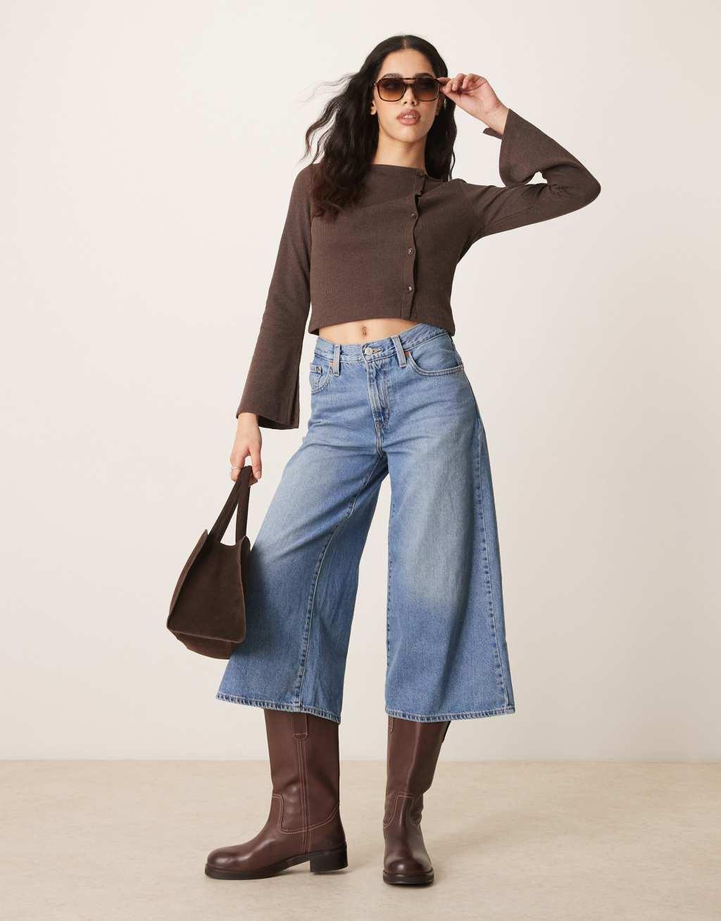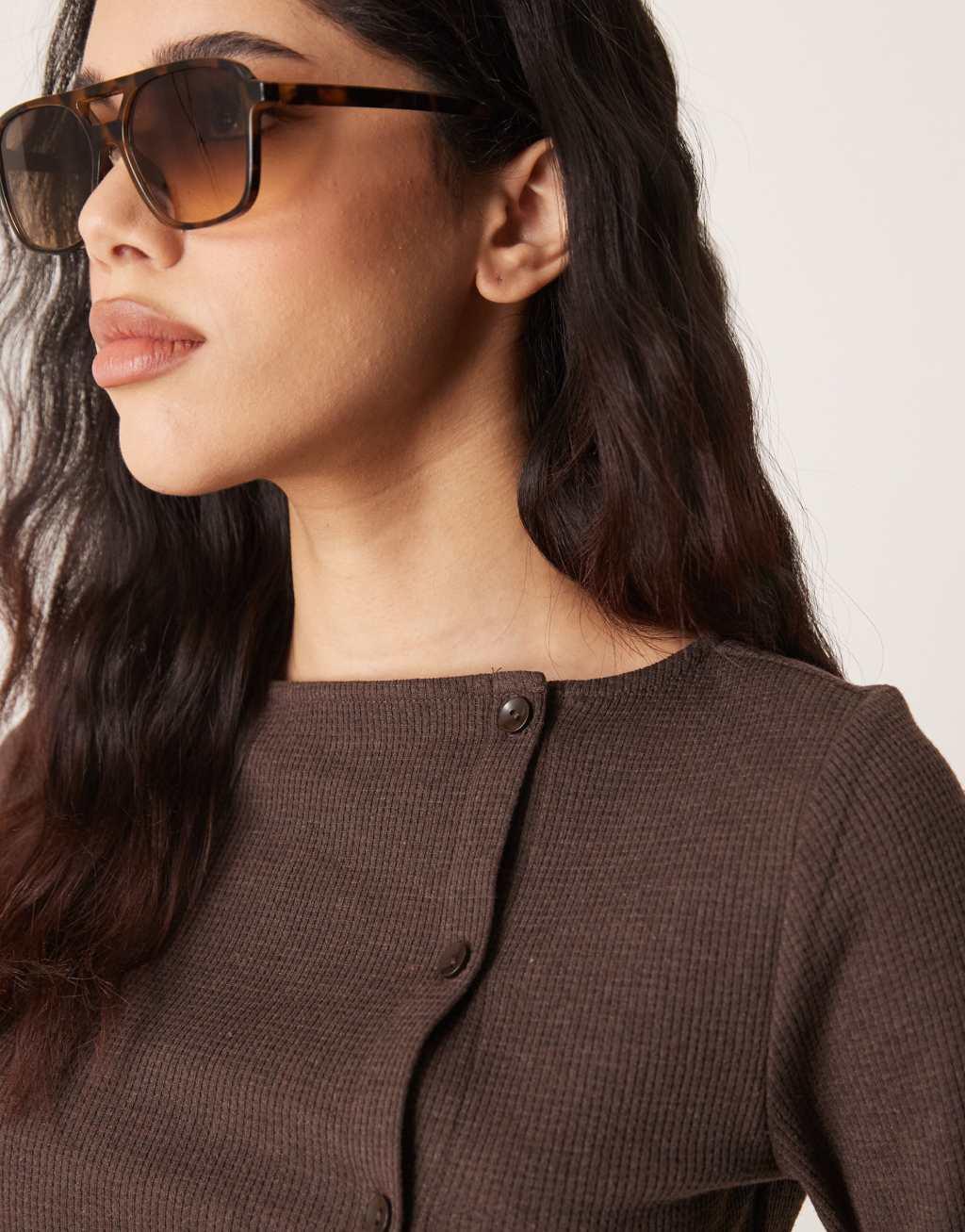 ASOS DESIGN button through flare sleeve waffle top in brown
