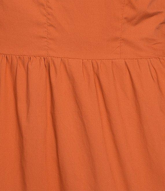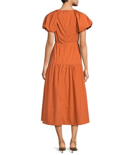 From ASTR the Label, this dress features: Poplin fabrication Crew neckline Short puff sleeves Invisible zip closure Tie-front with key hole detail Side pockets Side slit detail Tiered skirt Fully lined Approx. 50.5" length Cotton Lining: rayon Dry clean Imported.