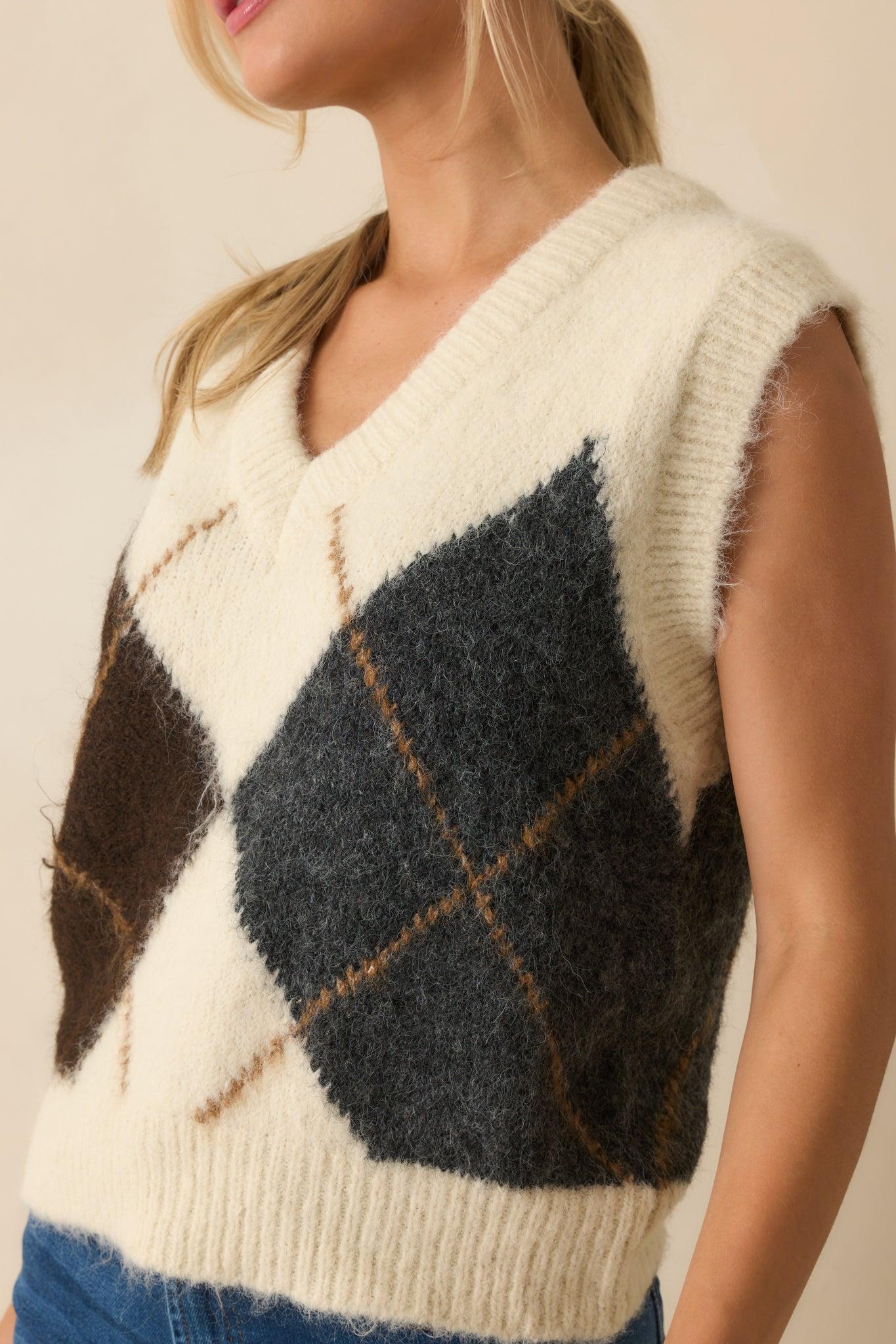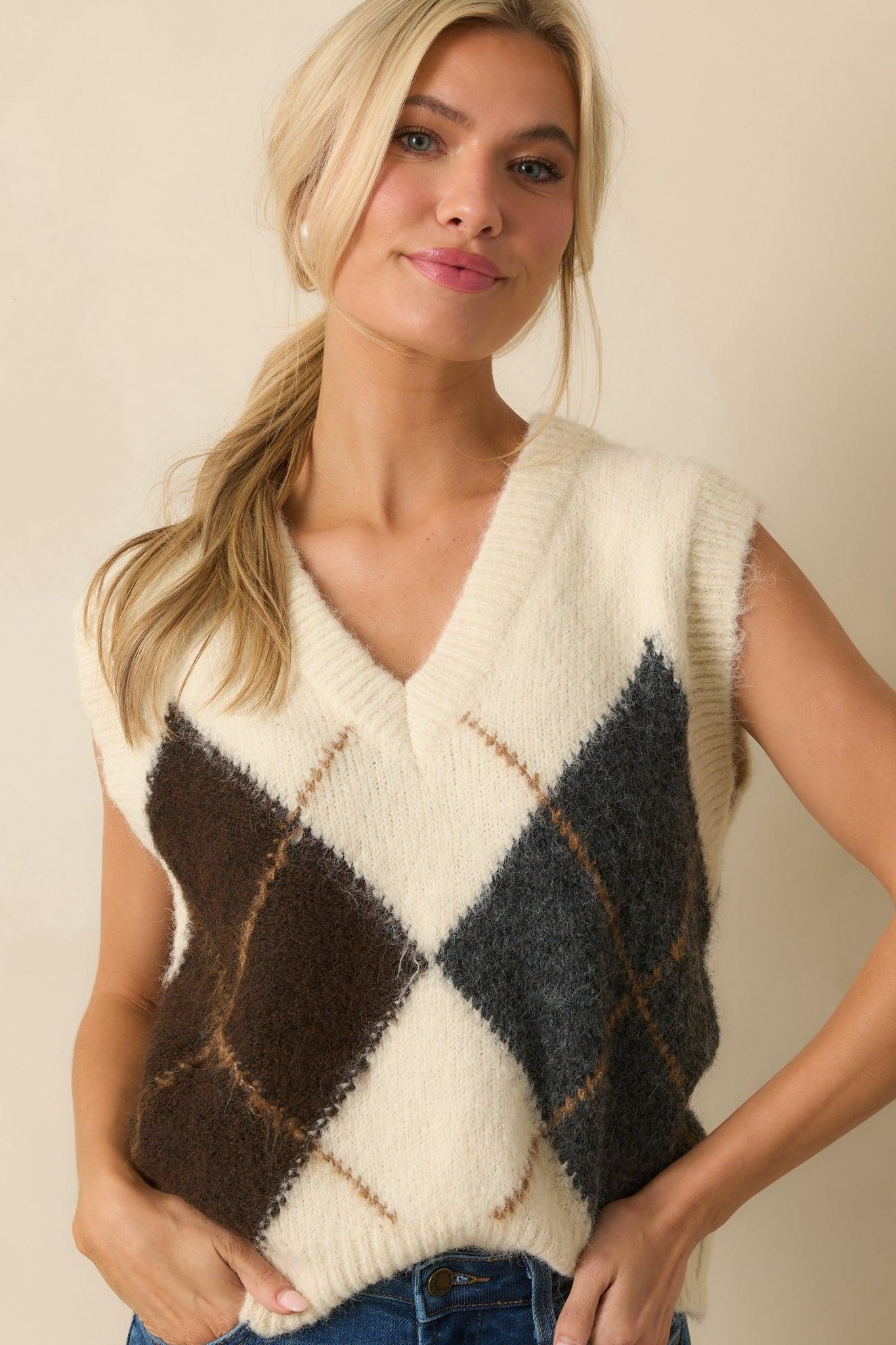 The At The Right Time Ivory Argyle V-Neck Sweater Vest brings a polished, preppy touch to your look, giving you that classic-meets-chic vibe that always feels perfectly on point. This ivory sweater fest features a large brown and grey argyle pattern, a v-neckline, sleeveless, lightweight knit fabric, and ribbed hems. 68% Polyester, 22% Nylon, 8% Wool. & 2% Spandex Unlined Hand Wash Cold Manufactured in China Designed in The USA Model is 5'6" and is Wearing a Size Small