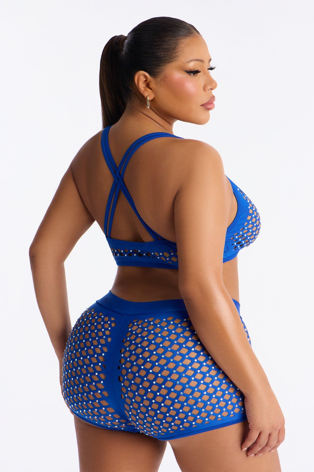 Available In Blue. 2 PC Fishnet Dance Set Adjustable Straps Rhinestone Cut Out Detail Unlined Criss Cross Back Matching Short Bottoms Stretch Final Sale Self: 82% Polyester 18% Spandex Imported California Proposition 65WARNING: Cancer and Reproductive Harm - www.P65Warnings.ca.gov.