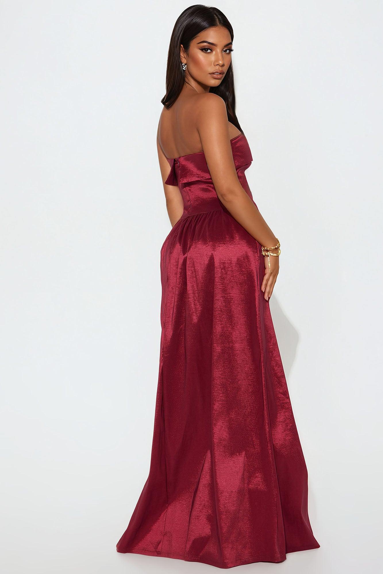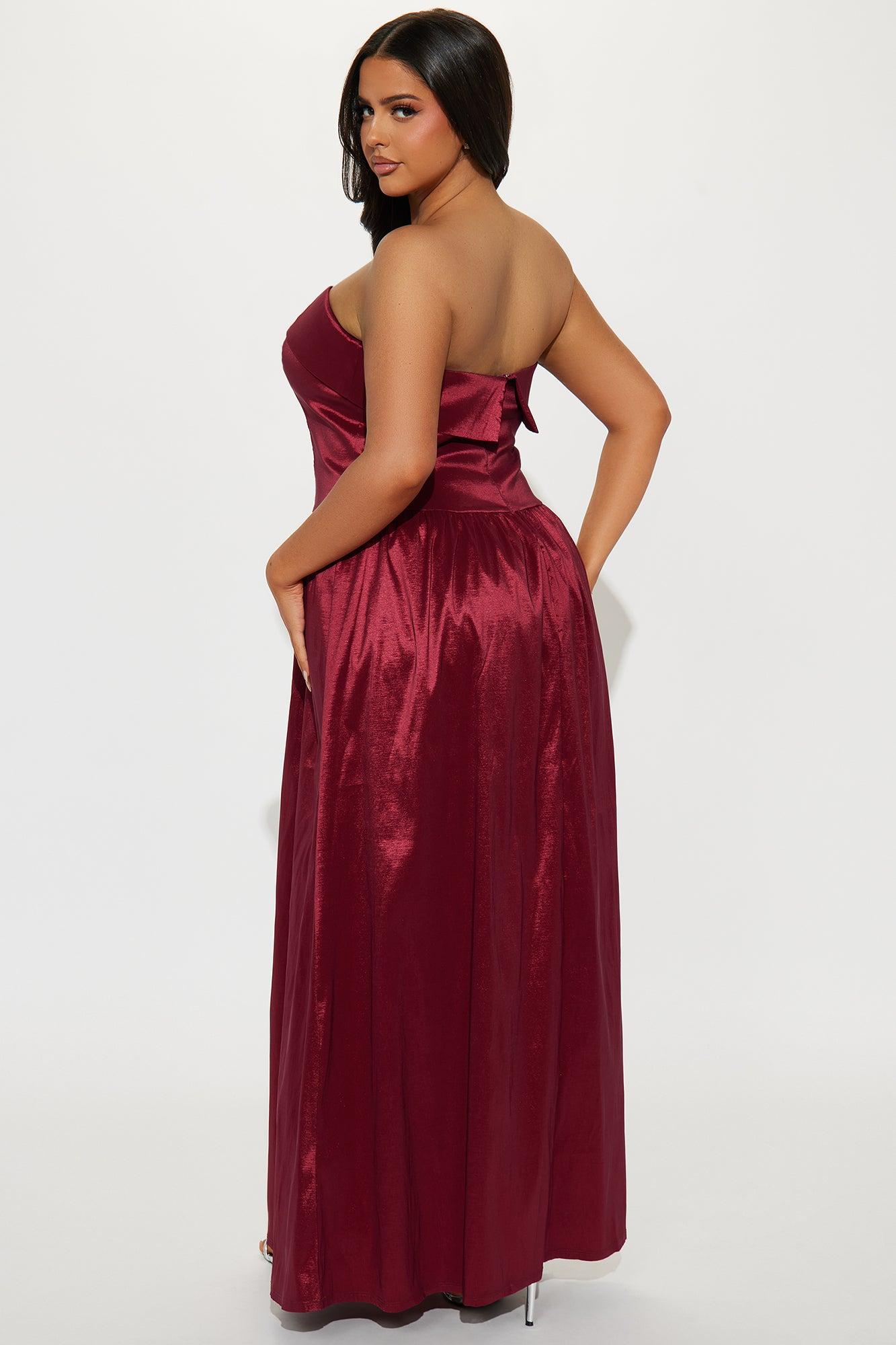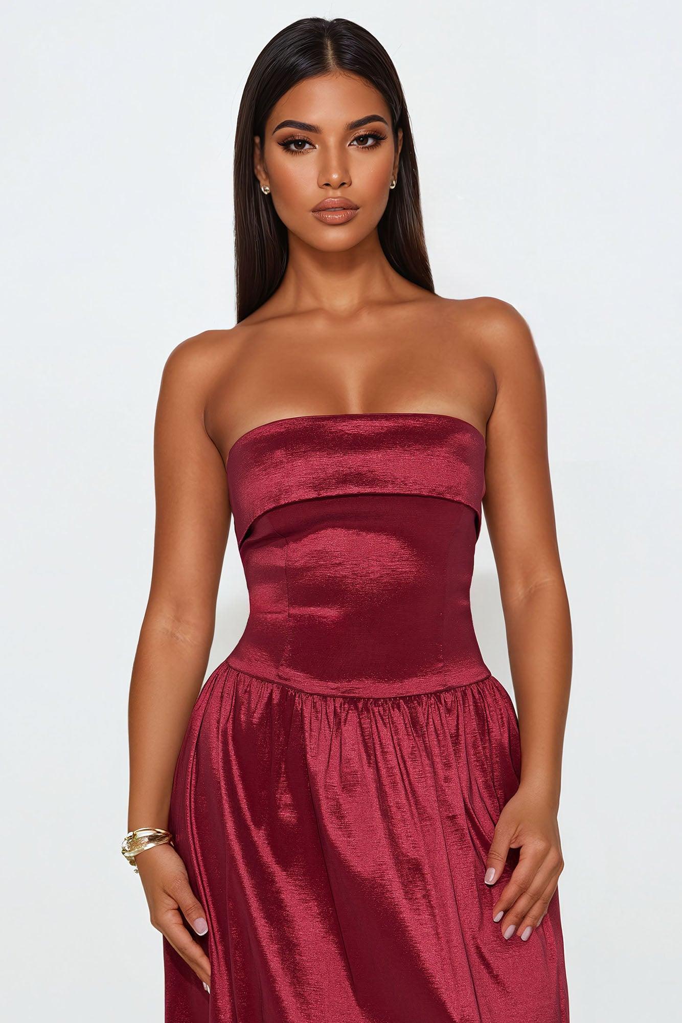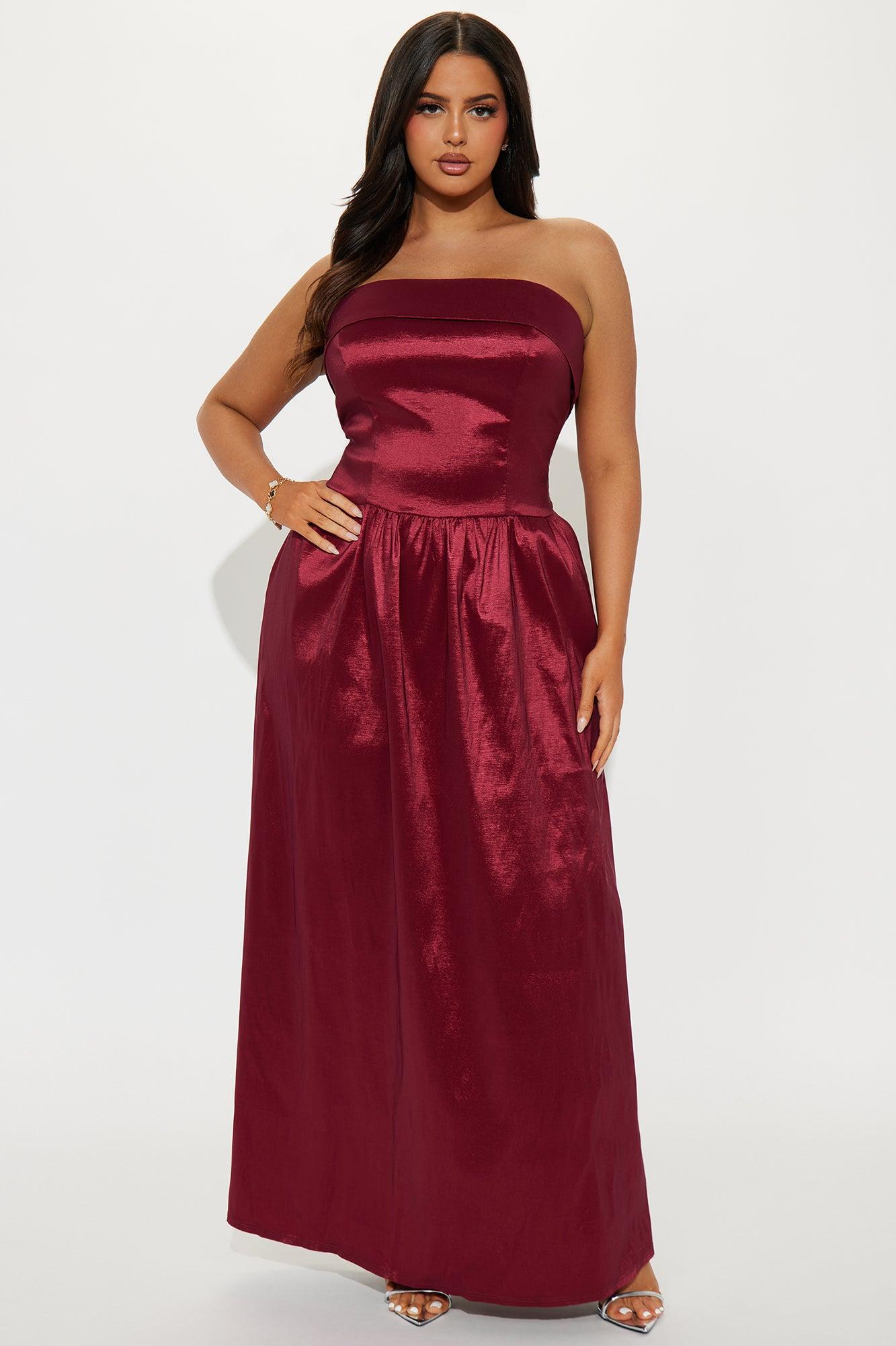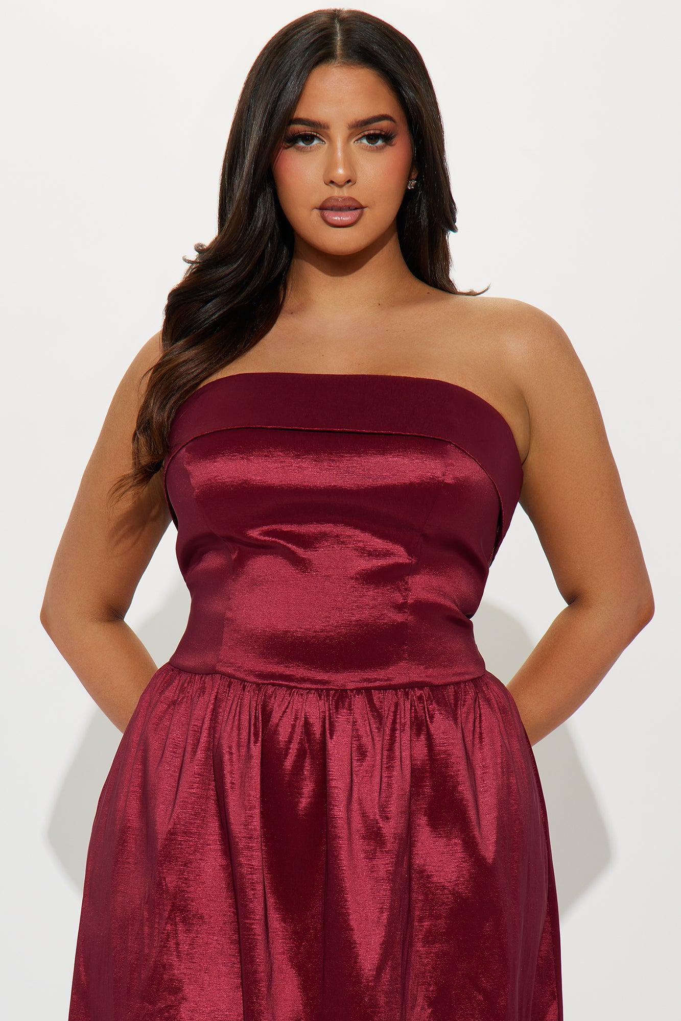 Available In Wine. Maxi Dress Strapless Foldover Neckline A Line Silhouette Pockets Hidden Back Zipper Stretch Self: 35% Nylon 60% Polyester 5% Spandex Lining: 100% Polyester Imported California Proposition 65 WARNING: Cancer and Reproductive Harm - www.P65Warnings.ca.gov.