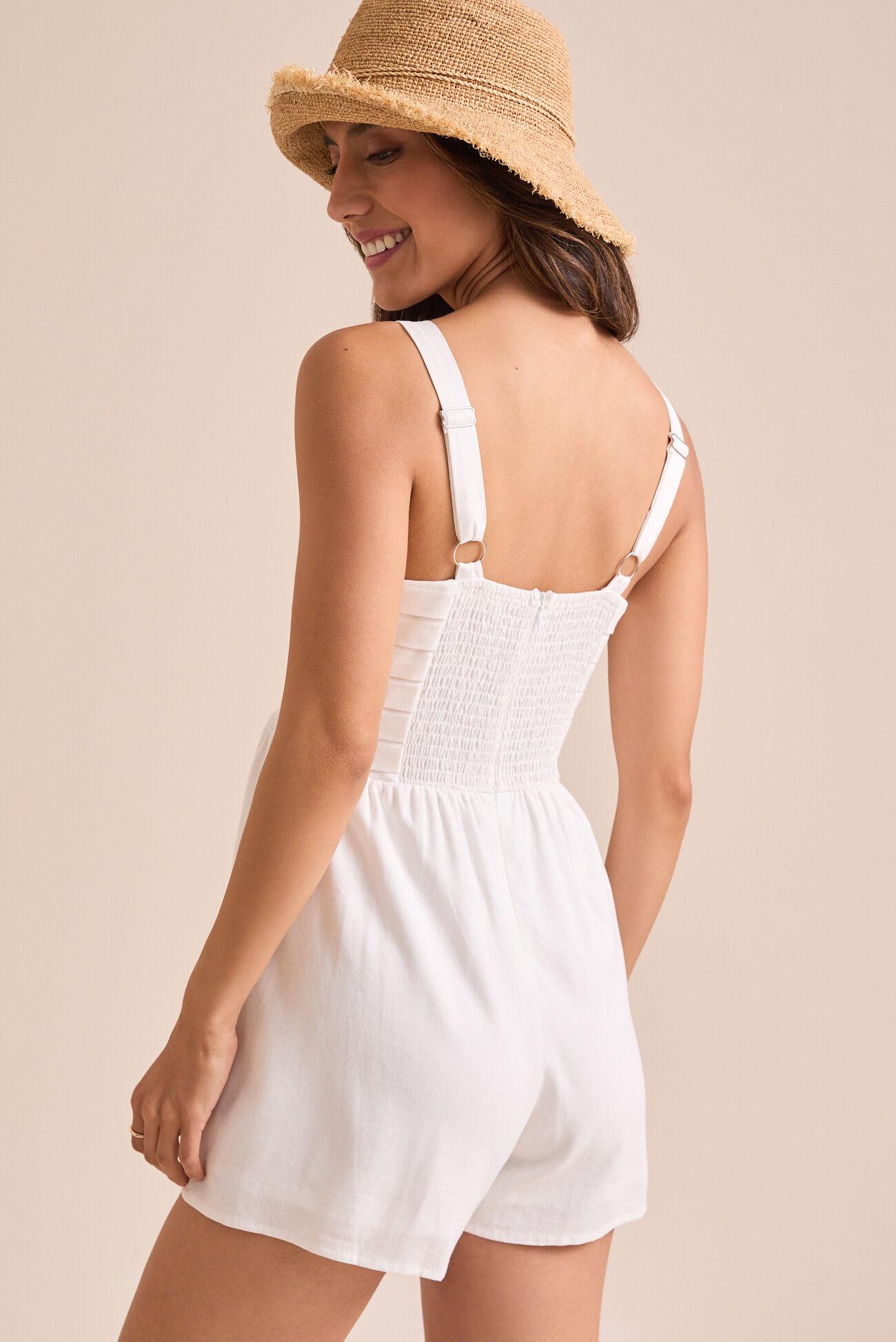 This stylish romper offers a chic take on casual wear. Featuring elegant pleats, a flattering smocked back for a perfect fit, and convenient built-in pockets, it's both fashionable and functional.