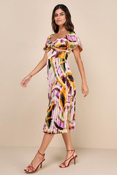 The Lulus Authentically Yours Cream Multi Abstract Print Satin Midi Dress will get you noticed at every soiree on your calendar! Pleated woven satin, with an abstract design throughout (in hues of ivory, purple, green, yellow, and black), shapes this eye-catching dress with a sweetheart neckline, framed by fluttery short sleeves (with elastic at the shoulders). The banded waist sits atop a twirl-worthy, A-line skirt that falls to a modern midi hem. A low V-back completes the chic look! Hidden back zipper/clasp.