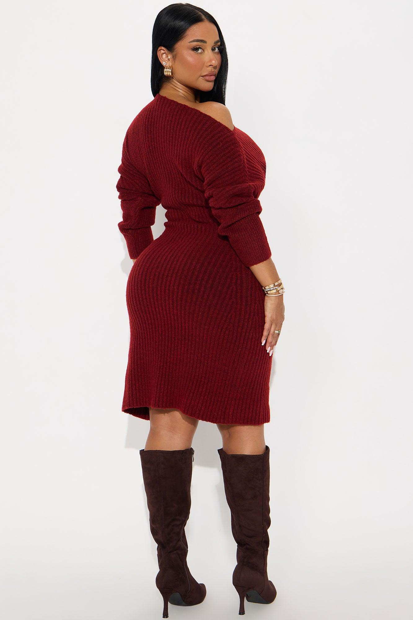 Autumn Leaves One Shoulder Sweater Midi Dress - Burgundy Female